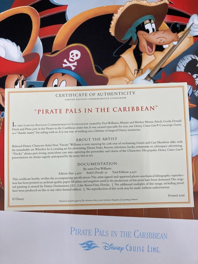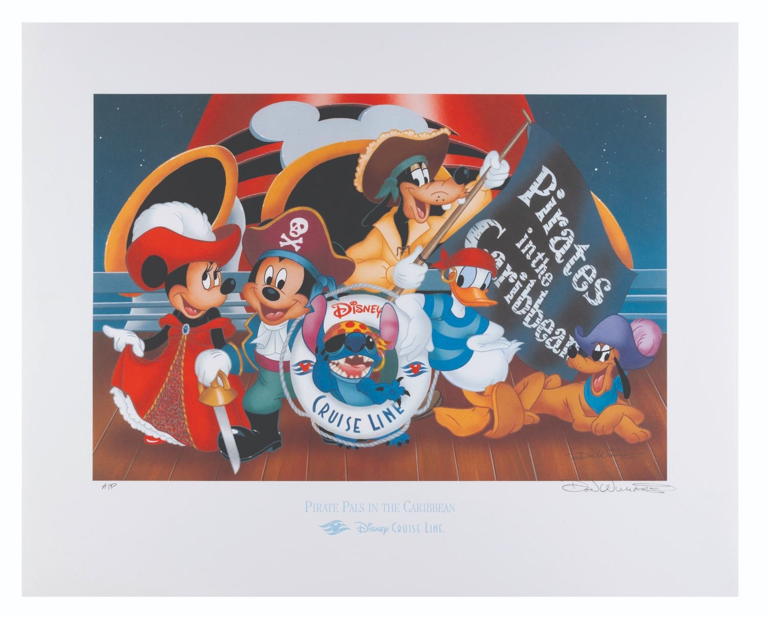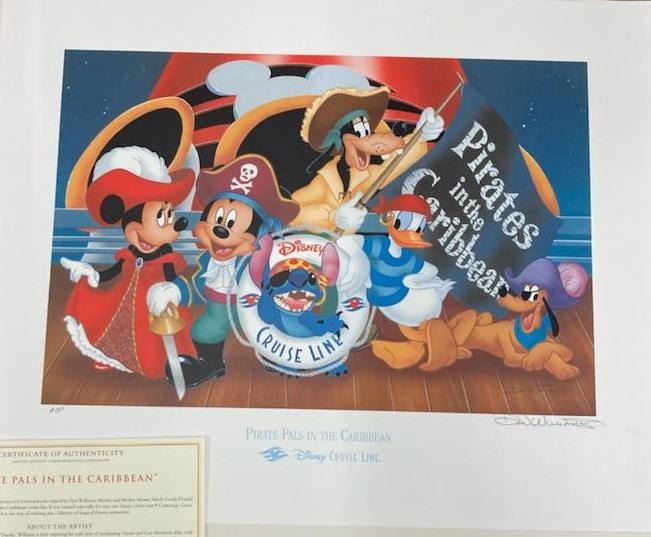 (Disney, 2006) A lithograph of Mickey and Friends as pirates. Titled"Pirate Pals in the Caribbean," the piece was created to commemorate a Disney Concierge Guest’s voyage in 2006. Released in a limited edition of 4,400 plus 50 Artist’s Proofs, this lithograph was signed in graphite by the artist Don Williams. With an image size of 10.75" x 16" on 16" x 20" paper, the art is in fine condition.