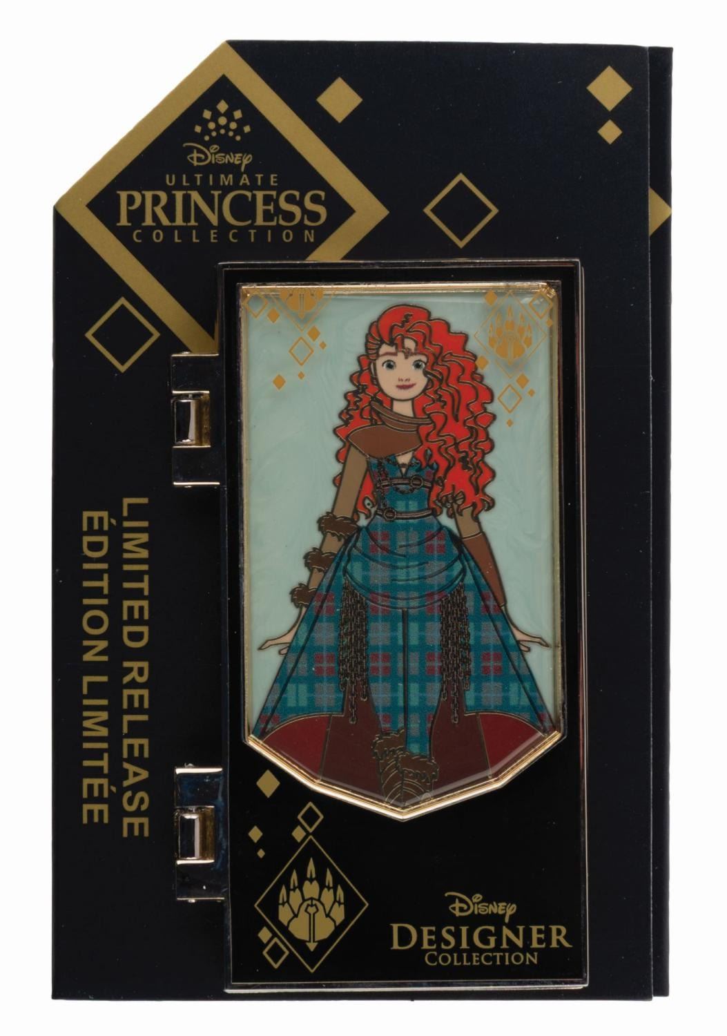 (Disney, 2022) A limited release pin inspired by the Disney Ultimate Princess Merida doll. The hinged front panel opens to reveal the full Merida inside, and the card highlights designer Wes Jenkins. Measuring 1.75 " x 3 " the pin is in fine condition on the original card.