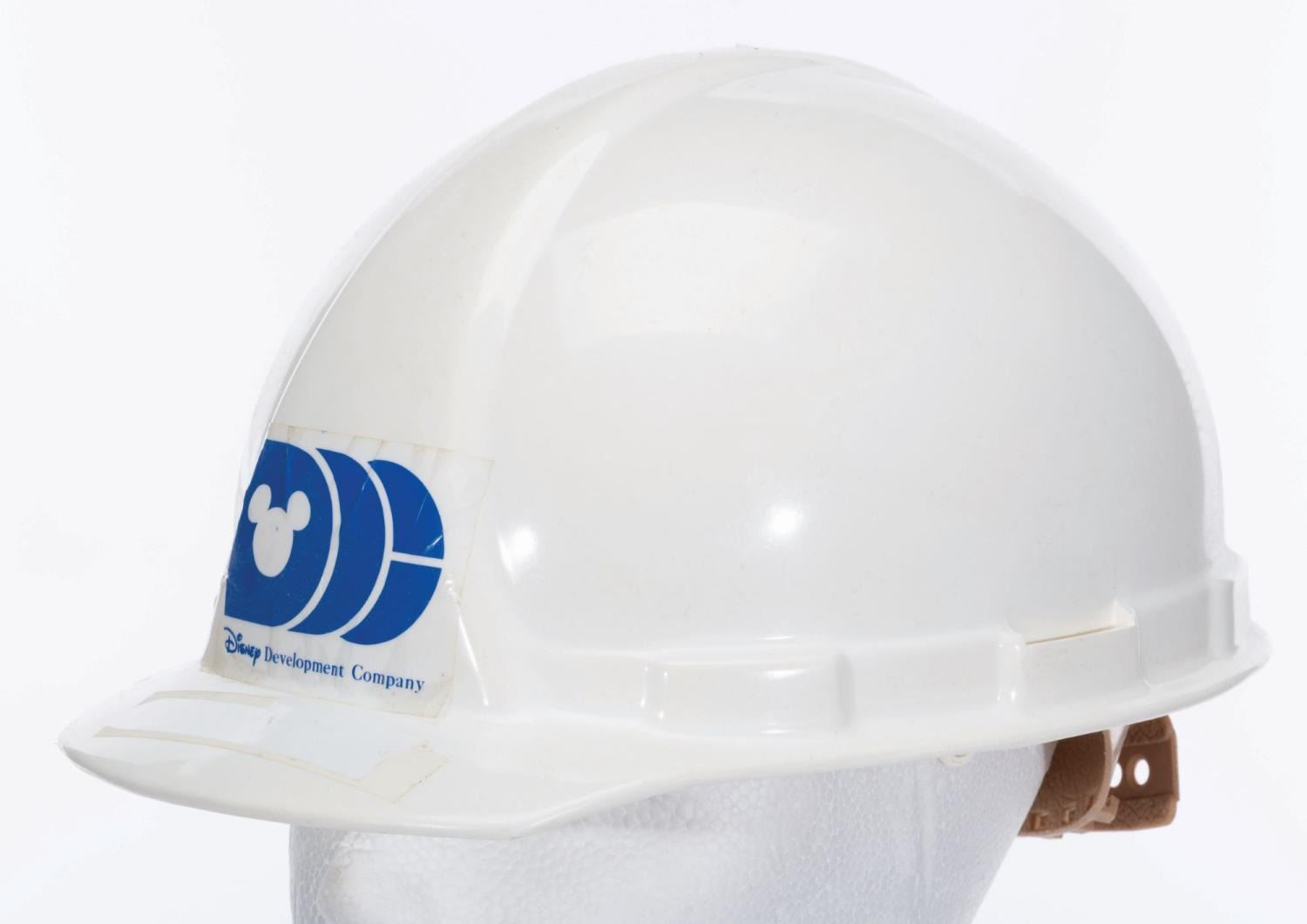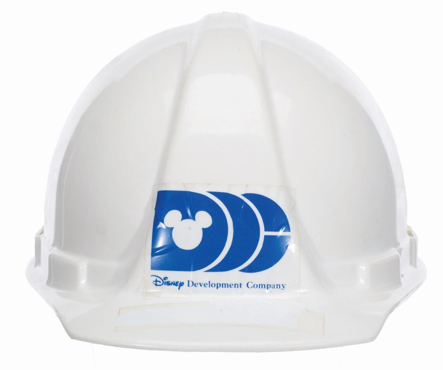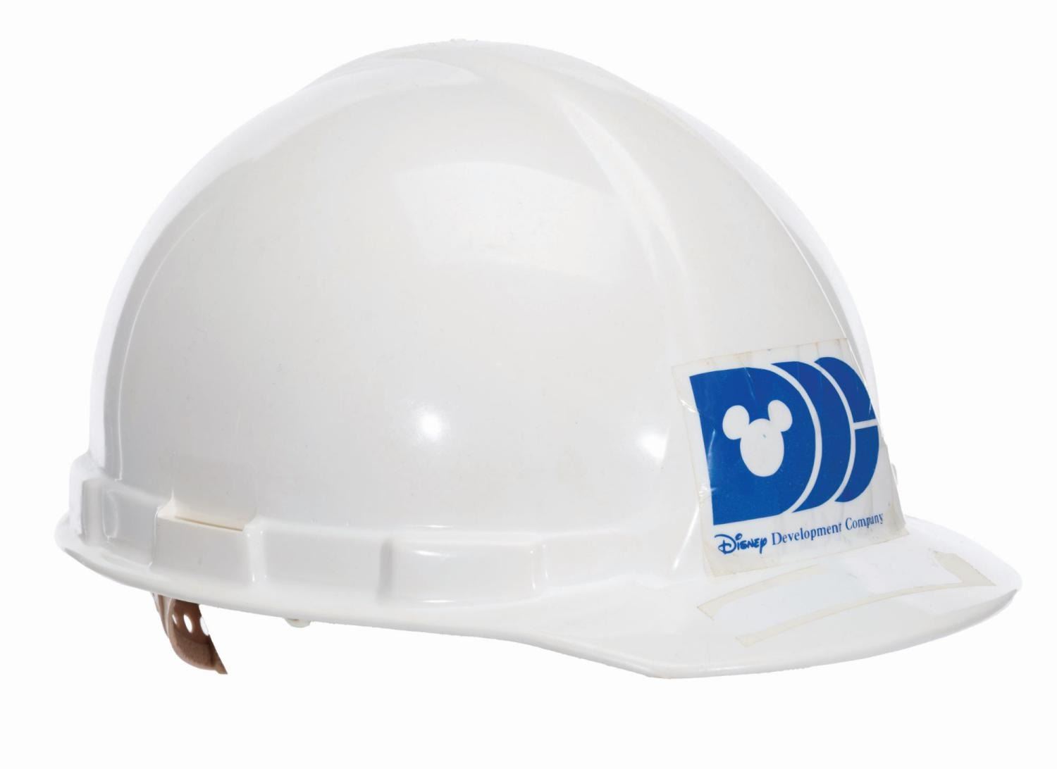 (Walt Disney World, 1980s-90s) A hard hat worn by construction workers for Disney Development Co., which handled Disney's non-theme park real estate. Unlabeled, the hard hat is in good condition with typical scratches and wear from use.
