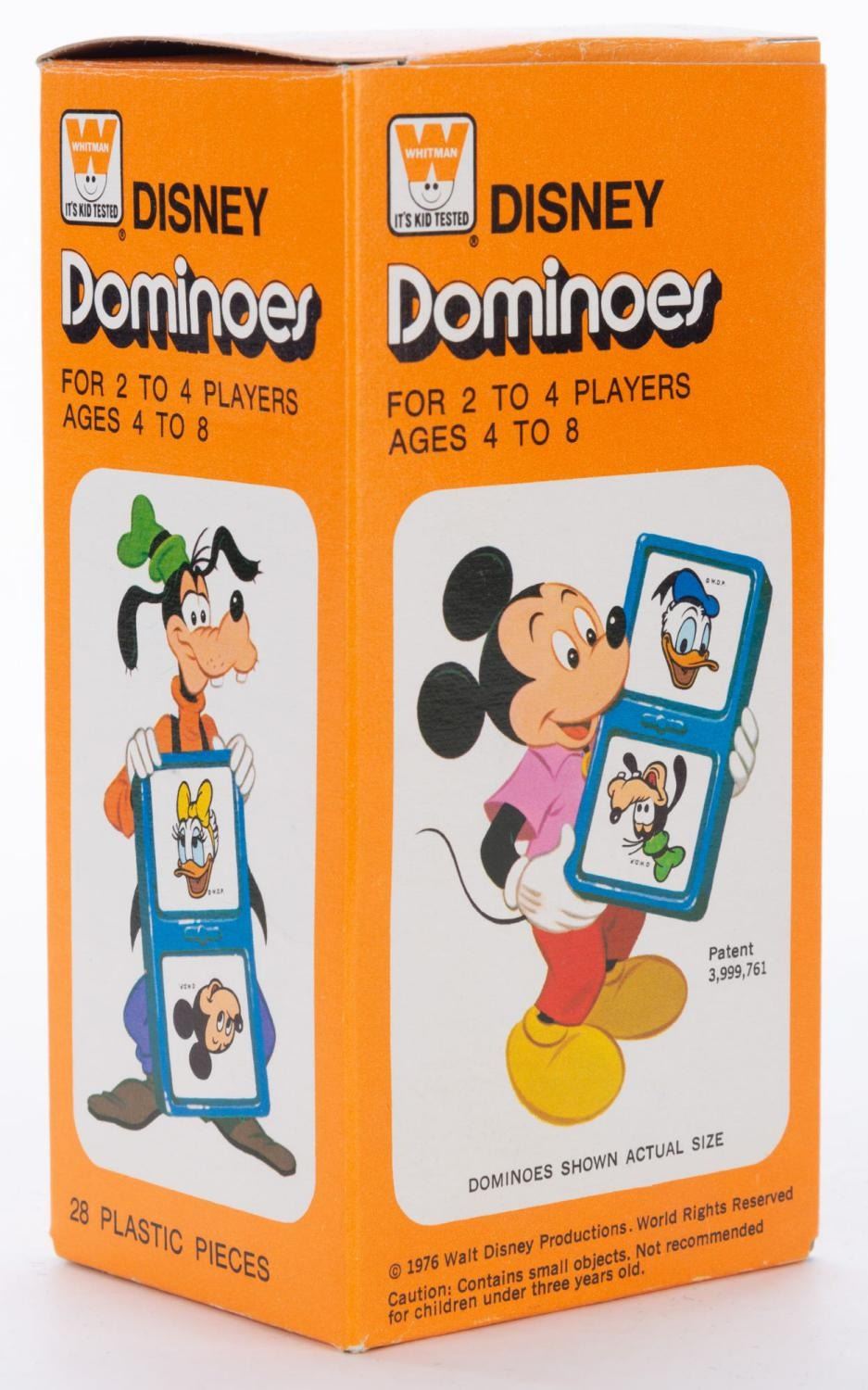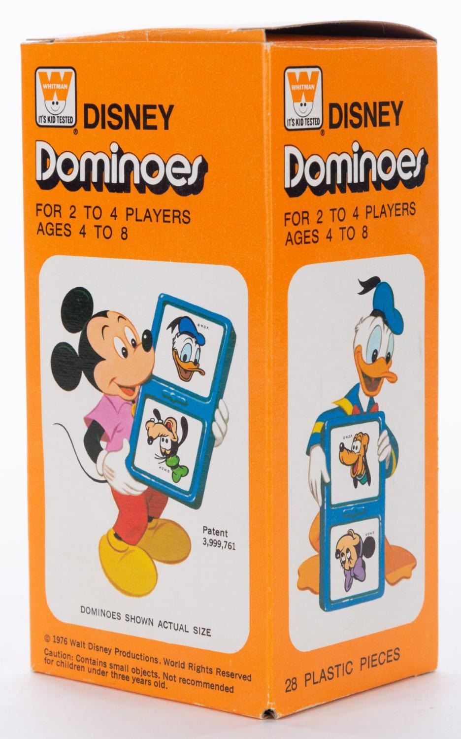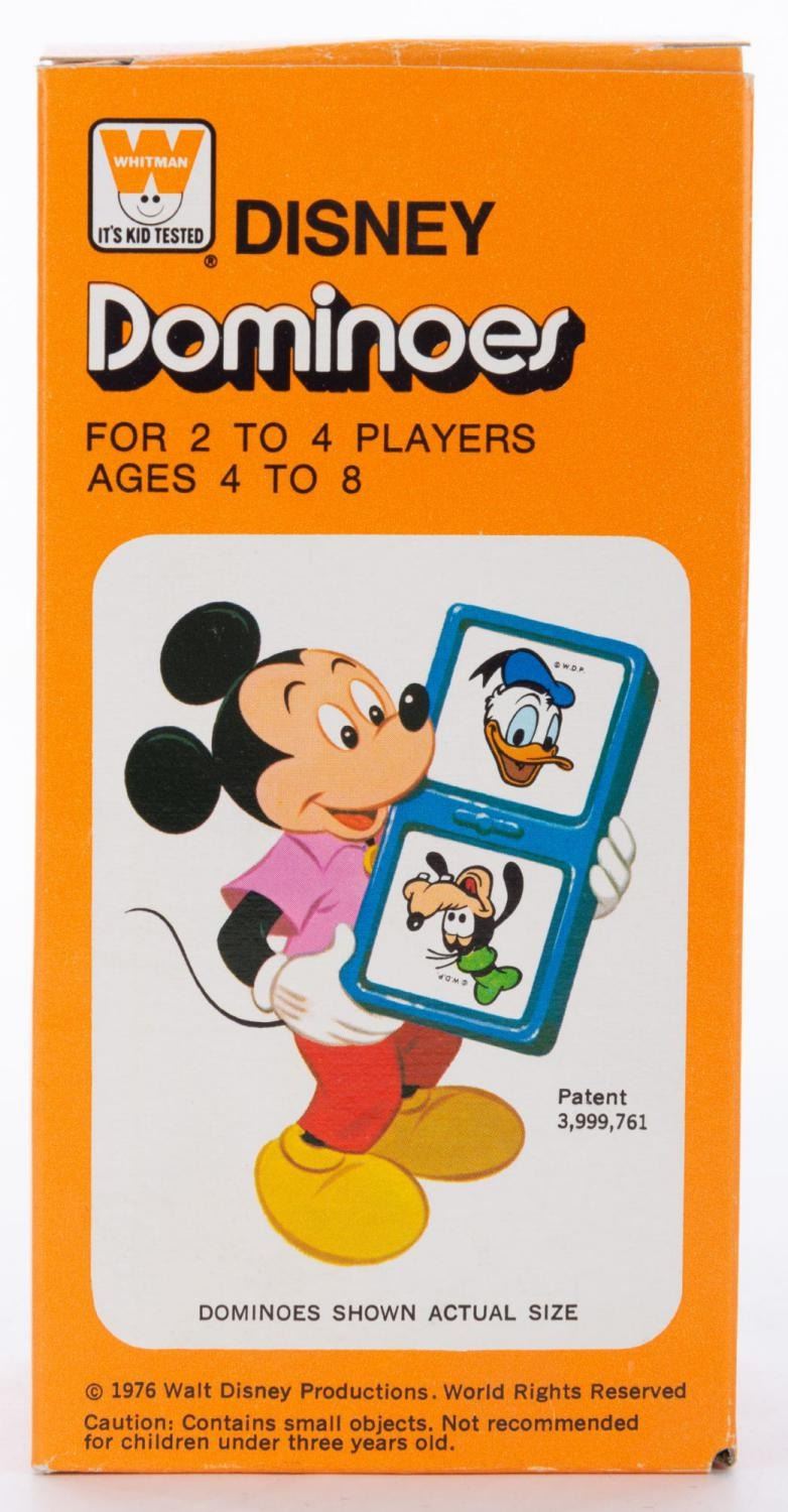 (Whitman, 1976) A complete set of Disney-themed Dominoes featuring Donald Duck, Mickey Mouse, Scrooge McDuck, and more. With the box measuring 3" x 6" x 2.5" thick, the set is in very good condition with minimal edge and corner wear to the box, and very light handling wear to the dominoes.