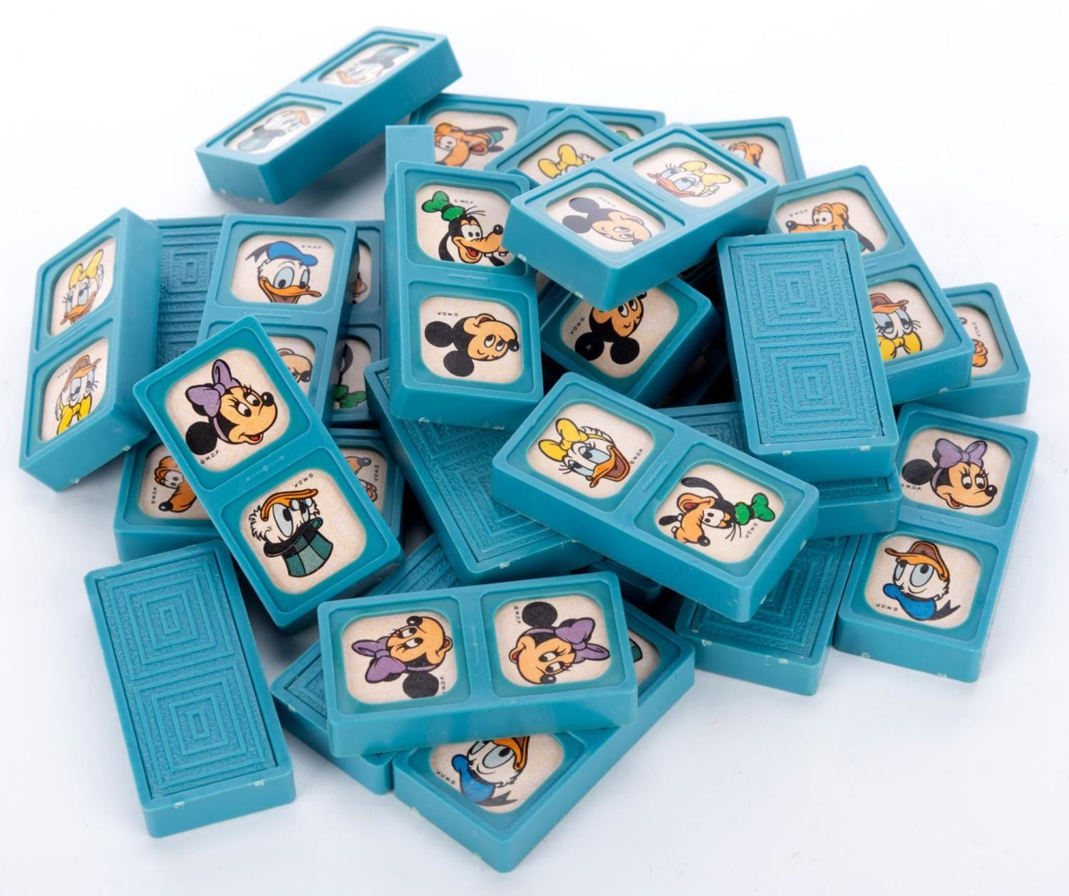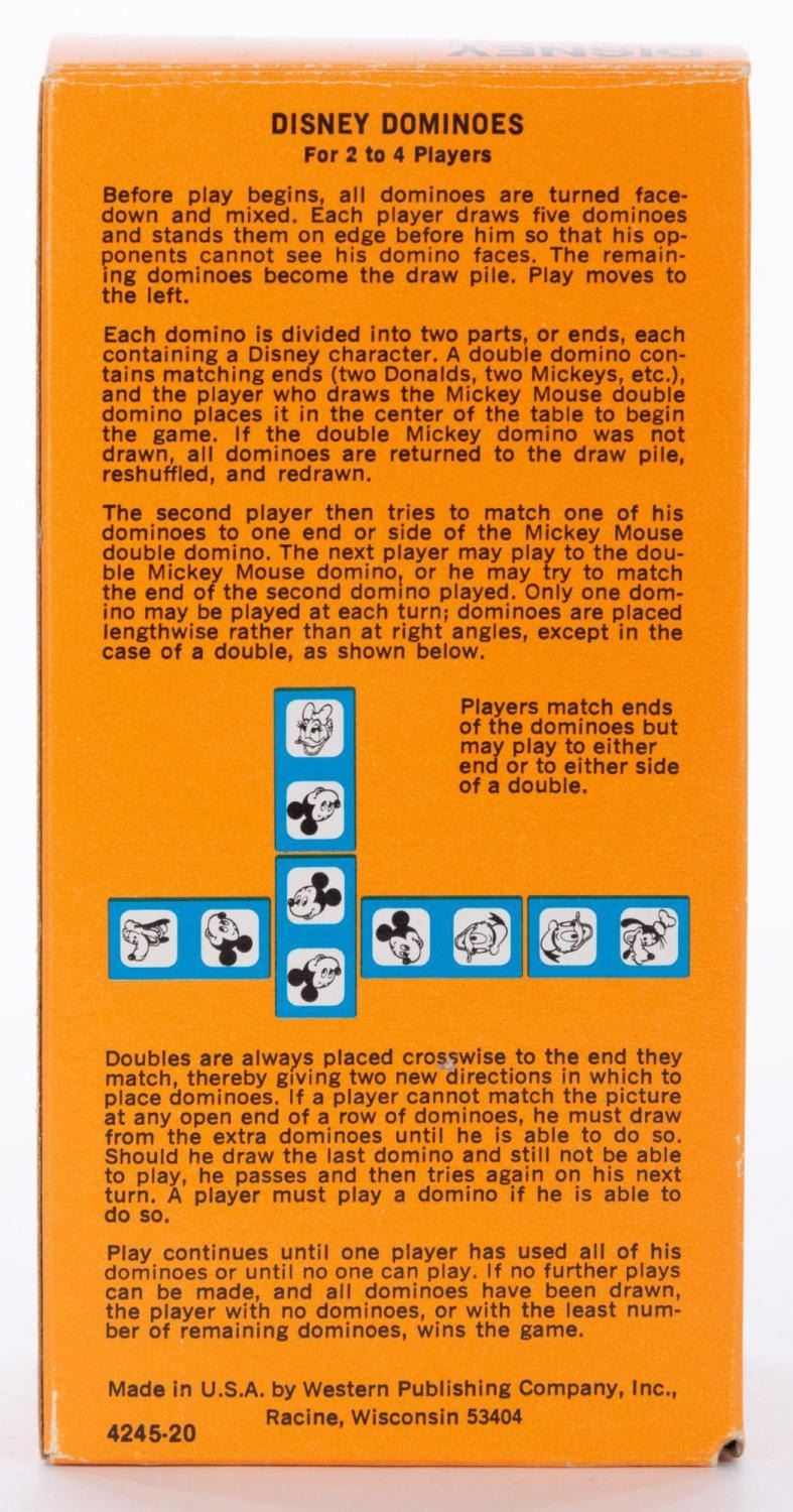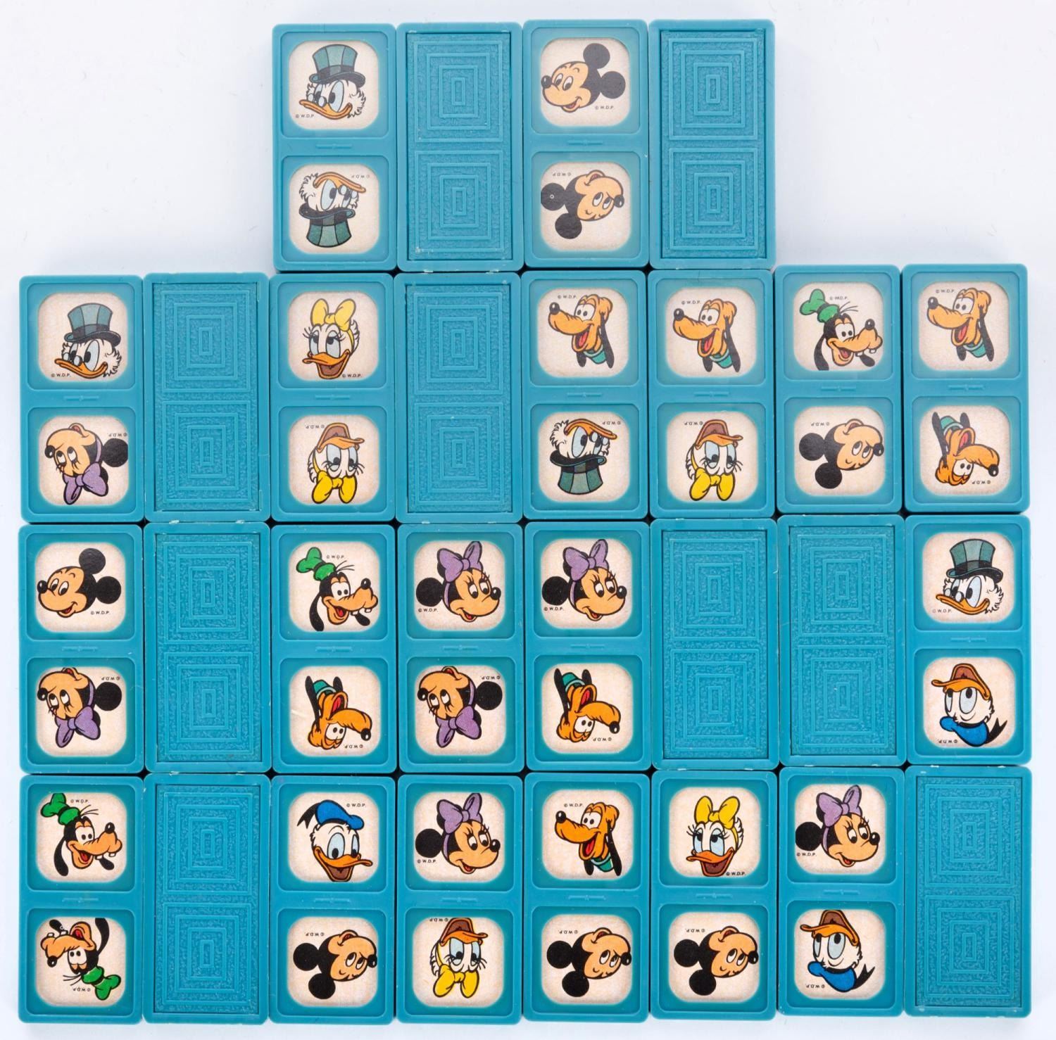 (Whitman, 1976) A complete set of Disney-themed Dominoes featuring Donald Duck, Mickey Mouse, Scrooge McDuck, and more. With the box measuring 3" x 6" x 2.5" thick, the set is in very good condition with minimal edge and corner wear to the box, and very light handling wear to the dominoes.