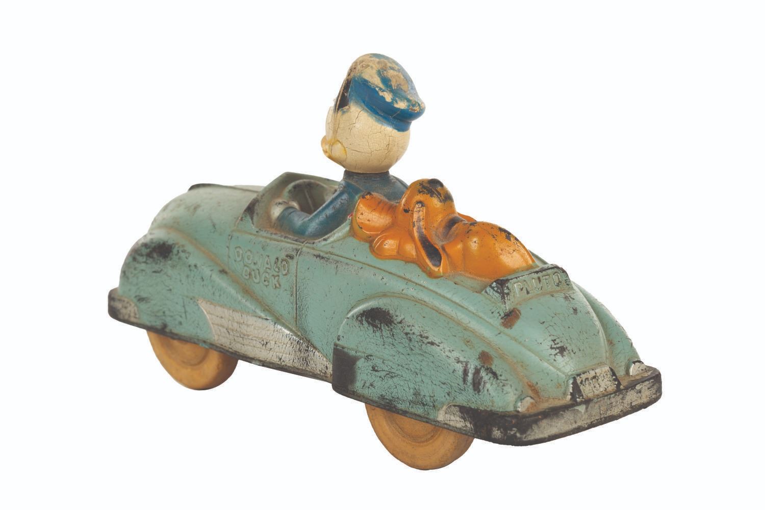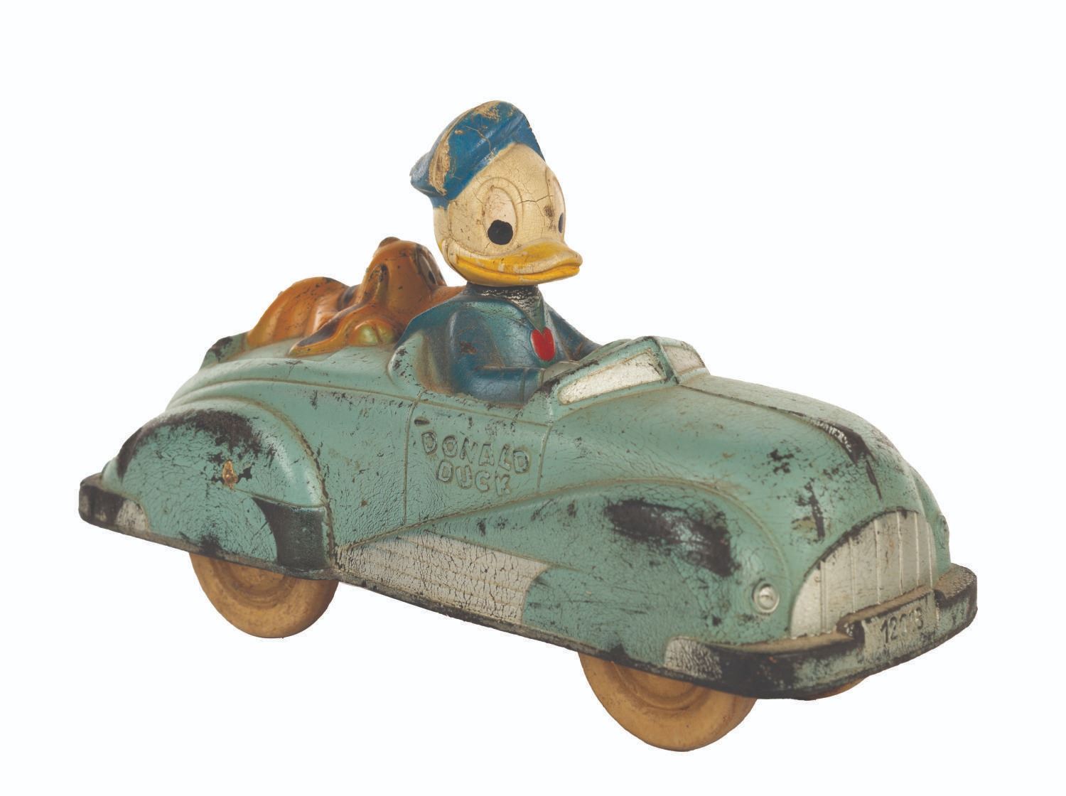 (Viceroy/Sunroco, 1950s) A Donald Duck and Pluto toy roadster by Viceroy Toys and Sunroco (Sun Rubber Co.). The rubber toy was manufactured in four base coat colors including red, yellow, white, and blue. Measuring 6.5"x2.25"x4" tall, the toy is in good condition, exhibiting scuffs and cracking to paint and aging to the rubber.