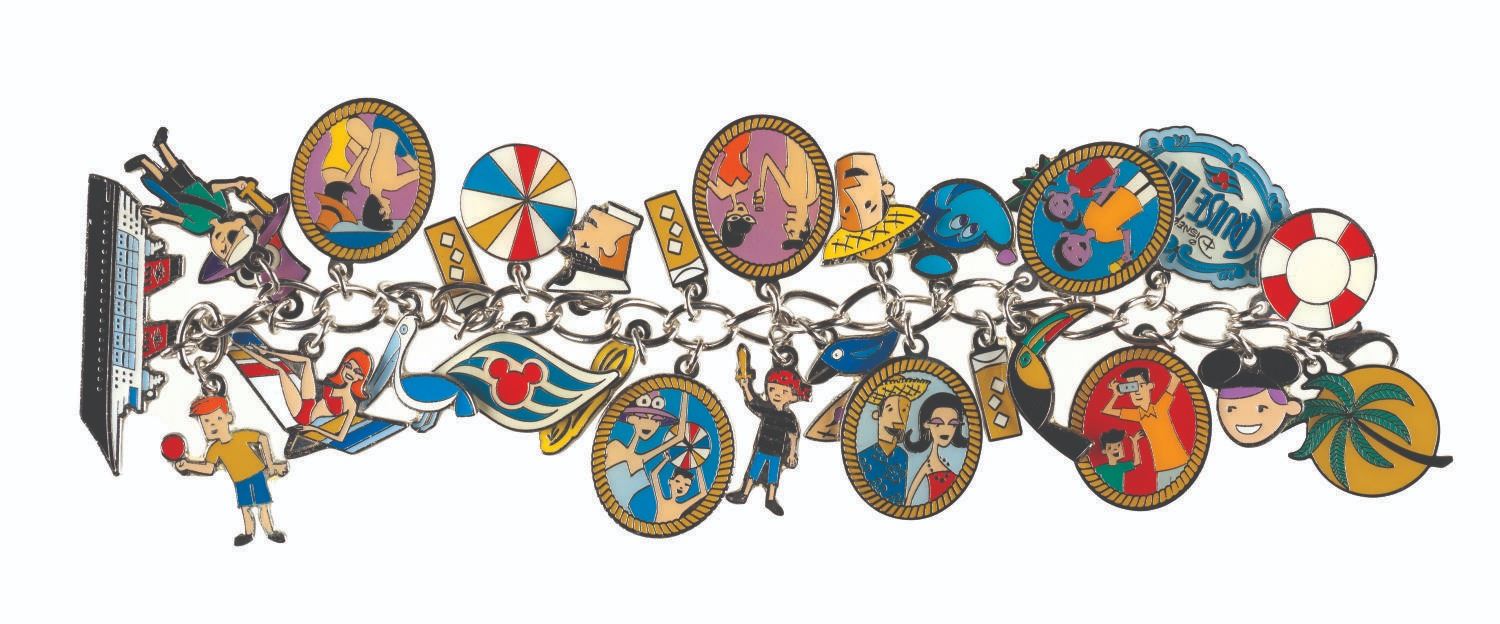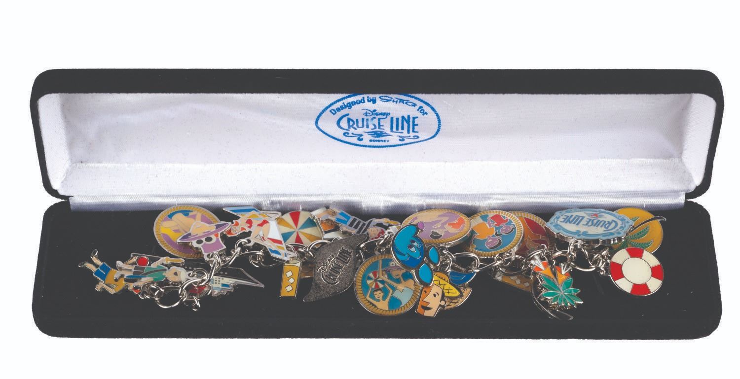 (Disney Crusie Line, 2011) A Disney Cruise Line 29 charm bracelet designed by the artist SHAG (Josh Agle). This bracelet was released to commemorate the new Disney Dream Cruise Line ship. The charms measure from 0.25" x 0.5" to 0.75" to 1.75", on a 7.5" silver chain bracelet in its original box. The charm bracelet is in very good condition with very light wear to some charms.