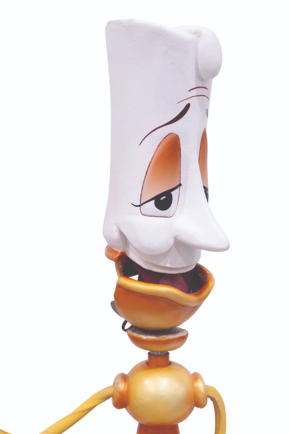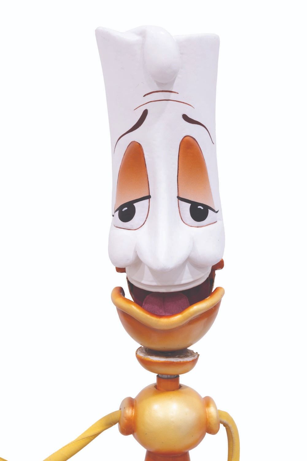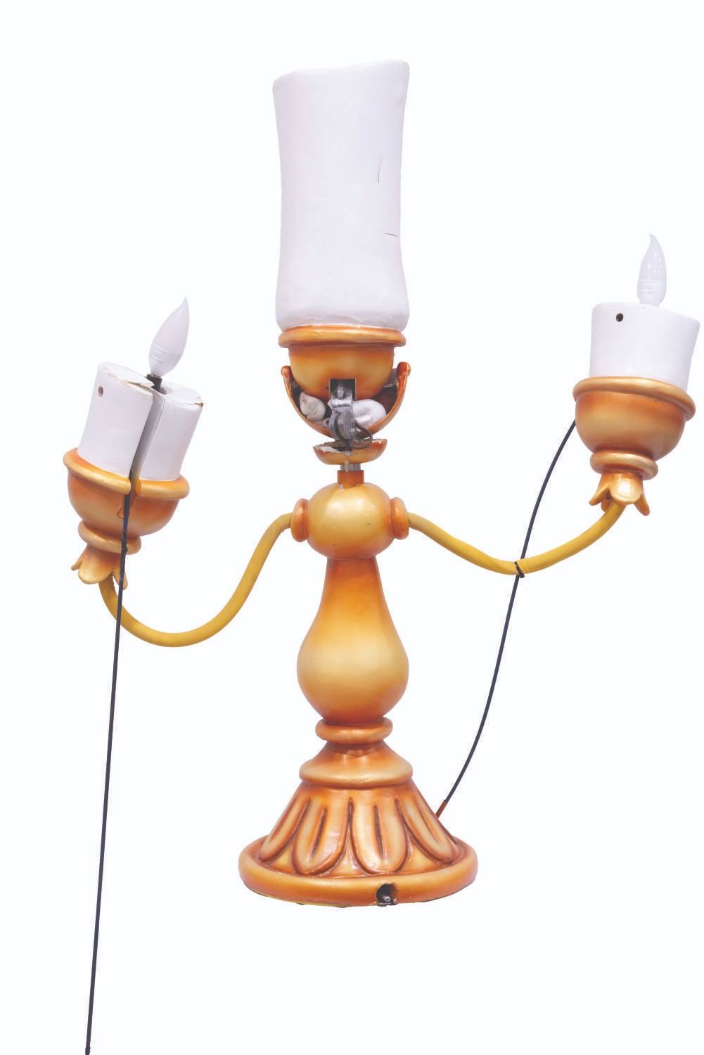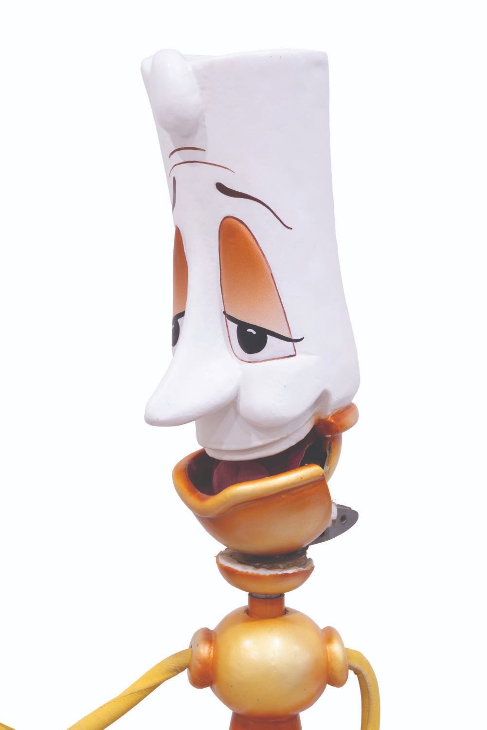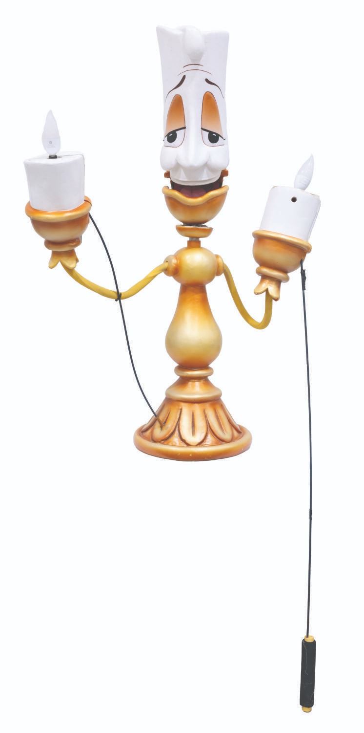 (Disney Cruise Line, 1998-2000) A Lumiere puppet used for “Disney Dreams: An Enchanted Classic,” a live stage show on the Disney Magic cruise ship. This model of Lumiere was removed from the show in 2000 and replaced with an updated puppet. The puppet’s lighting features are non-operational, having previously had its wires cut. Measuring 36” x 11” 38” tall, the puppet displays in good condition with a lightbulb missing from its head, separation at the right hand, cracks throughout, scuffs, scratches, a 1” x 1” section missing near the neck, and wear from show use. Due to size and fragility of the foam, special shipping arrangements are required. Please inquire before bidding.