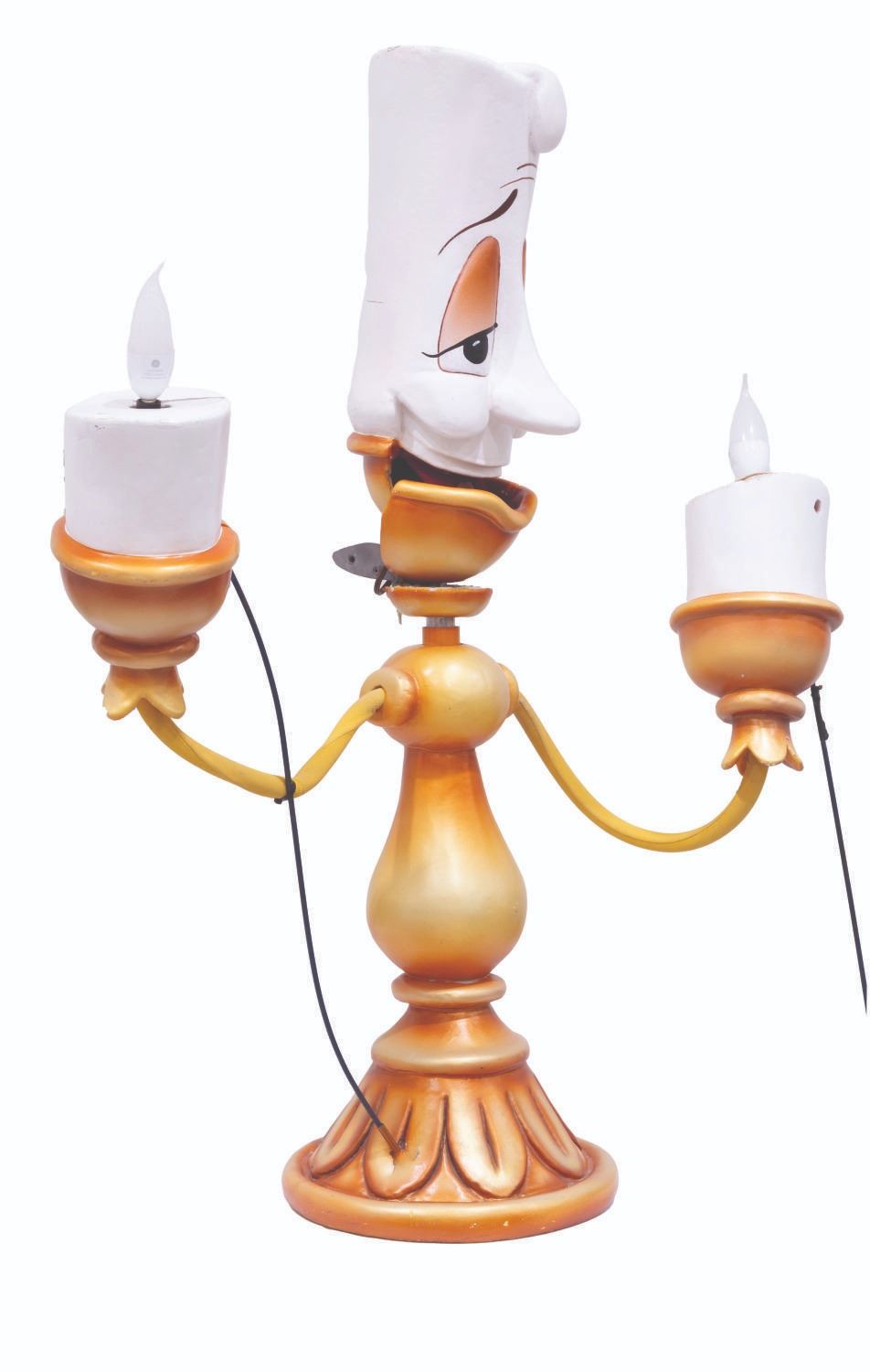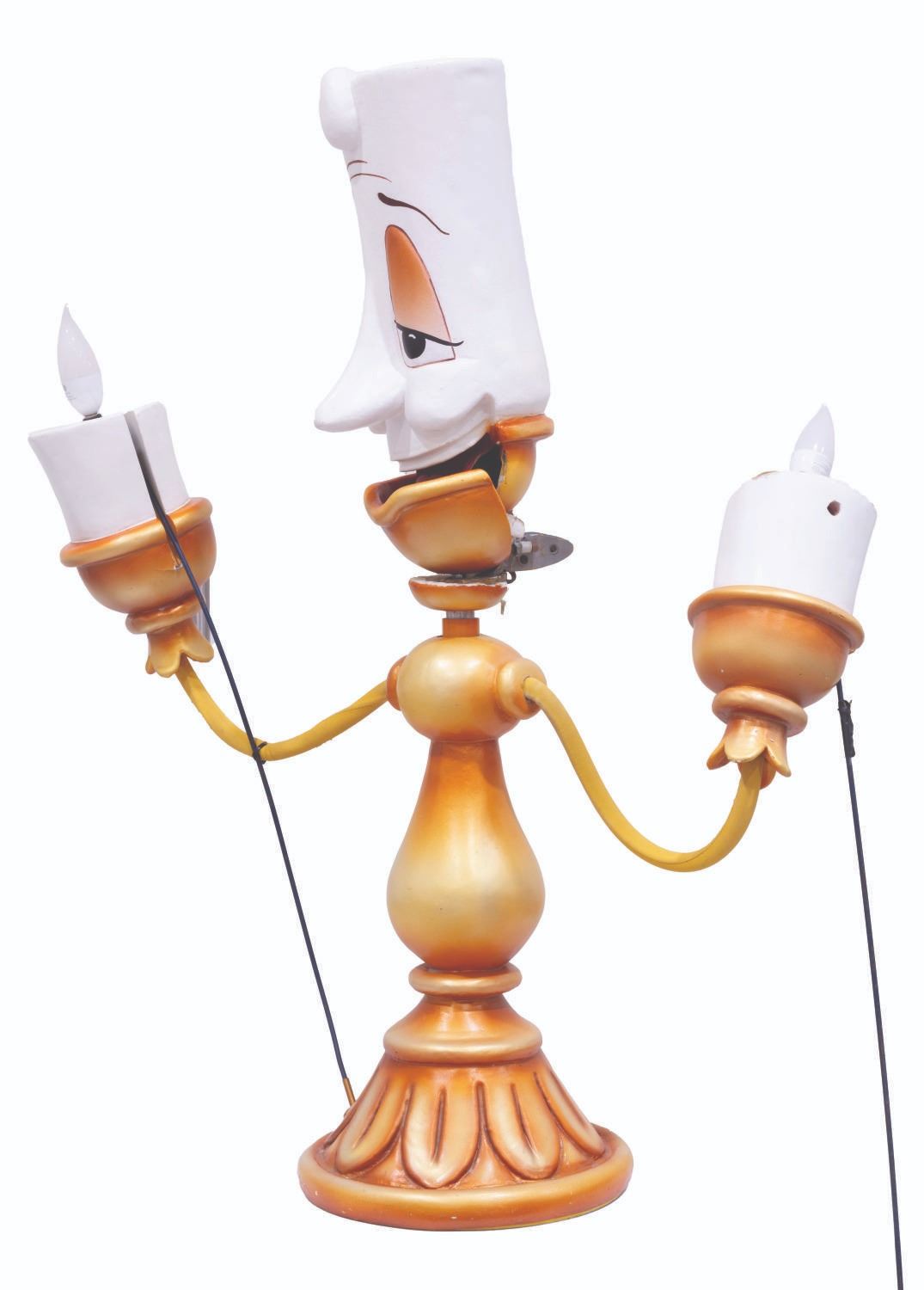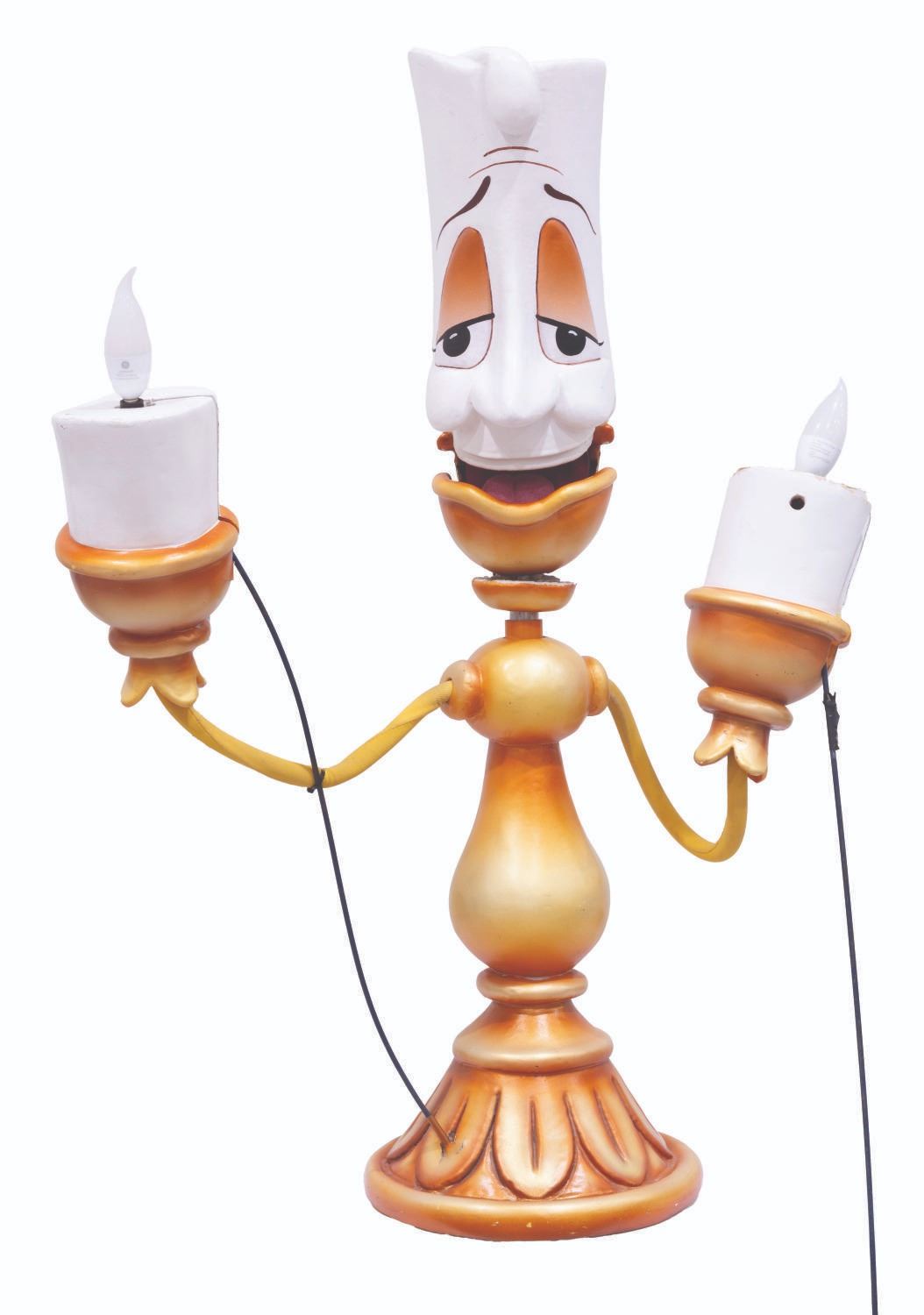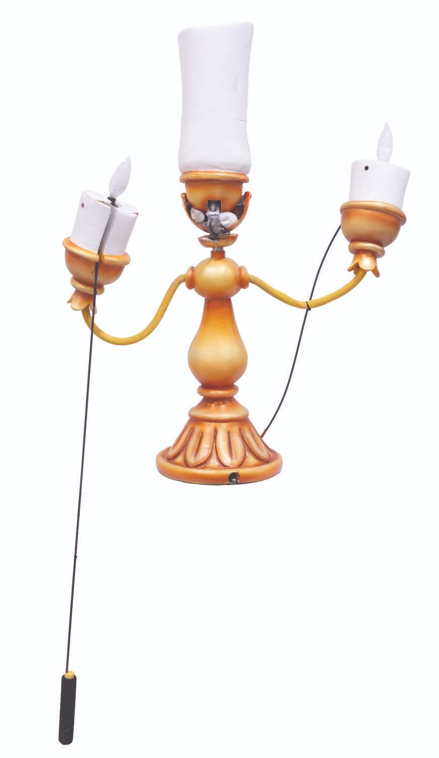 (Disney Cruise Line, 1998-2000) A Lumiere puppet used for “Disney Dreams: An Enchanted Classic,” a live stage show on the Disney Magic cruise ship. This model of Lumiere was removed from the show in 2000 and replaced with an updated puppet. The puppet’s lighting features are non-operational, having previously had its wires cut. Measuring 36” x 11” 38” tall, the puppet displays in good condition with a lightbulb missing from its head, separation at the right hand, cracks throughout, scuffs, scratches, a 1” x 1” section missing near the neck, and wear from show use. Due to size and fragility of the foam, special shipping arrangements are required. Please inquire before bidding.