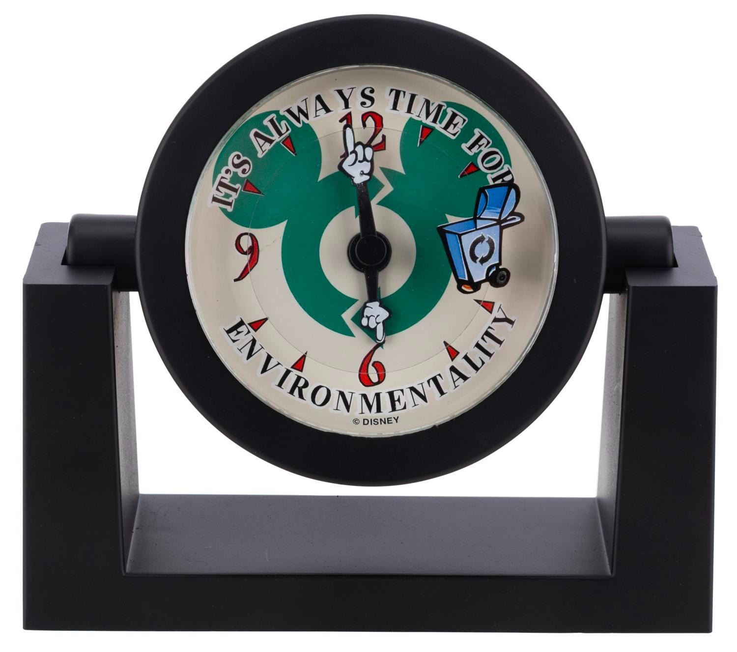 (Disney, 1990s) An "It's Always Time for Environmentality" desk clock featuring Mickey's gloves as the hands. The clock operates on one "AA" battery (not included) and is untested and may require service to function. Measuring 1.5" x 5" x 4.5" tall, the clock is in very good, unused condition with light edge wear from age and storage.