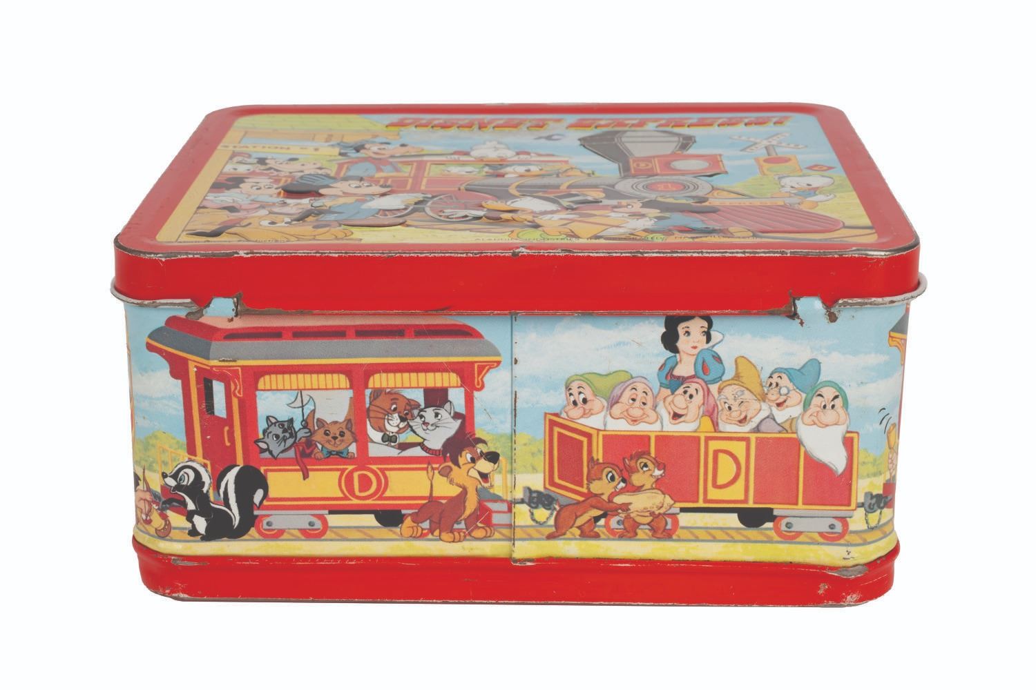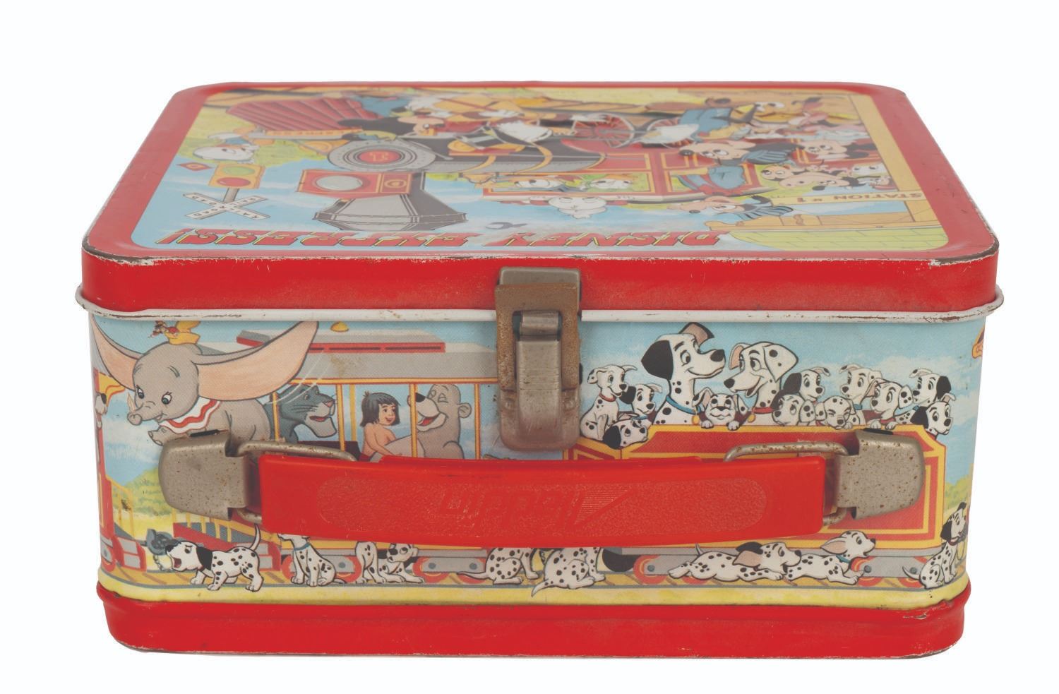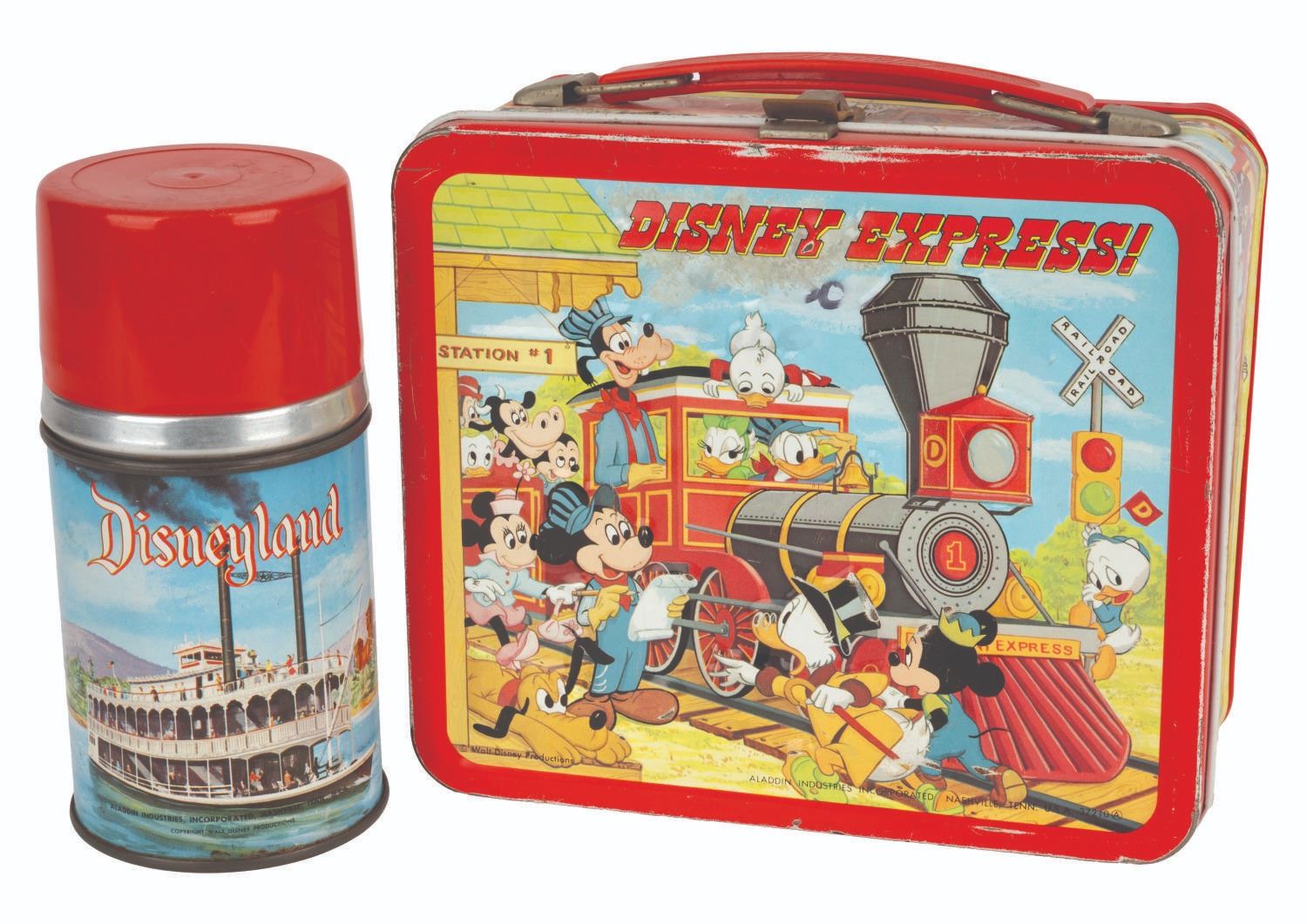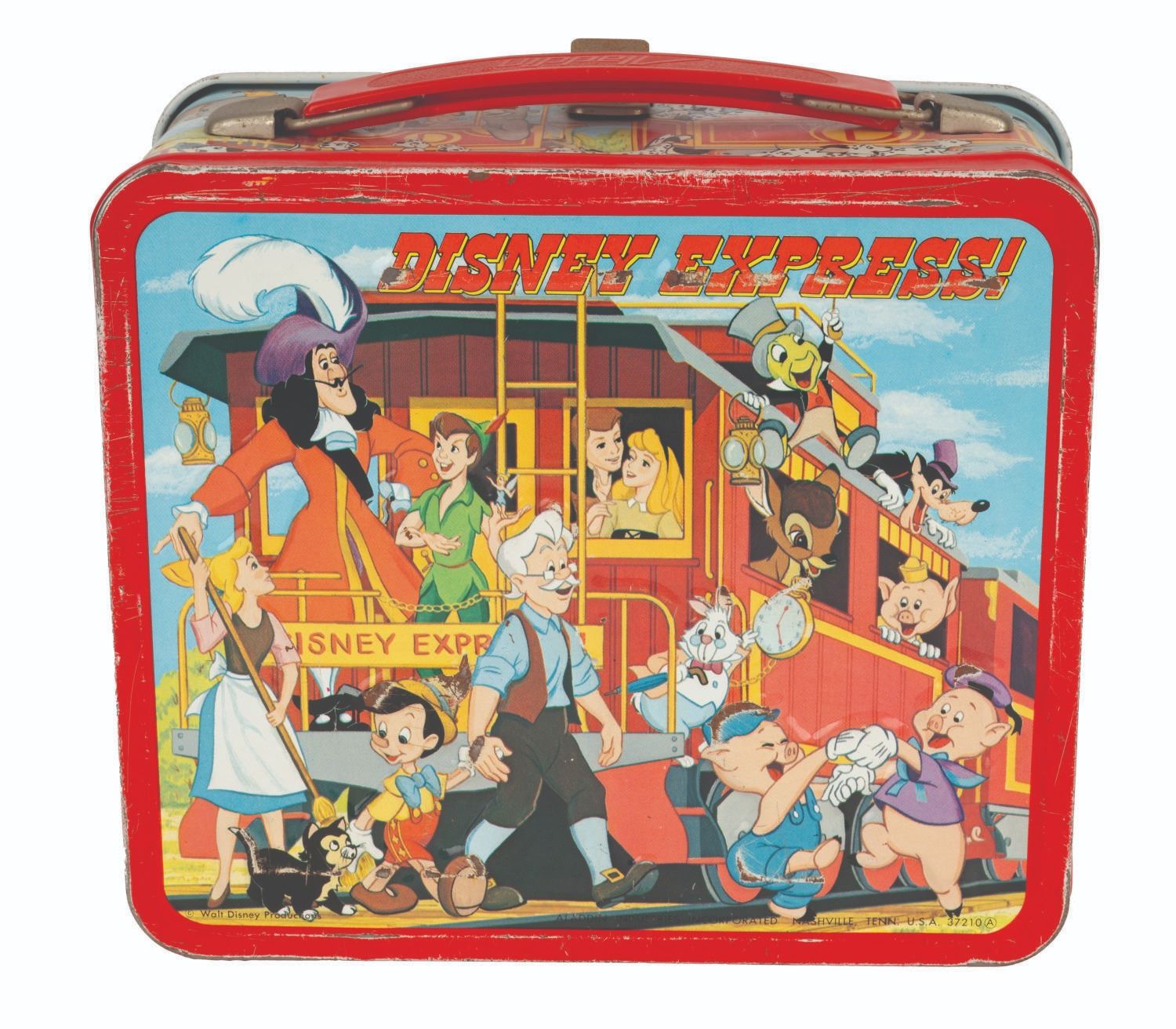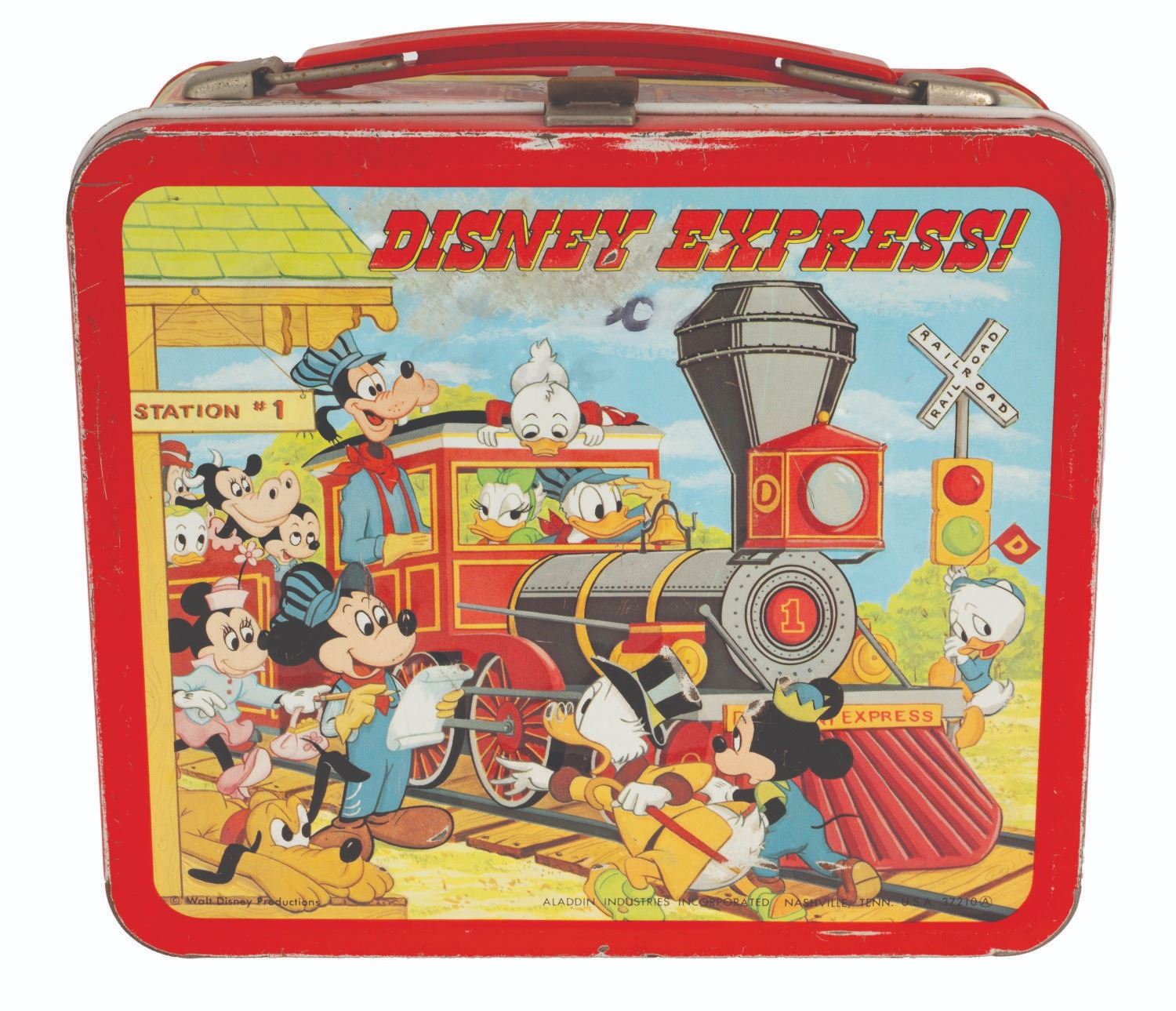 (Aladdin, 1979) A "Disney Express" lunch box featuring trains and Disney characters, manufactured by Aladdin Industries. Measuring 8"x7.75"x3.75", the lunch box is in good used condition exhibiting scuffing and scratches throughout, and minor oxidation, patina, and wear to some parts.