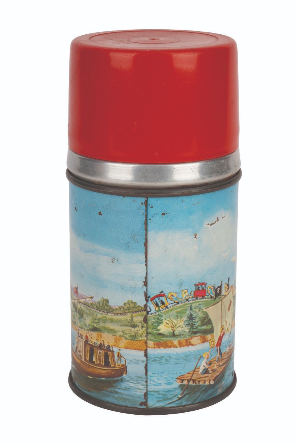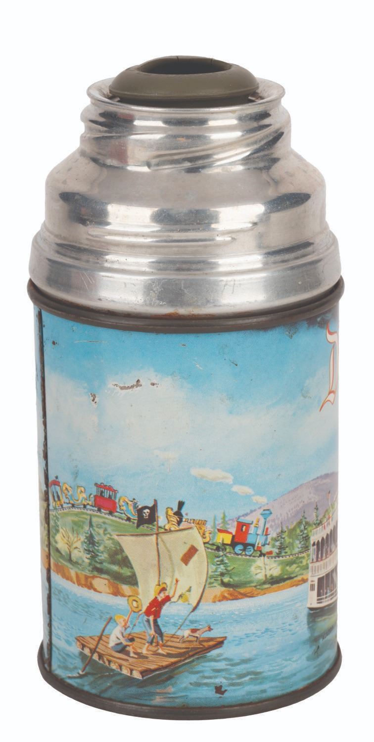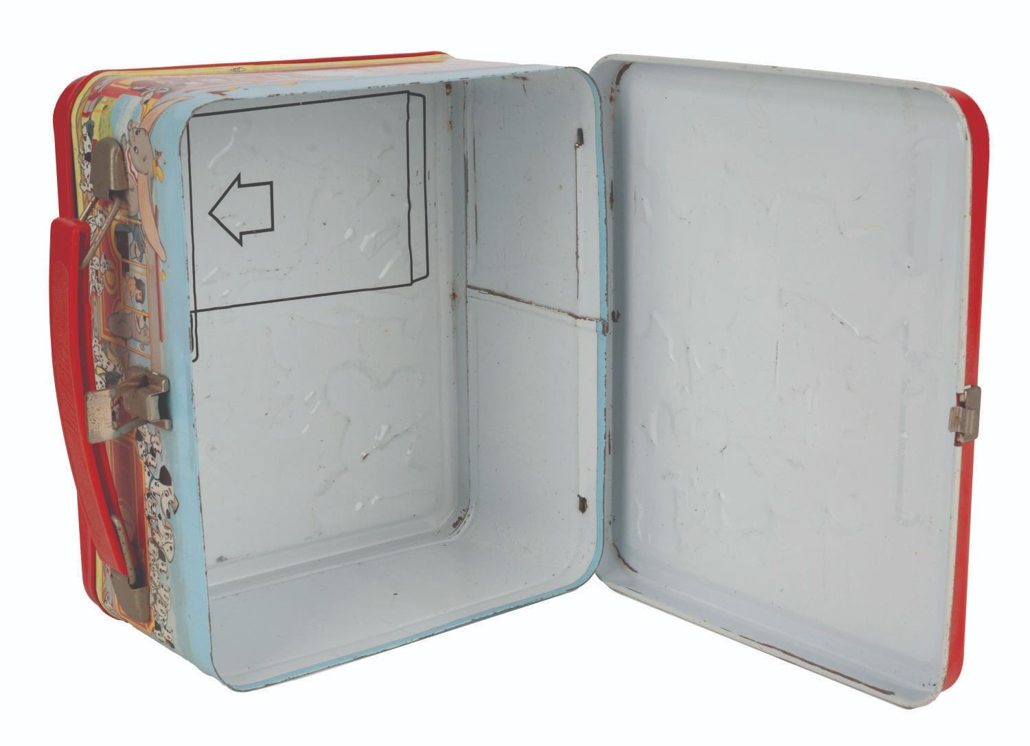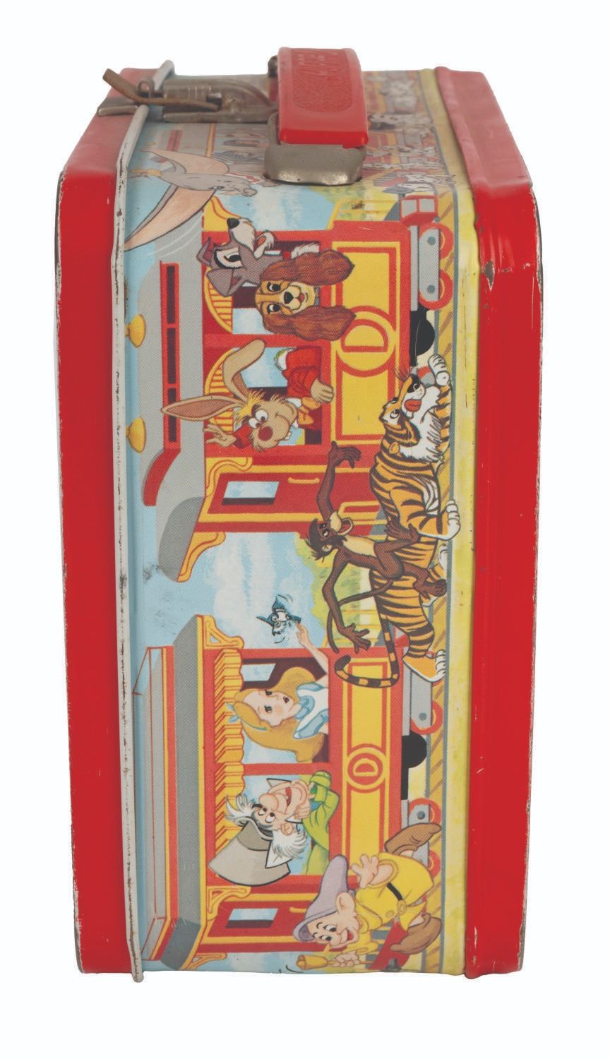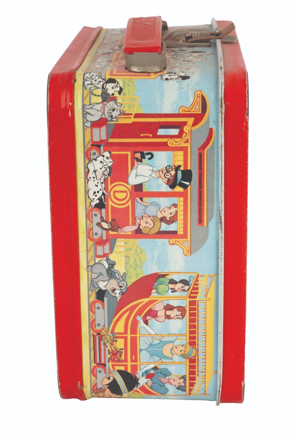 (Aladdin, 1979) A "Disney Express" lunch box featuring trains and Disney characters, manufactured by Aladdin Industries. Measuring 8"x7.75"x3.75", the lunch box is in good used condition exhibiting scuffing and scratches throughout, and minor oxidation, patina, and wear to some parts.