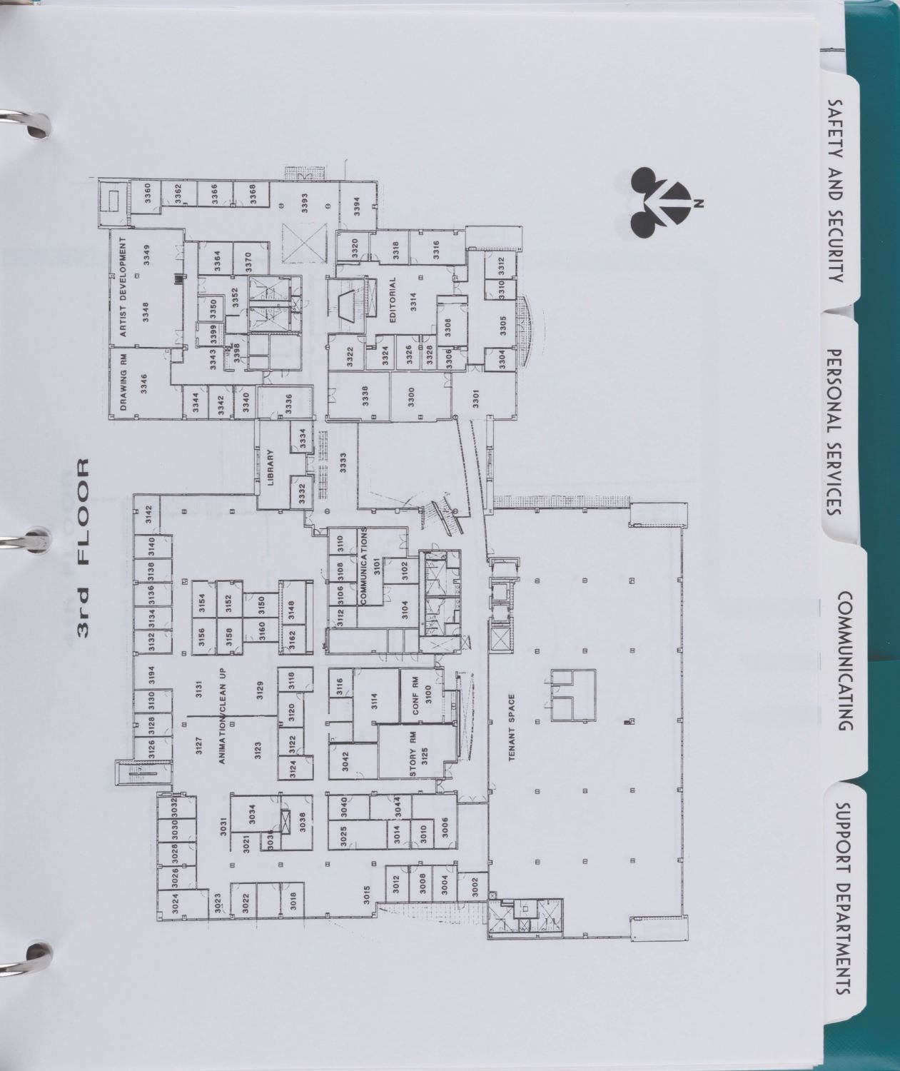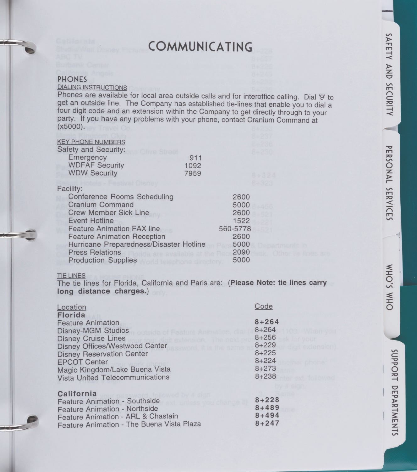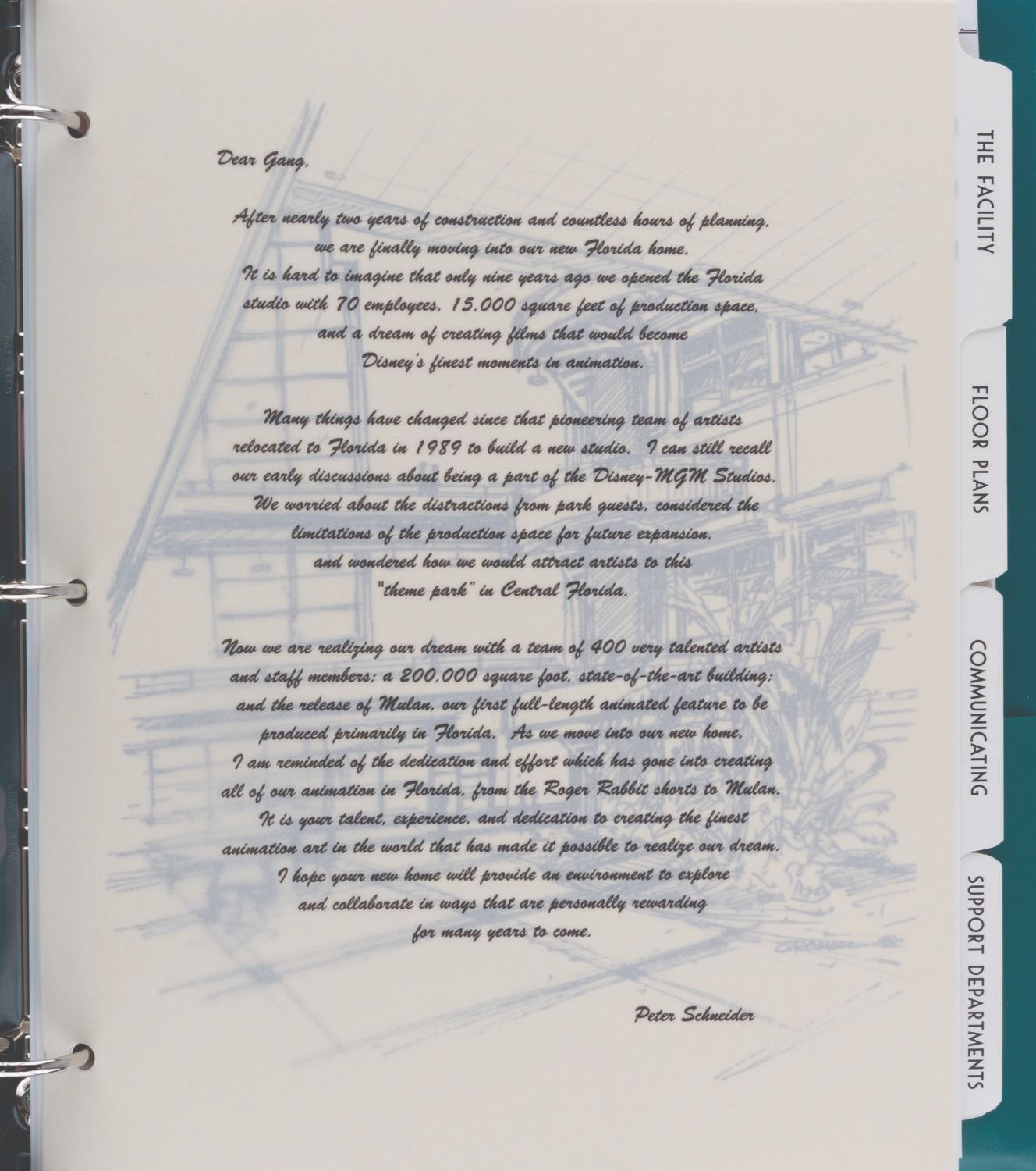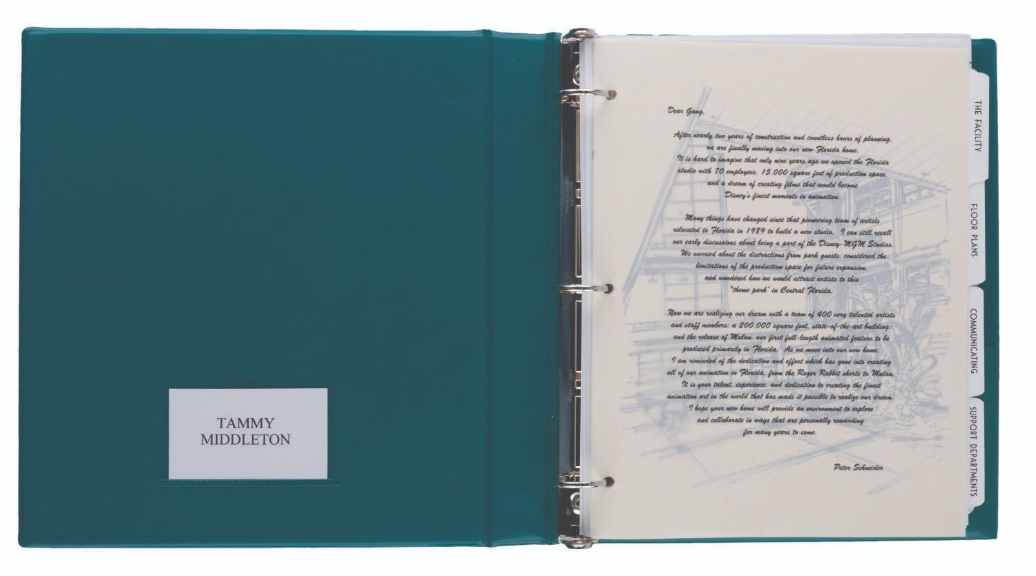 (Disney, 1998-2000s) A Disney Feature Animation binder given exclusively to Cast Members. The cover logo is from the period when Disney had animation offices in Burbank, Paris, and Orlando. Included are a welcome memo from Studio chief Peter Schneider, floor plans, communication protocols, safety information, and dividers featuring characters from recent releases, including "Hercules" and "Mulan." The Who's Who and Art on Display sections have dividers but no additional materials. Included in the binder are maps of office layouts for Northside, Southside, and Studio facilities from 2001. Measuring 10.5" x 11.5", the binder is in very good condition with light handling wear.