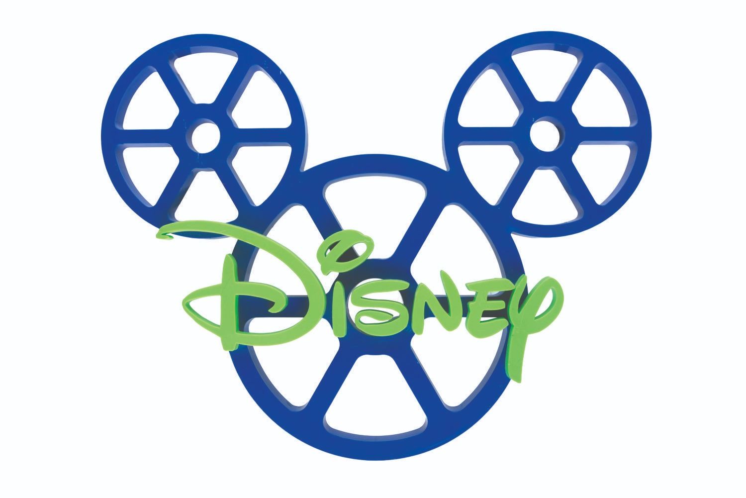 (Disney, 2000s) A store sign for Disney movies, with three film reels forming a Mickey Mouse head. Measuring 21.5" x 1.5" x 17.5", the plastic sign is in good condition with scratches throughout, scuffs, and wear from store display.