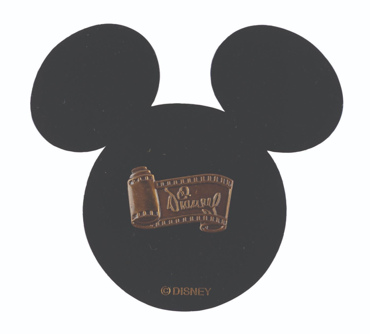 (Disney, 2000s) A bronze film strip pin featuring a facsimile of Walt's signature. The pin is on its original card and in very good condition with light scratches.
