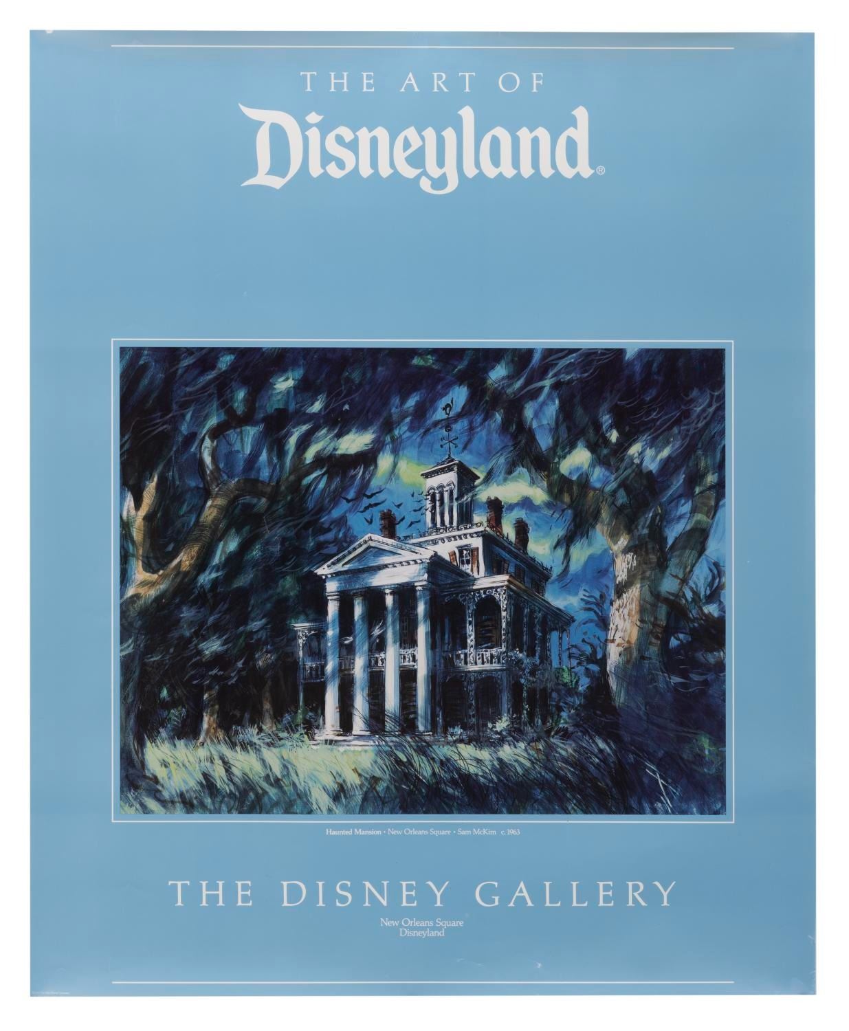 (Disneyland, 1988) A poster for the inaugural The Art of Disneyland exhibition at The Disney Gallery, featuring Sam McKim's gorgeous 1963 concept art for The Haunted Mansion’s exterior. Measuring 26" x 32" the poster is in good condition with edge wear, creasing, scuffs and light discoloration.