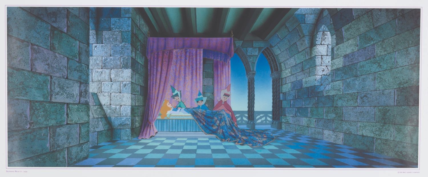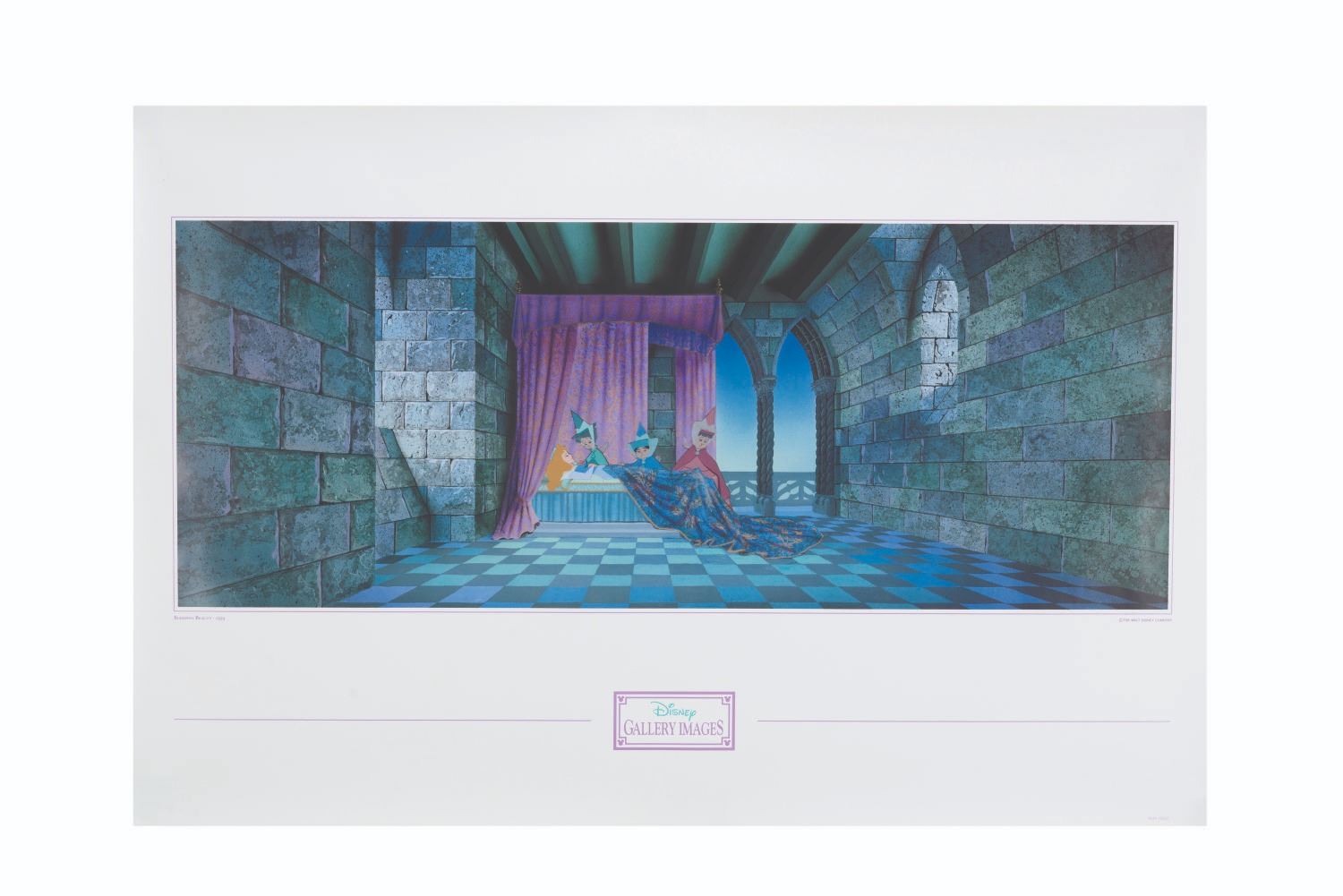 (Disney, 1990s) A "Sleeping Beauty " lithograph featuring a scene of the three fairies watching over sleeping Aurora. Measuring 24 " x 36 ", the lithograph is in fine condition.
