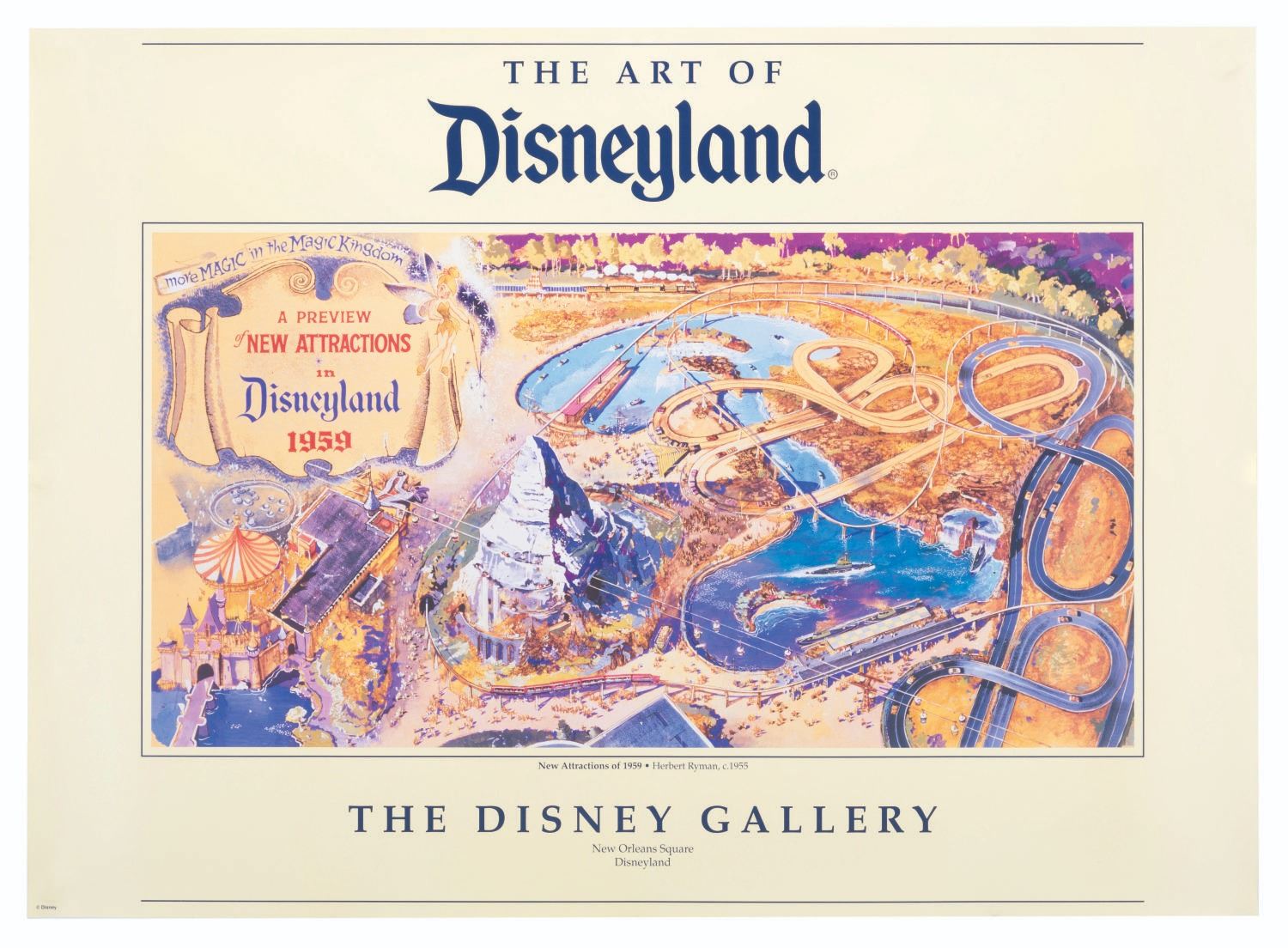 (Disneyland, 1987) A poster from The Art of Disneyland 1955-1987, the inaugural exhibit held at The Disney Gallery. The print features Disney Legend Herb Ryman’s famous artwork previewing future 1959 attractions, which was displayed in the Park on a large billboard. Upcoming attractions depicted include the Monorail, Matterhorn Bobsleds, and new Autopia cars, which would all become essential parts of the Disneyland experience. Measuring 26” x 36”, the poster is in very good condition with light creases and edge wear.