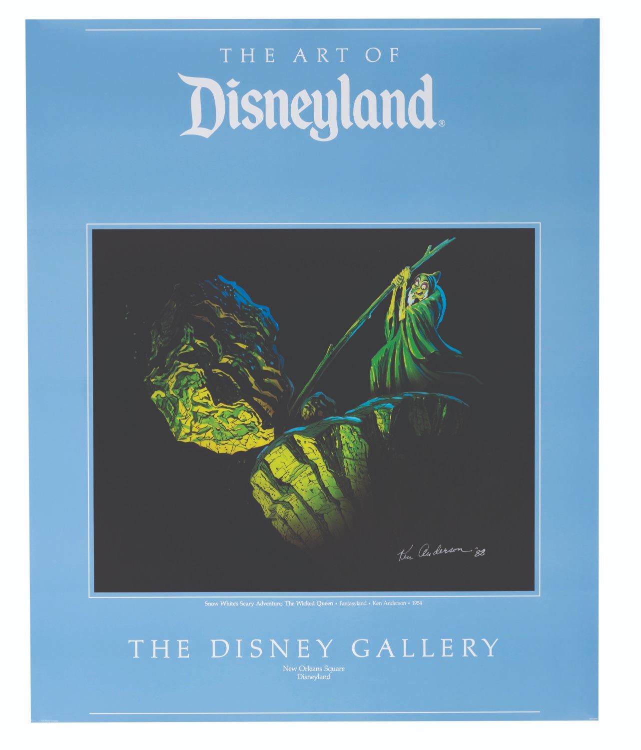 (Disneyland, 1988) A beautiful concept poster of the Evil Queen in her hag disguise from Snow White's Scary Adventures, sold as part of the Disney Gallery's "The Art of Disneyland" series. Animator and Imagineer Ken Anderson signed the poster in silver marker. Measuring 26” x 32”, the poster displays in fine condition with very light edge wear.