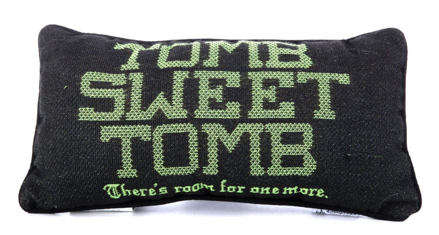 (Disney Parks, 2000s) A Disney Parks authentic original Haunted Mansion Tomb Sweet Tomb decorative throw pillow. Measuring 15.5”x8”, the cotton and polyester pillow is in fine condition with original tags attached.