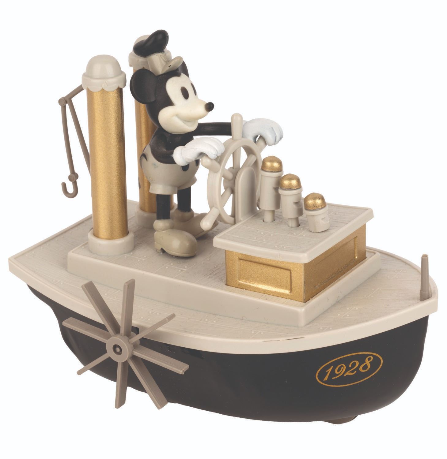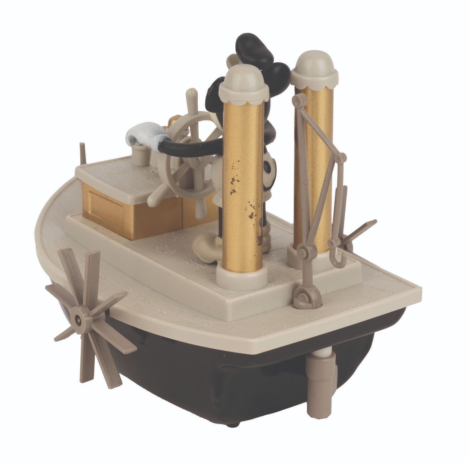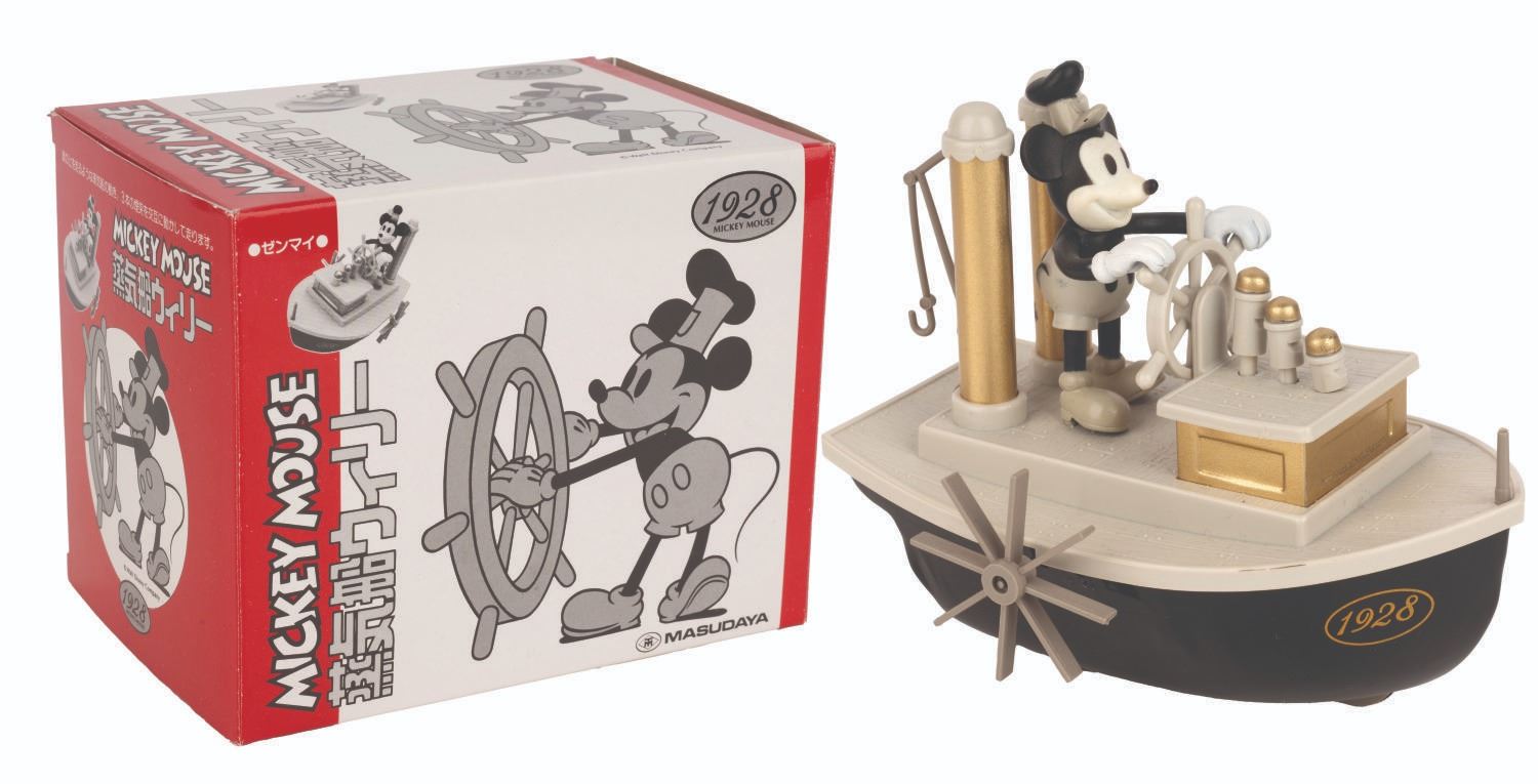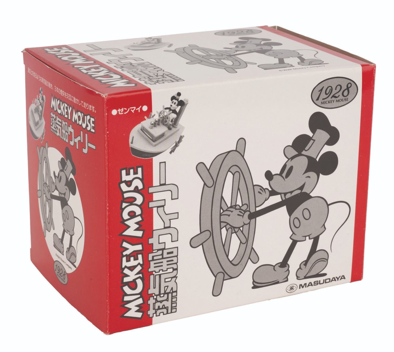 (Masudaya, 1987) A Disney Japan exclusive Steamboat Willie wind-up toy celebrating sixty years of Mickey Mouse. Once wound up, it cruises at its intended leisurely pace, going up and down slightly as if on water. Measuring 5.25" x 6" and in its original box, the toy is in very good condition with oxidation on the back of the left smokestack and two small stray paint marks on the hat and waist.
