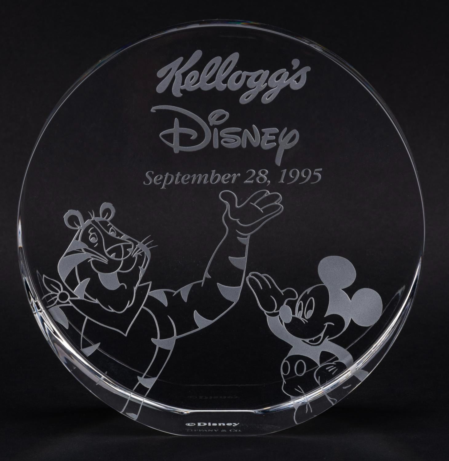 (Tiffany and Co., 1995) A Disney & Kellogg’s commemorative crystal paperweight from September 28, 1995, by Tiffany and Co. featuring Mickey Mouse and Tony the Tiger. At the time, the companies were partnered with cereal promotions for Pocahontas, Goof Troop, and other Disney TV shows. Measuring 5.5” in diameter the paperweight is in fine condition.