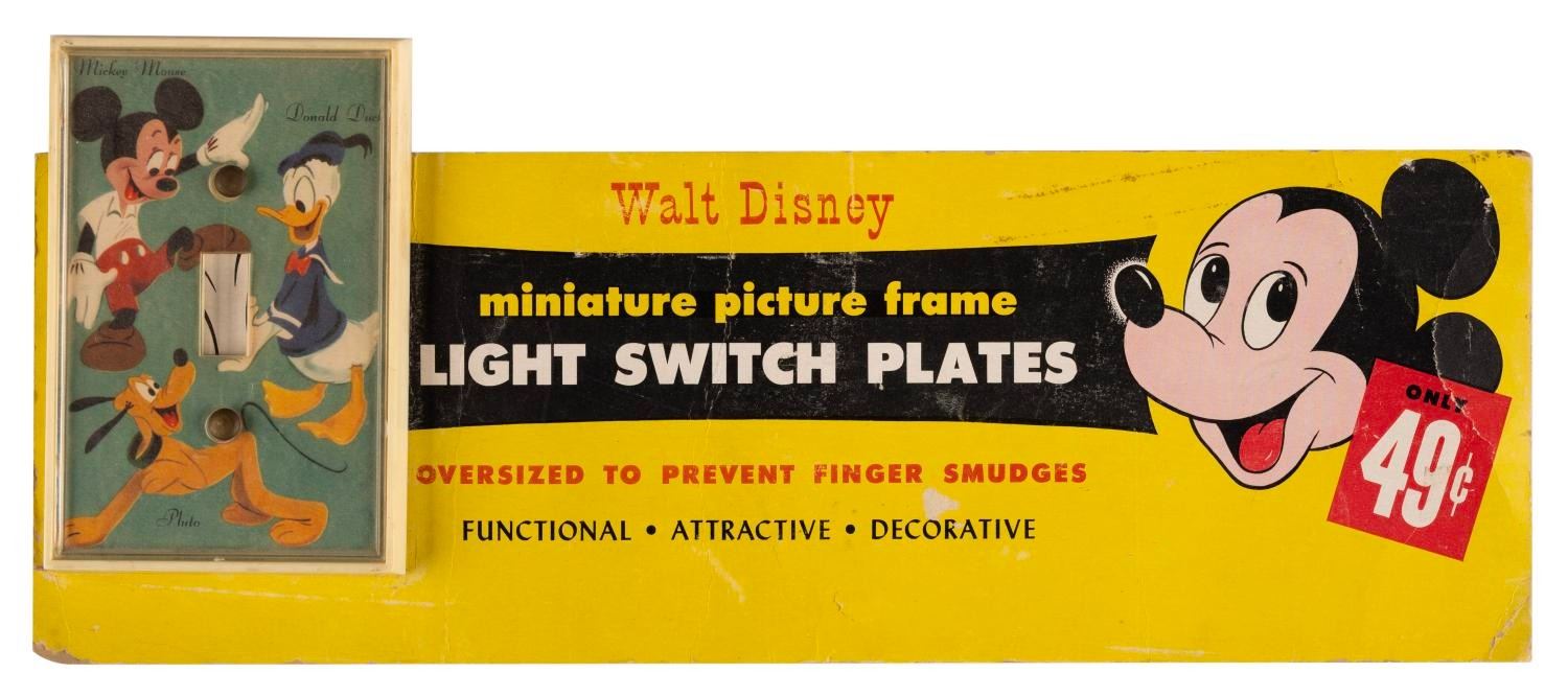 (Disney,1960s ) A paper display sign promoting Disney Light Switch Plates paired with a light switch plate. The 14.5"x5" heavy paper sign has a 3.5"x5" plastic light switch plate attached to it. The sign is in good condition with creases and chipping to the paper. The switch plate is also in good condition with fading and cloudiness from age.