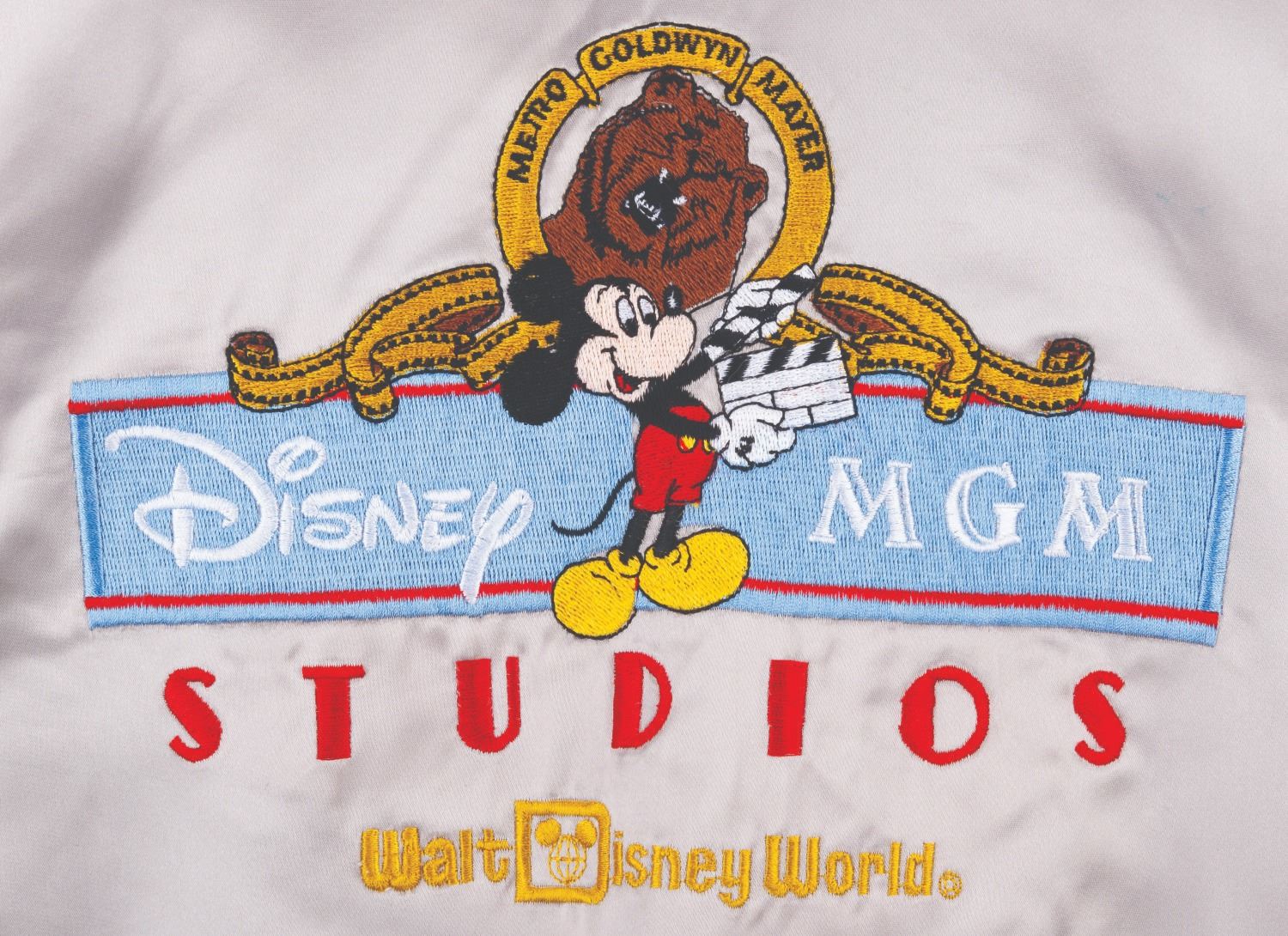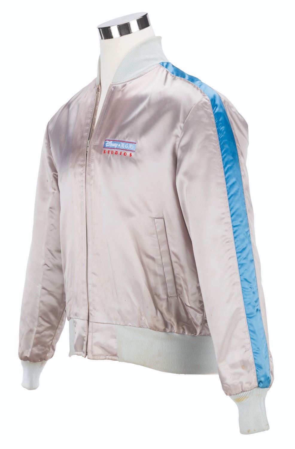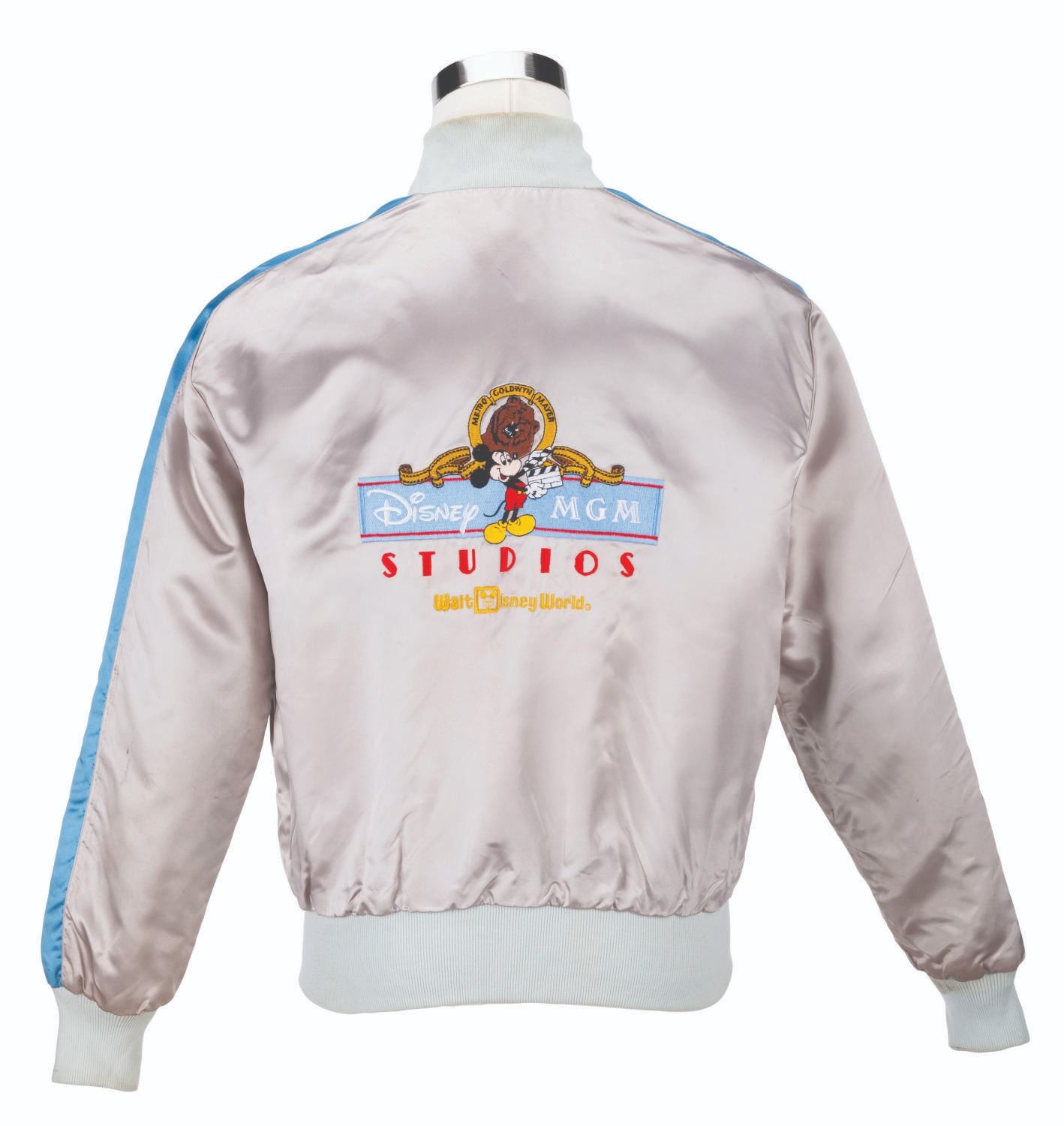 (Disney-MGM Studios, 1990s) A Disney-MGM Studios souvenir satin jacket with light blue stripes down the sleeves and the Park's logo on the reverse. Labeled a size Medium, the jacket is in fair condition with stains throughout, scratches, and wear.