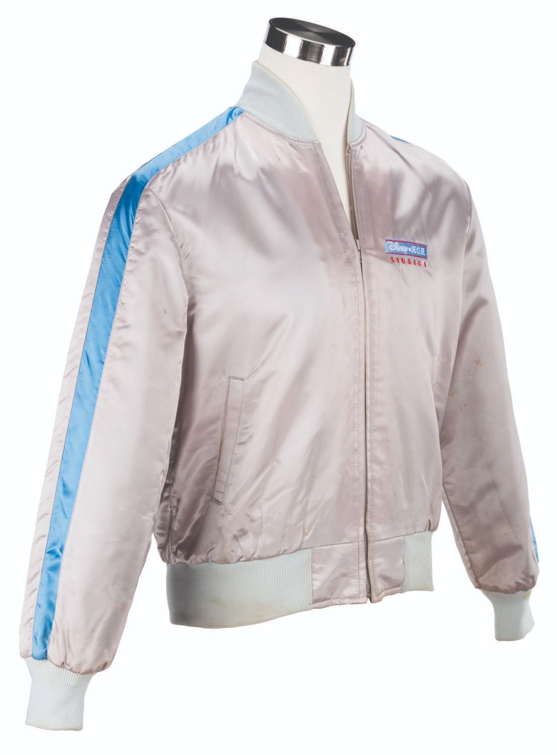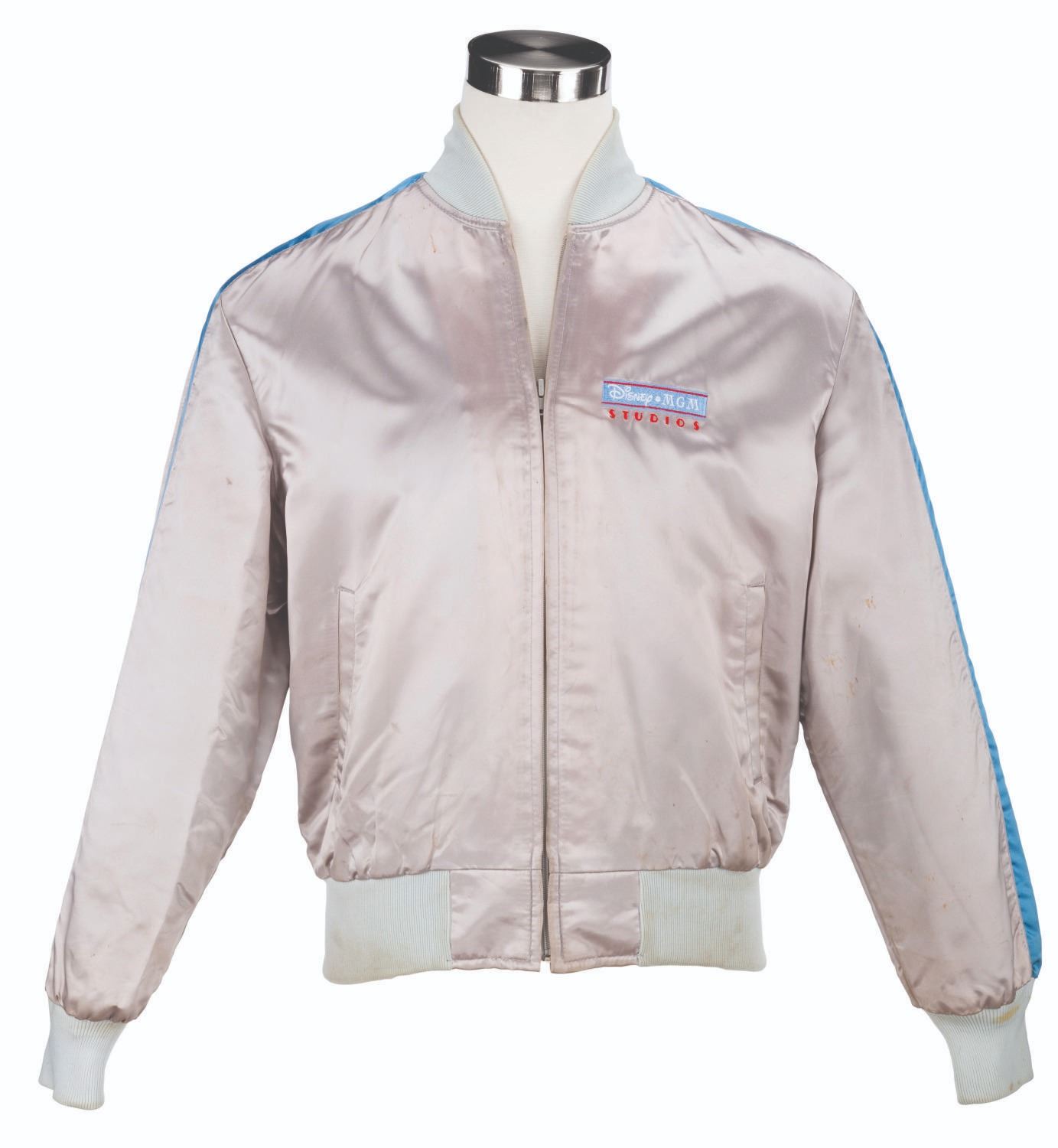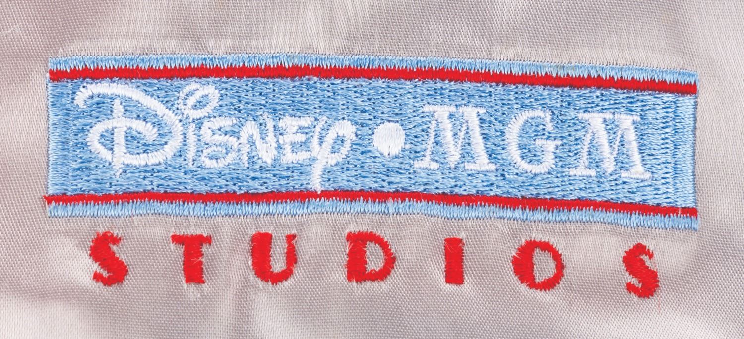 (Disney-MGM Studios, 1990s) A Disney-MGM Studios souvenir satin jacket with light blue stripes down the sleeves and the Park's logo on the reverse. Labeled a size Medium, the jacket is in fair condition with stains throughout, scratches, and wear.
