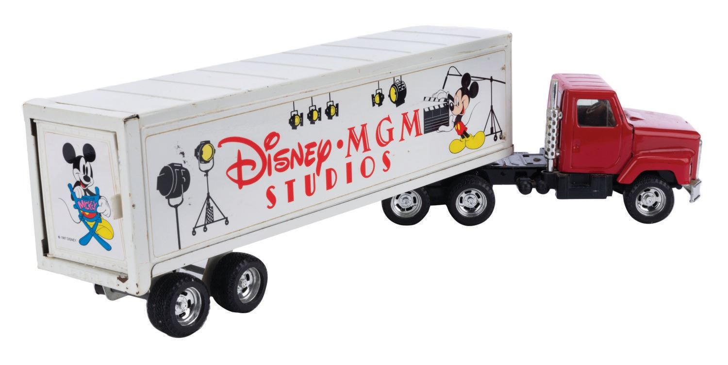 (Disney's MGM Studios, 1980s) A souvenir Truck and Trailer set from Disney's MGM Studios with the park's logo and Mickey Mouse holding a clapperboard depicted along the side of the trailer. The toy was produced by ERTL and measures 19.75"x 3.5" and 5" tall. The truck is in good condition with surface wear, rusting to the truck bed and missing a wheel on the back of the trailer.