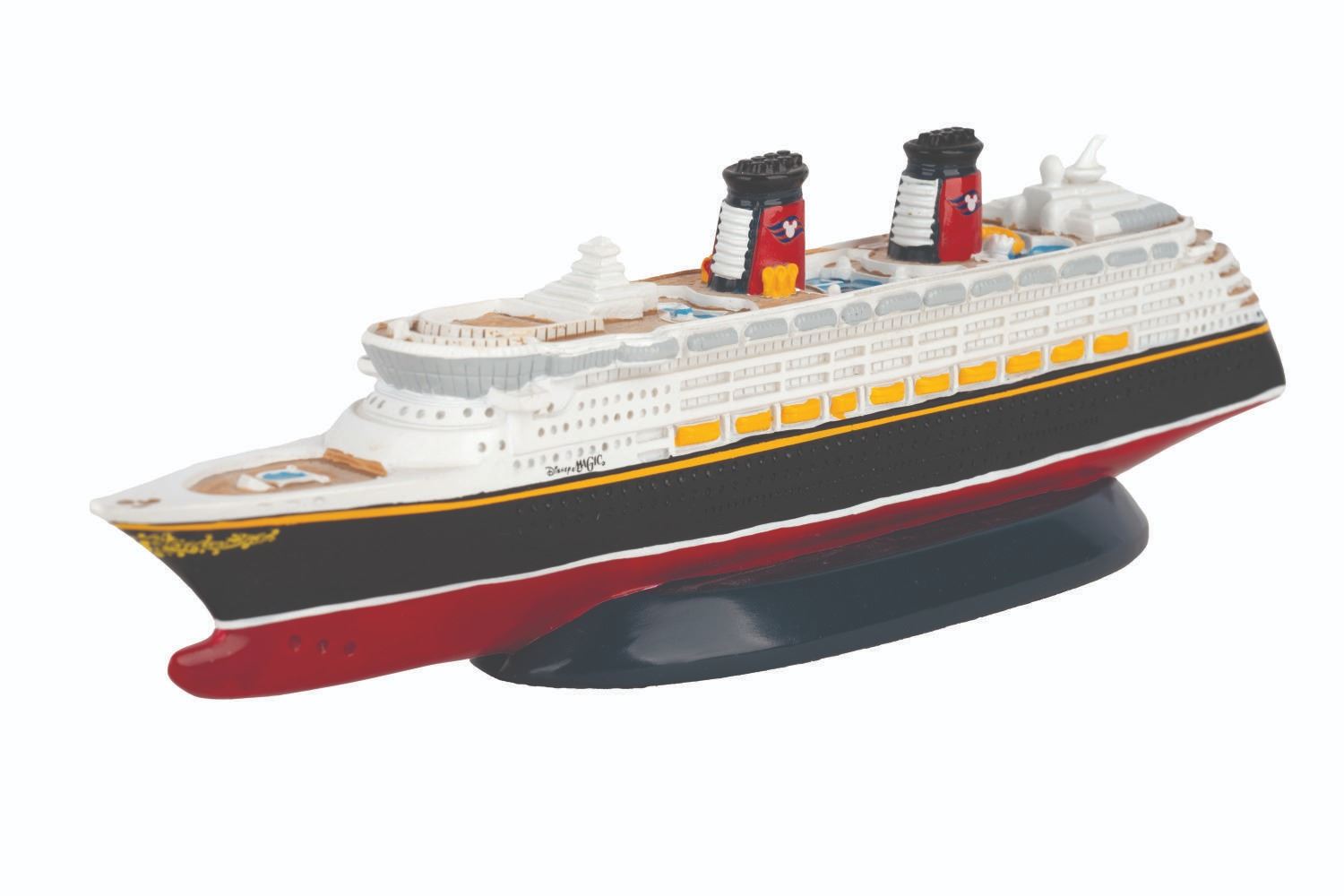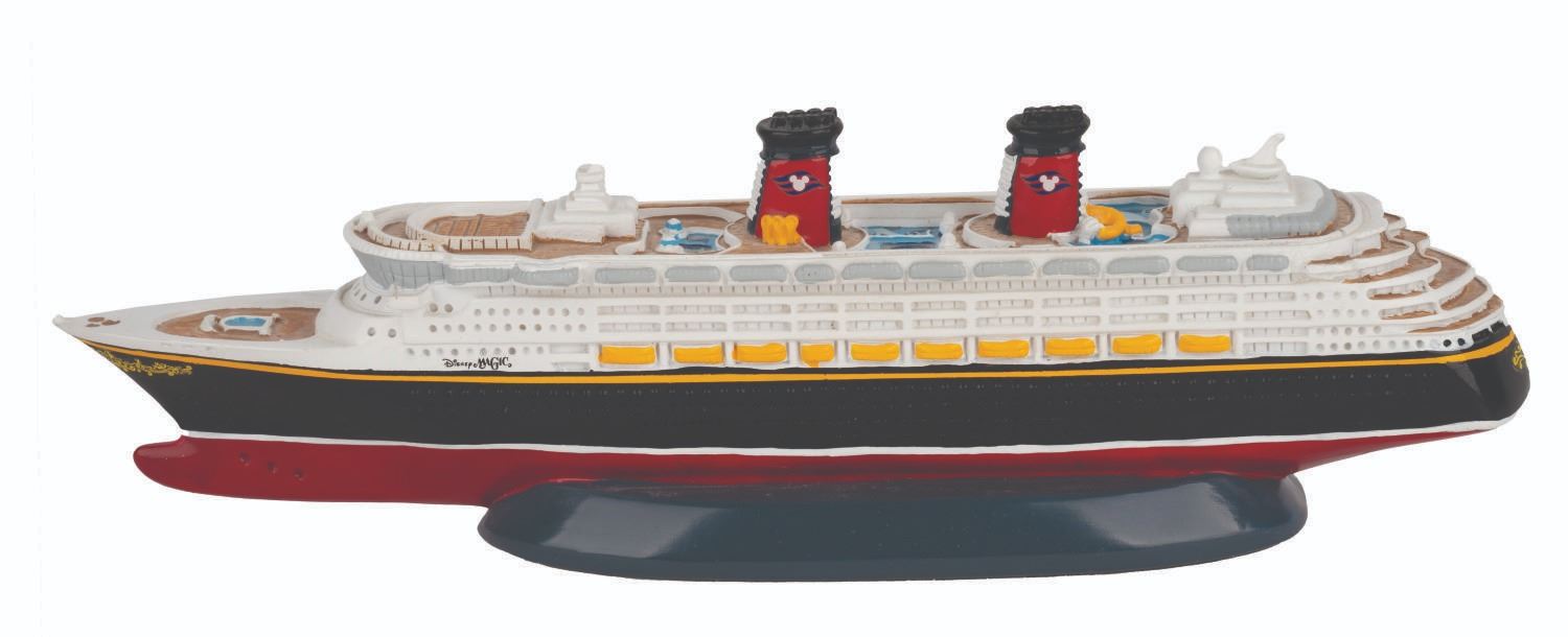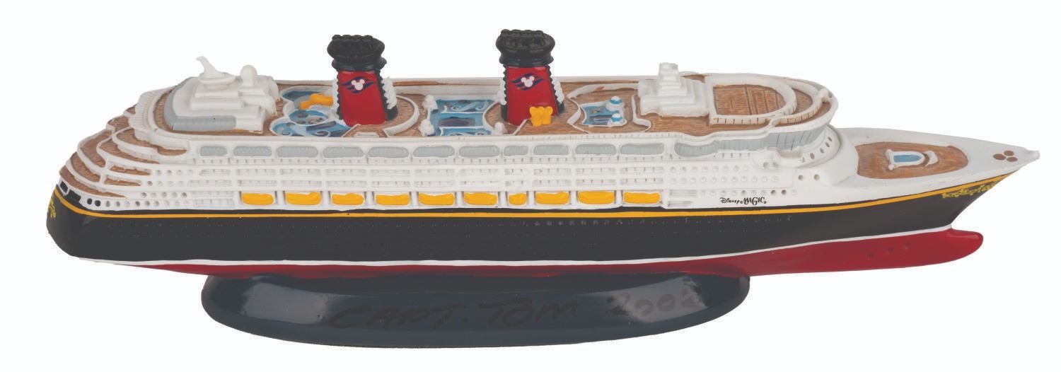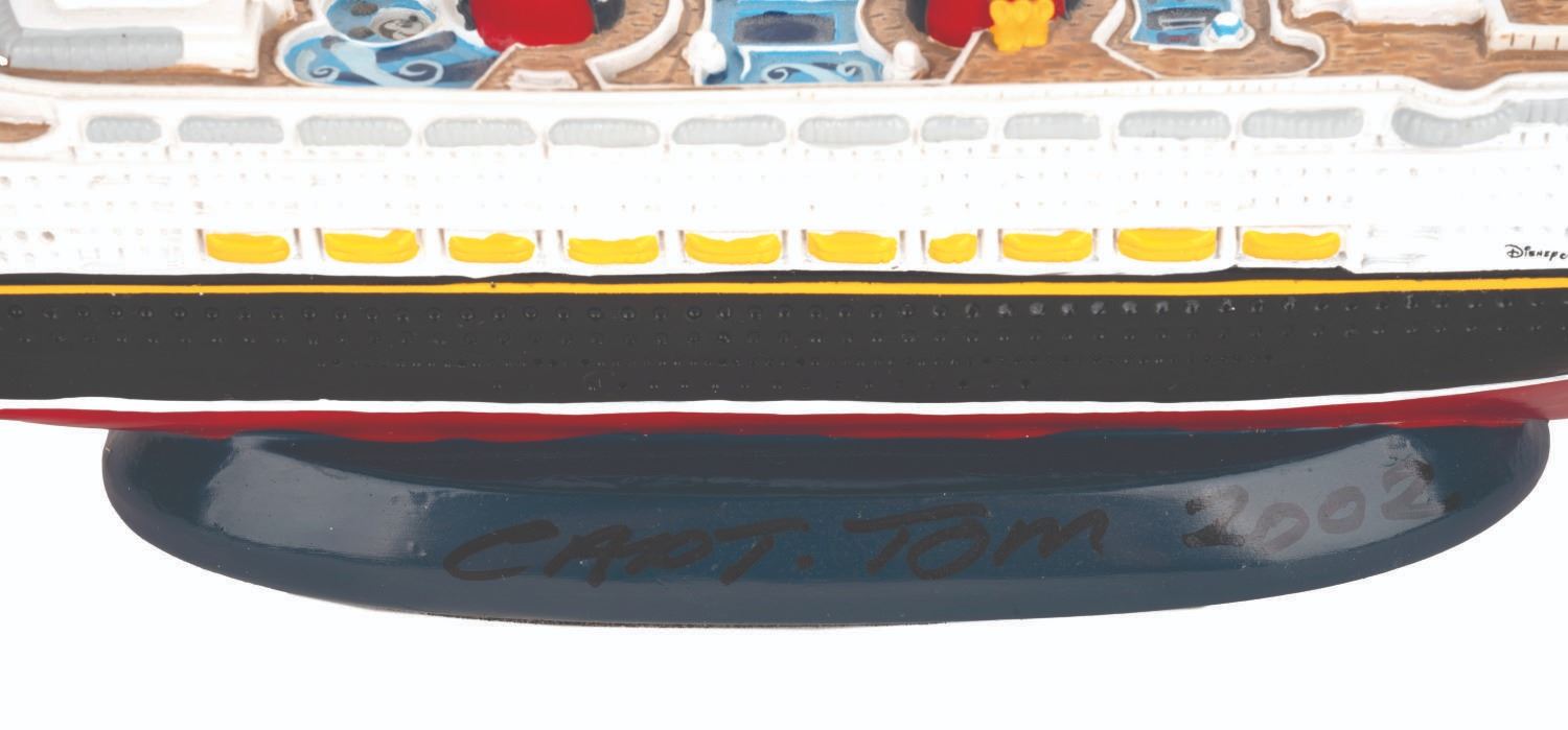 (Disney Cruise Line, 2002) A Disney Magic cruise ship replica figure, signed on the base’s side by “Captain Tom” in 2002. Measuring 9.75” long with its original 4.5” x 12” x 5.25” tall box, the ship displays in very good condition with light scratches and wear.