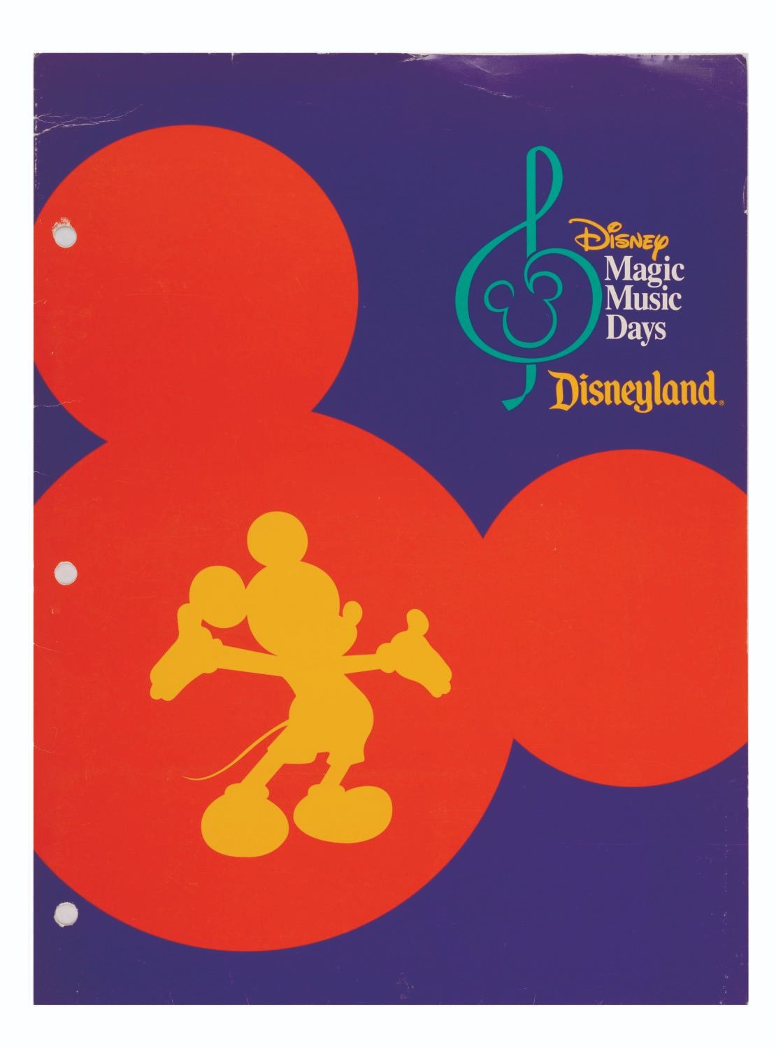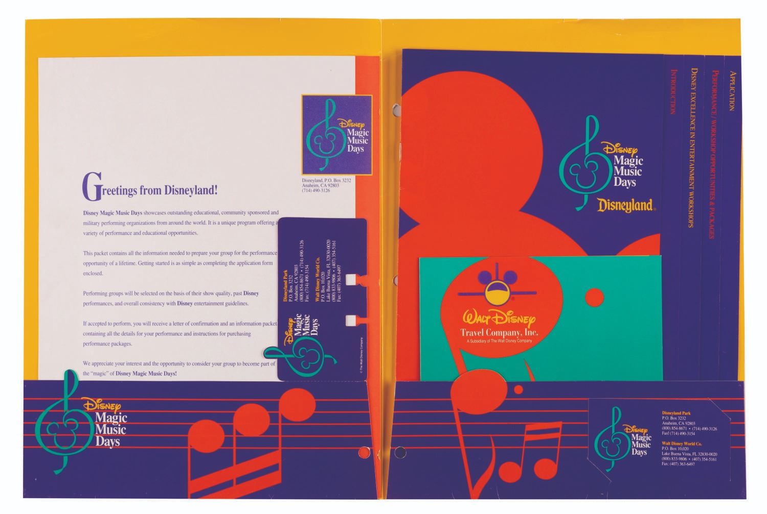 (Disneyland, 1990s) An introductory kit given to Disney Magic Music Days applicants. Included is a letter composed by Jim Turner (Cast Development), a Walt Disney Travel Co. brochure, and a leafed brochure containing an introduction and information on Disney Excellence in Entertainment Workshops. Measuring 9"x12" this folder and materials are in good condition exhibiting creases, scuffs, and wear to the folder's cover and some of the contents.