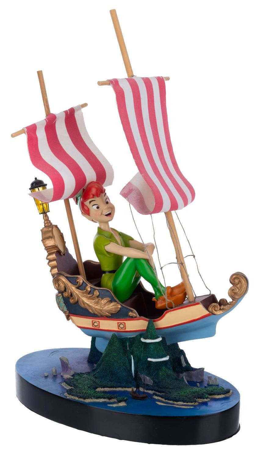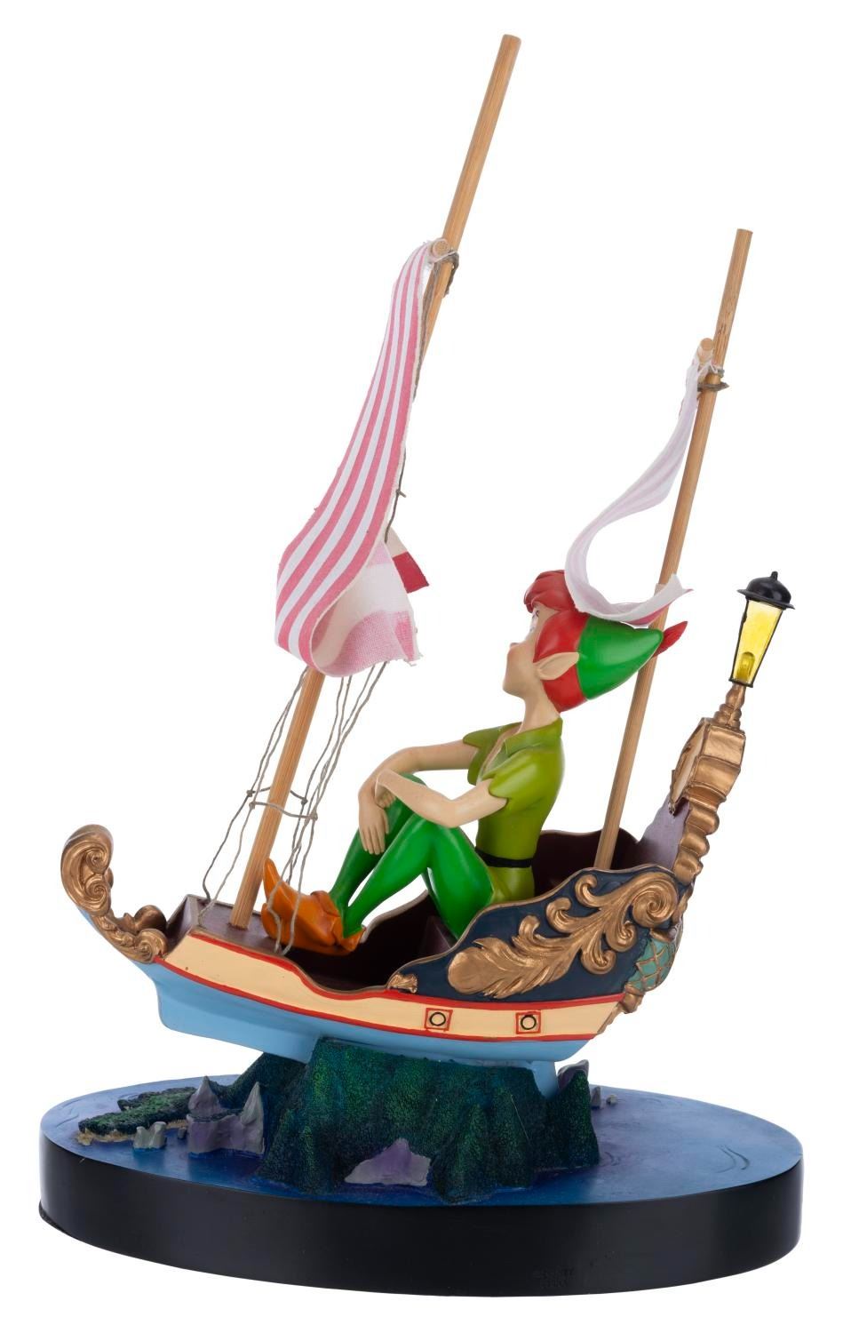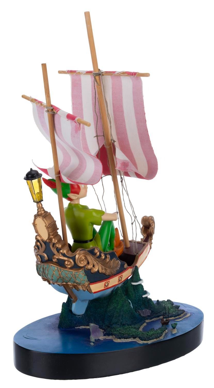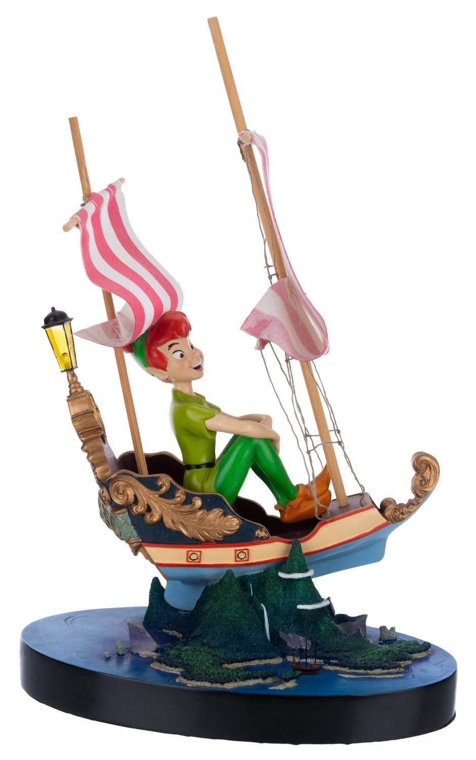 (Disney, 2000s) A Disney Magical Big Fig sculpture of Peter Pan in one of the ride vehicles from Peter Pan's Flight. The lamp in the back features Tinker Bell's silhouette and lights up with two included AA batteries. Designed by Randy Noble, this piece is in very good working condition with several small spots on Peter, paint marks on the back of the boat, and light wear to the base, sails, and Tinker Bell's lamp.