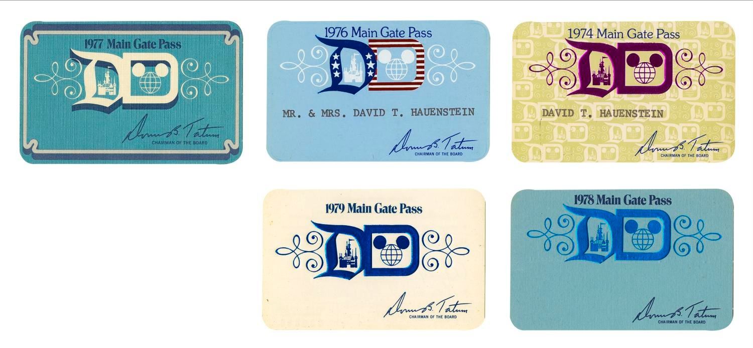 (Disneyland, 1974-79) A collection of 5 Main Gate passes given to employees and select VIPs usable for Disneyland and Walt Disney World for the years 1974, 1976, 1977, 1978, and 1979. The backs are signed by the original owners, and each pass measures 2.25" x 3.5". The collection is in very good condition with minor wear.