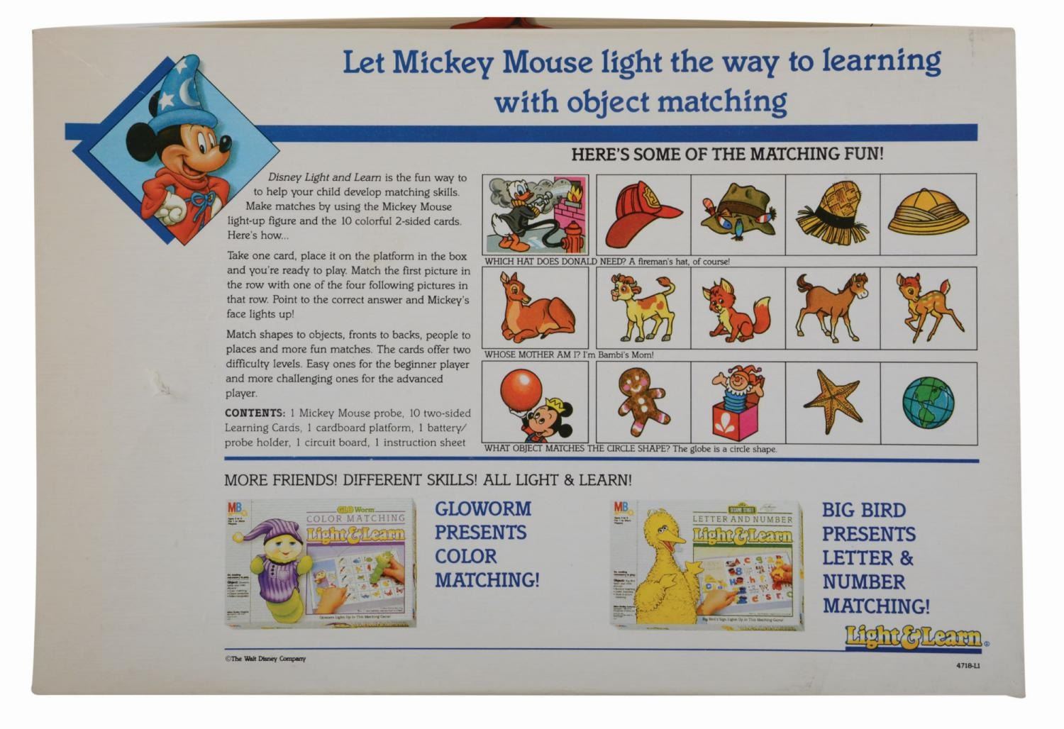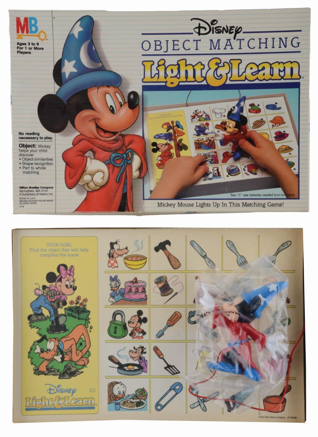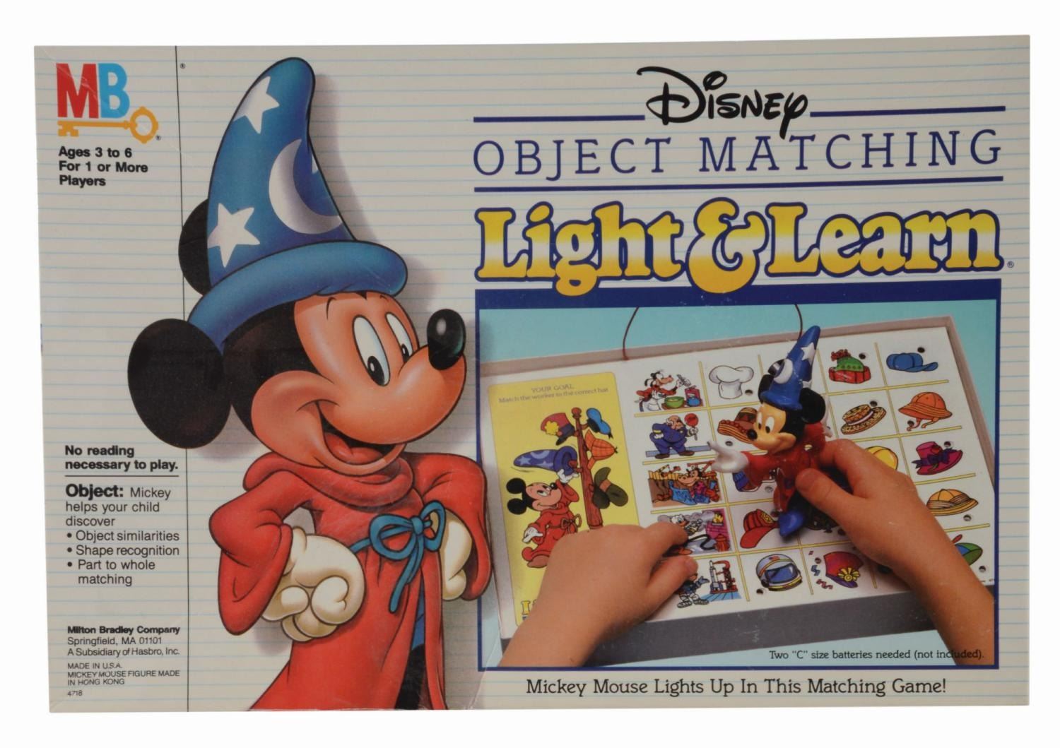 (Milton Bradley, 1980s) A Disney Object Matching Light & Learn game featuring Sorcerer Mickey. The game operates on two "C" sized batteries (not included) and is untested and may require service to operate. Measuring 8.5" x 12.5", the game is complete and in very good unused condition with discoloration from age and creasing to the original box.