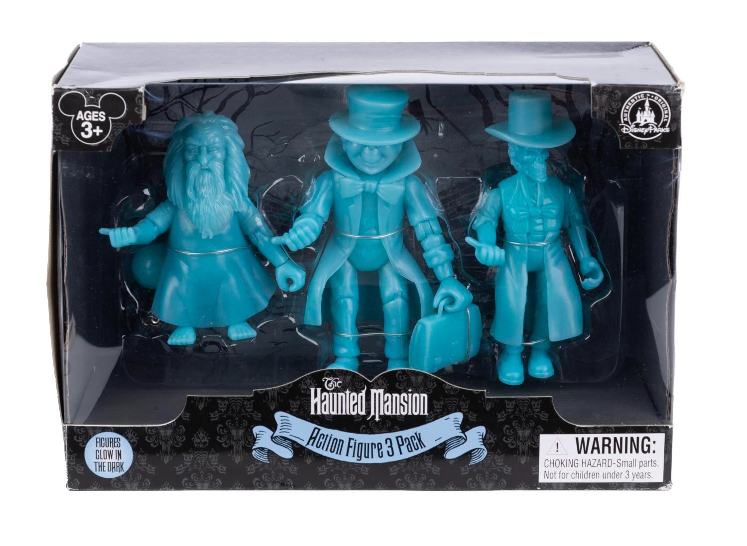 (Disney Parks, 2000s) A Haunted Mansion Action Figure set with three glow-in-the-dark Hitchhiking Ghosts. The set is in fine condition within a 9.5" x 6.5" x 4" box.