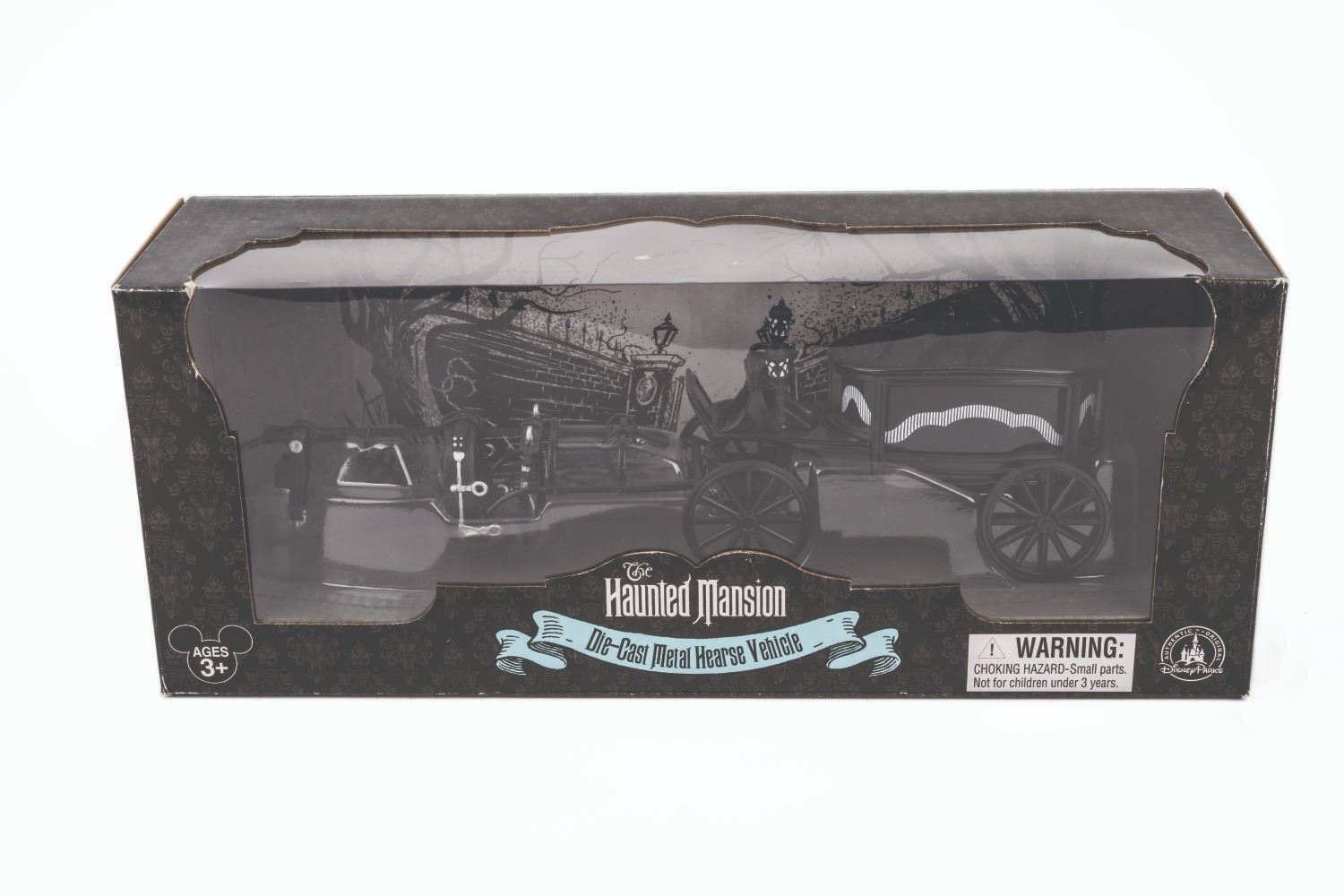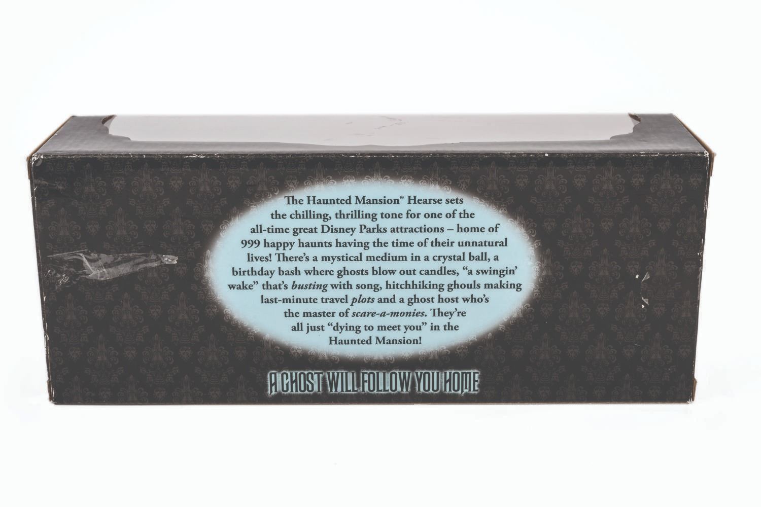 (Disney Parks, 2014) A Haunted Mansion black hearse toy. Measuring 11.25" x 3" tall, the die-cast metal toy is in fine condition, sealed within its 13"x 4" x 5.25" box. The box is in very good condition with light handling wear.