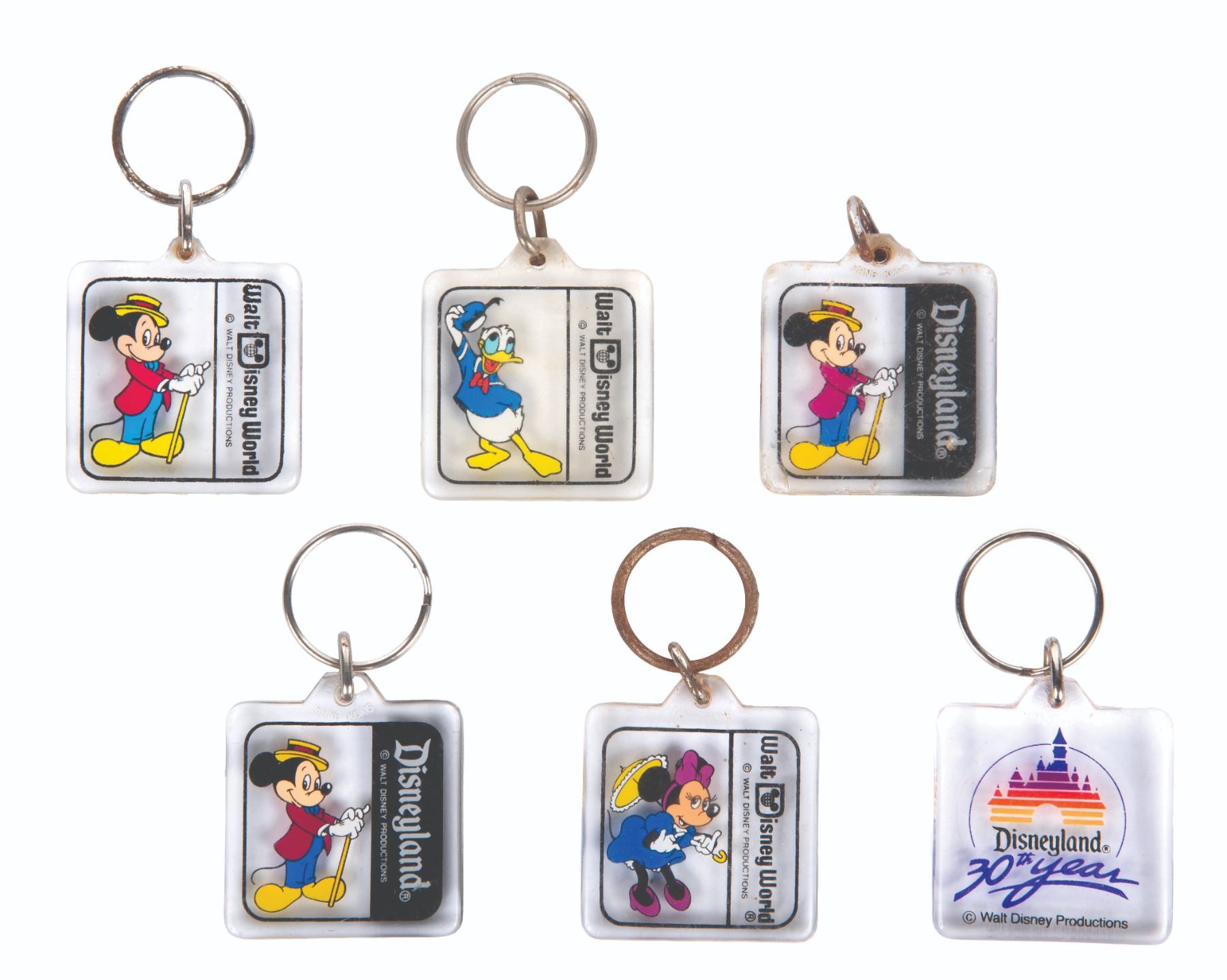 (Disney Parks, 1980s) A collection of 6 keychains from the Disney Parks. Included are three from Walt Disney World and three from Disneyland, including one celebrating the Park's 35th anniversary. Measuring 1.5" x 1.5", the souvenirs are in good condition overall with some oxidation to metal and scuffs and wear to acrylic.