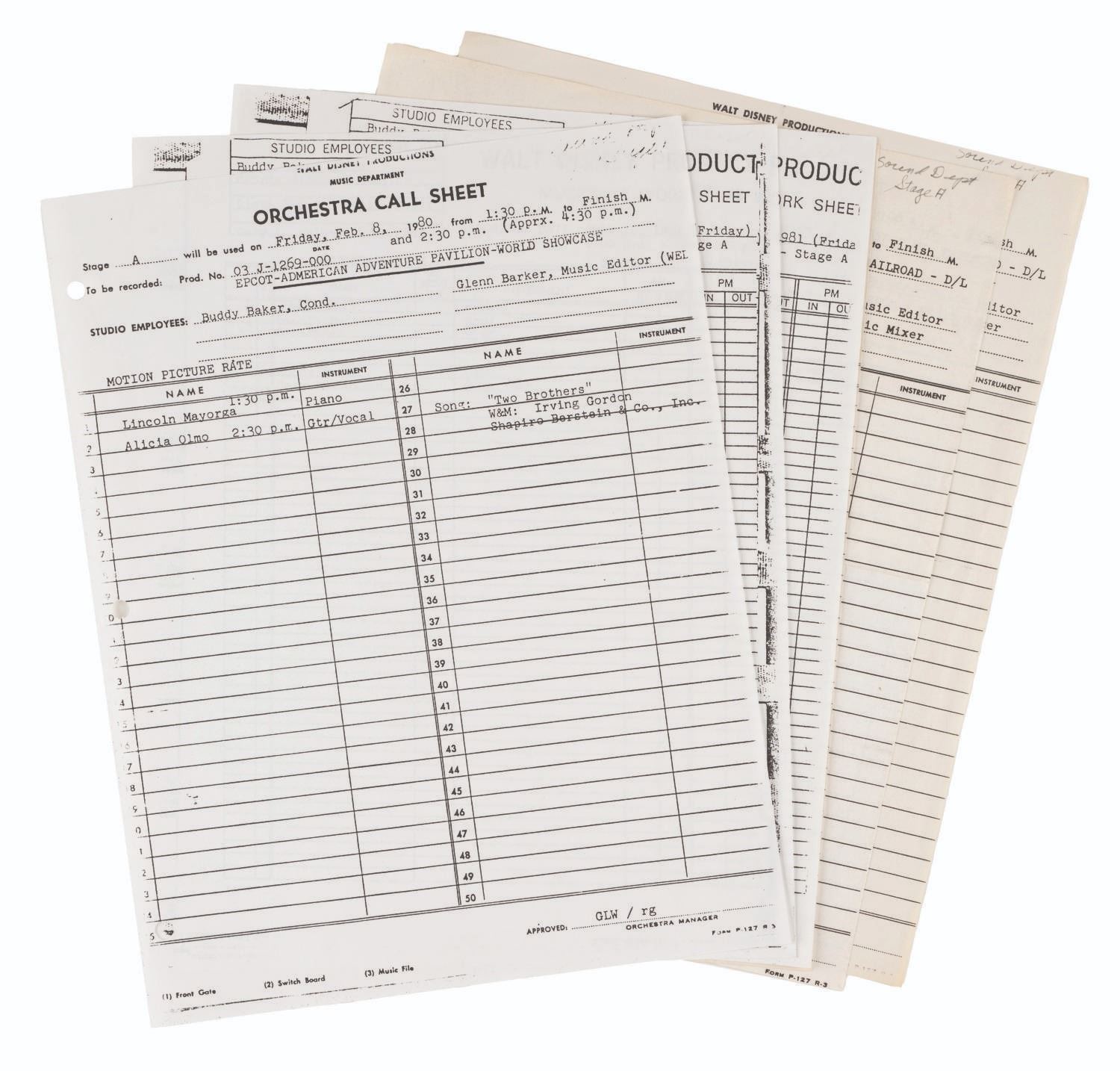 (Disney, 1979-1981) A collection of six musician call sheets, with two duplicates, from Walt Disney Productions Music Department. The call sheets, from four sessions held 1979-1981, are for musicians recording tracks for Big Thunder Mountain Railroad’s mine town area, the “load/unload area of Frontierland,” the song “Two Brothers” for EPCOT’s American Adventure Pavilion, and a fourth unknown session featuring 48 musicians. All sessions featured Disney Legend Buddy Baker conducting and Glenn Barker as the music editor. Measuring 8.5” x 11”, the call sheets are in very good to fine condition with light creases.