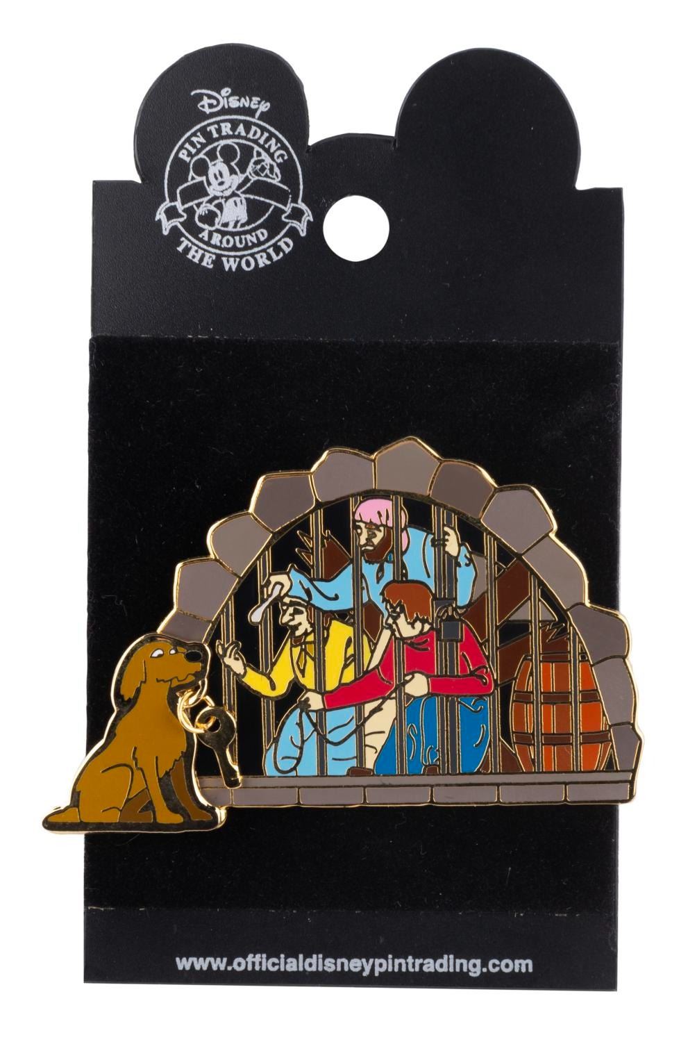 (Disney Parks, 2002) A Pirates of the Caribbean pin featuring the iconic jail scene. The pin-on-pin dog holds a dangle key in its mouth. The pin is in fine condition.