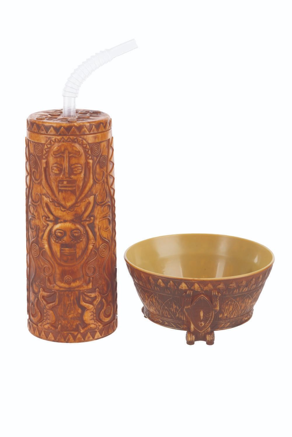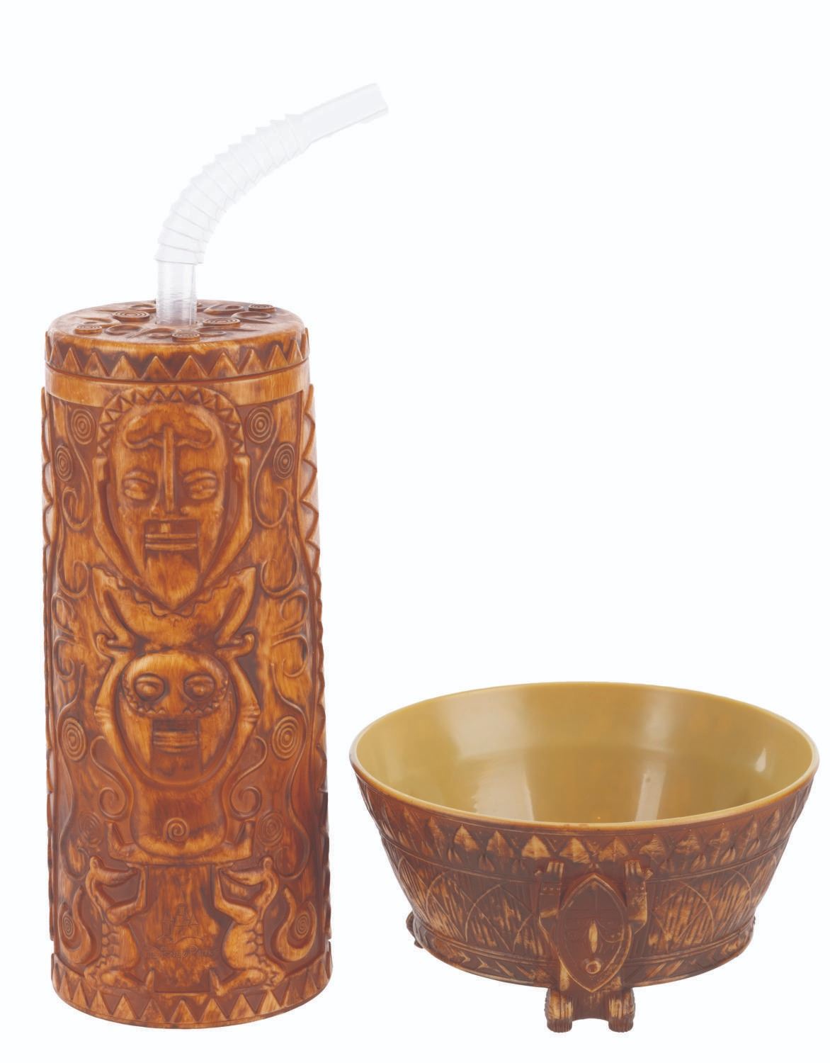 (Disney Parks, 2010s-20s) A souvenir plastic tiki bowl and sipper with a straw, based on Walt Disney's Enchanted Tiki Room. Ranging in size from 4.75 " in diameter and 2.5 " tall to 2.75 " in diameter and 10 " tall, including the straw, the plastic items display in very good condition with light scratches and wear.