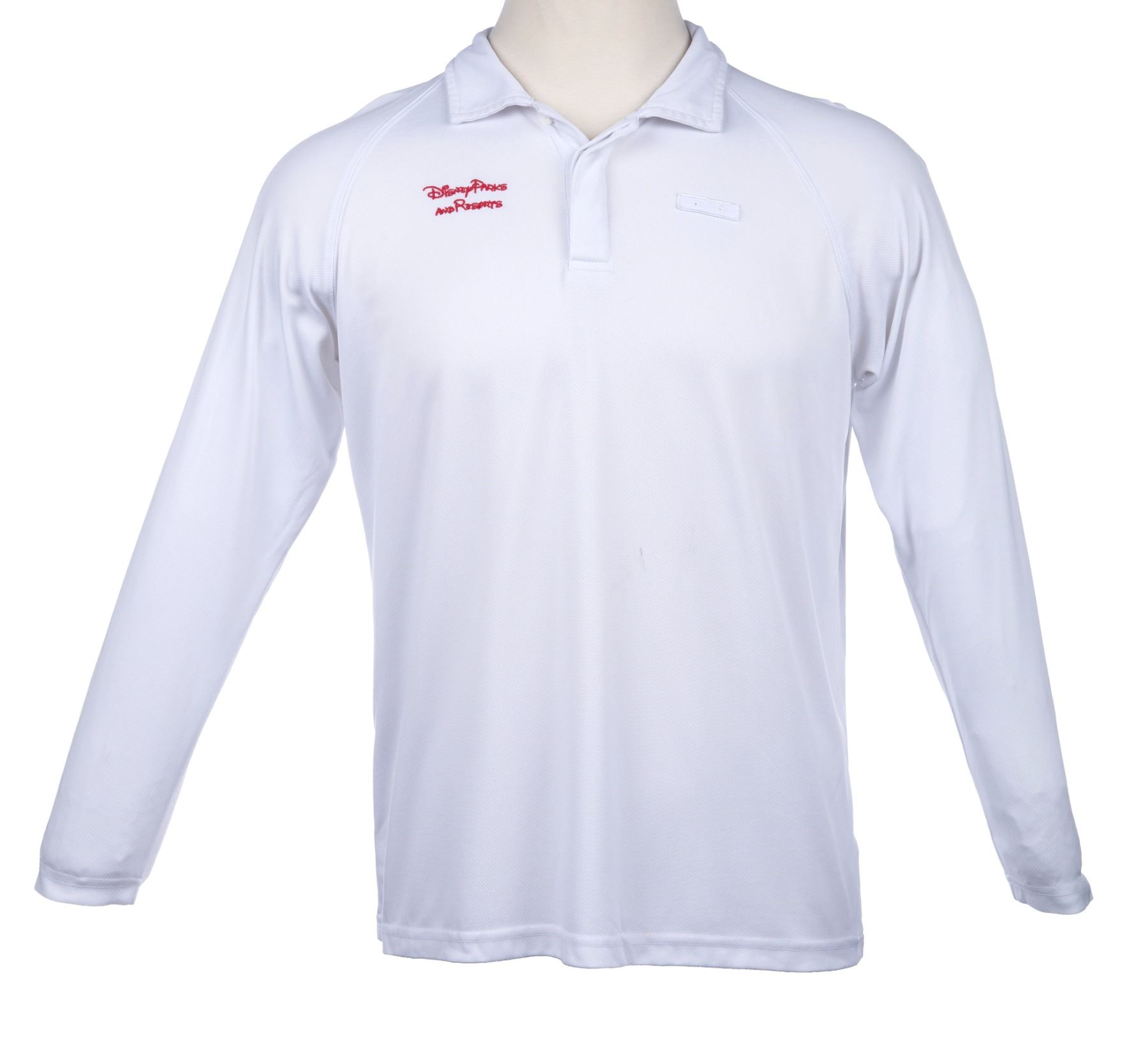 (Walt Disney World, 2000s) A Disney Parks and Resorts Cast Member shirt comprised of breathable cotton and featuring the Disney Parks and Resorts name in red embroidery. Labeled a unisex size M, the shirt is in good condition with stains and spots of discoloration from Resort use.