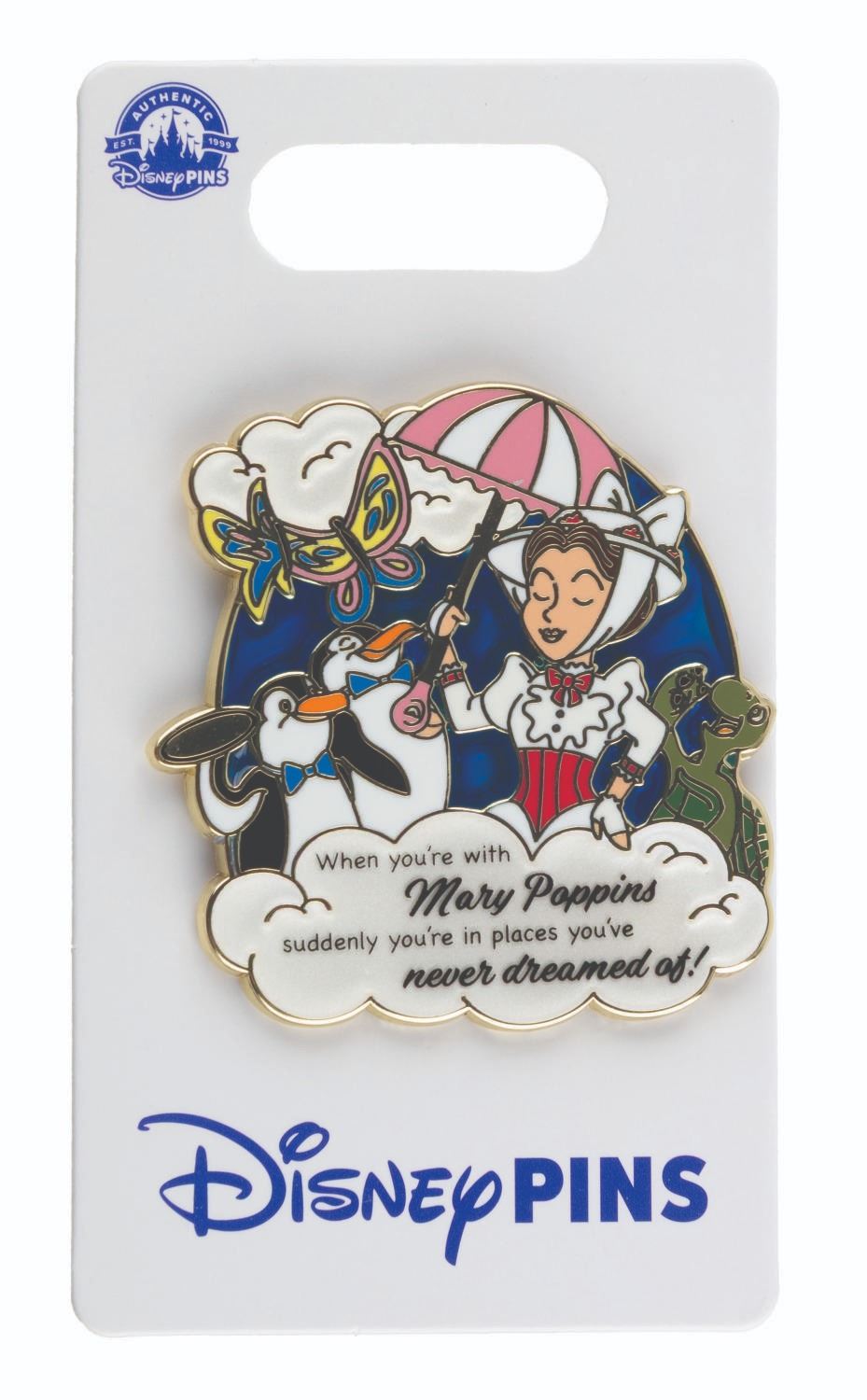 (Disney, 2023) A "Mary Poppins" pin featuring Mary with penguin waiters, with a translucent blue sky. The pin is in fine condition on the original card.