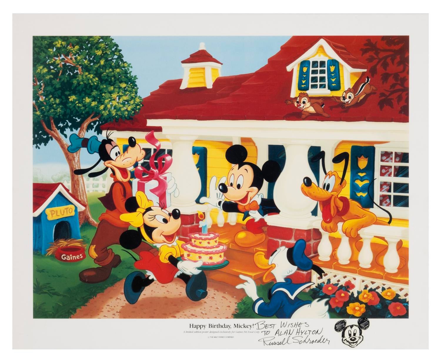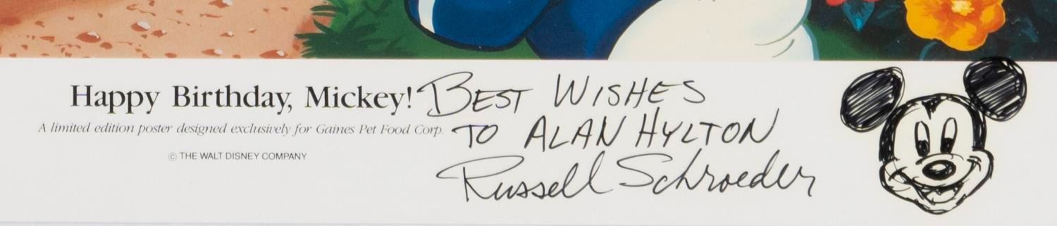 (Disney, 1990s) A "Happy Birthday, Mickey!" poster designed exclusively for Gaines Pet Food Corp., hand-signed with a dedication by Disney artist Russell Schroeder. Measuring 16" x 20", this limited edition poster displays in fine condition with very light edge wear to the corners.