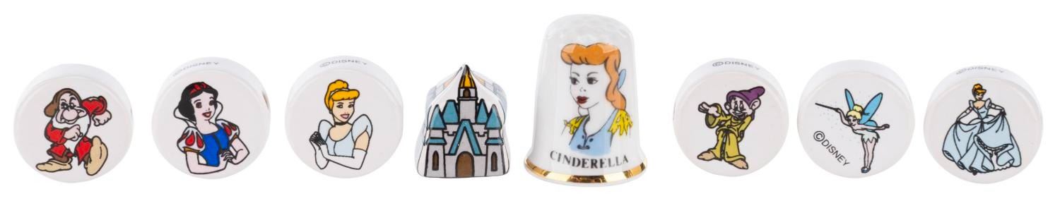 (Disney, 1980s-90s) A Cinderella Birchcroft thimble and a collection of seven beads, including Cinderella, Snow White, Dopey, Grumpy, Tinker Bell, and Sleeping Beauty Castle. Measuring 0.75" round to 1" x 1.25" tall, the collection is in fine condition.