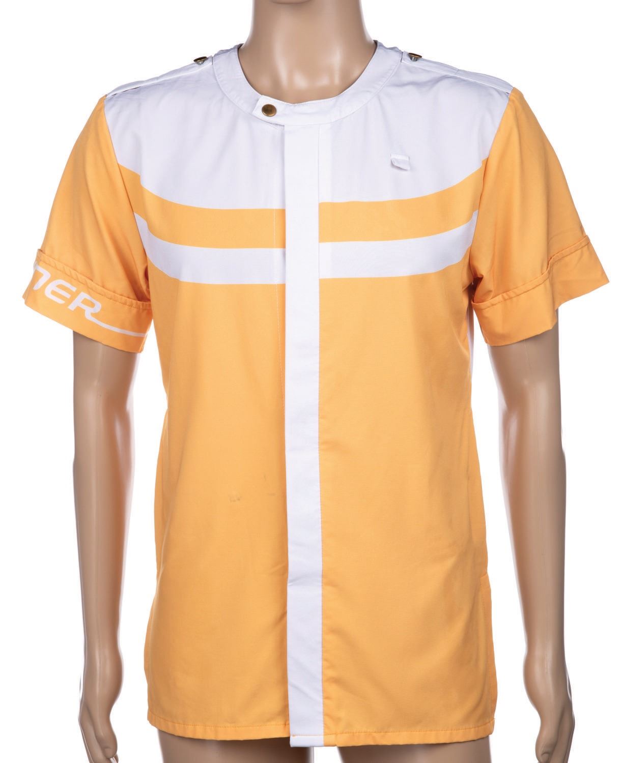 (Walt Disney World, 2020s) A costume shirt worn by Cast Members and operators of the Disney Skyliner at Walt Disney World. The breathable yellow and white striped shirt features the attraction name screen printed on one sleeve. Measuring a Male Size S, the shirt exhibits some wear and few small stains and mild discoloration from Park use.
