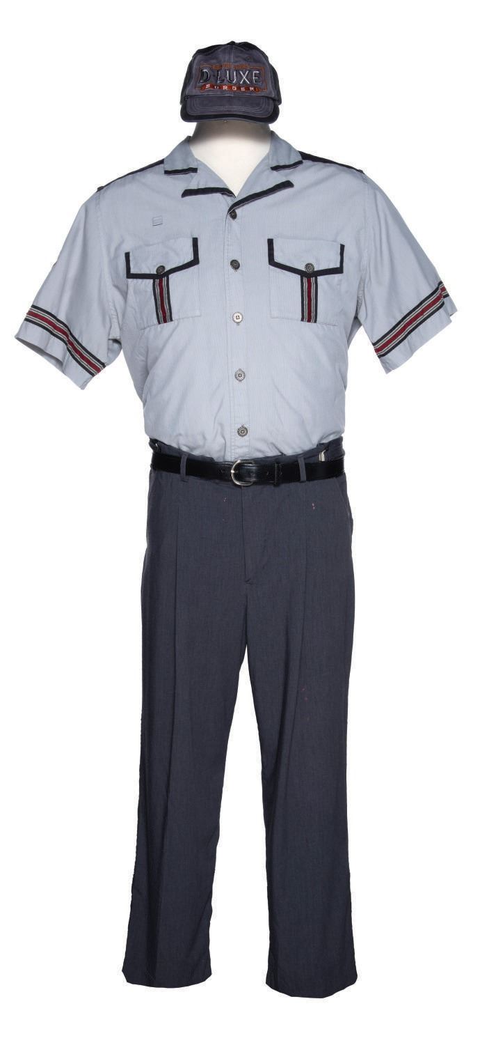 (Walt Disney World) A costume worn by Hosts and Hostesses of Disney Springs D-Luxe Burger at Walt Disney World Resort. The shirt measures a Size XL, the pants are a Size M, and the belt and hat are "one size fits all." The pieces are in good Resort-used condition, with pilling, stains, and loose threads from use.