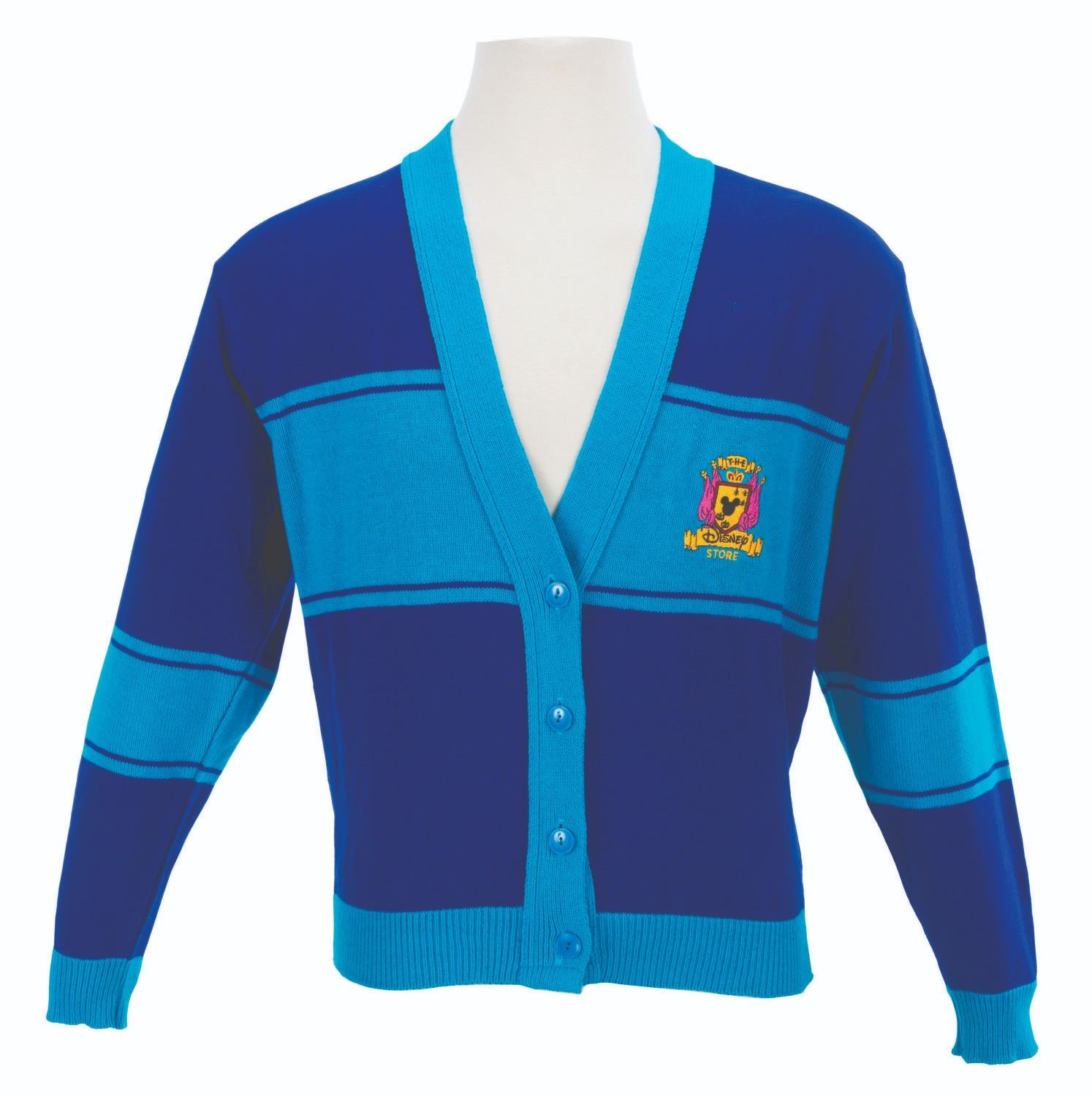 (Disney, 1990s-2000s) A blue cardigan sweater worn by Cast Members working at the Disney Store. Labeled a size L, the sweater is in very good condition with light pilling and wear.