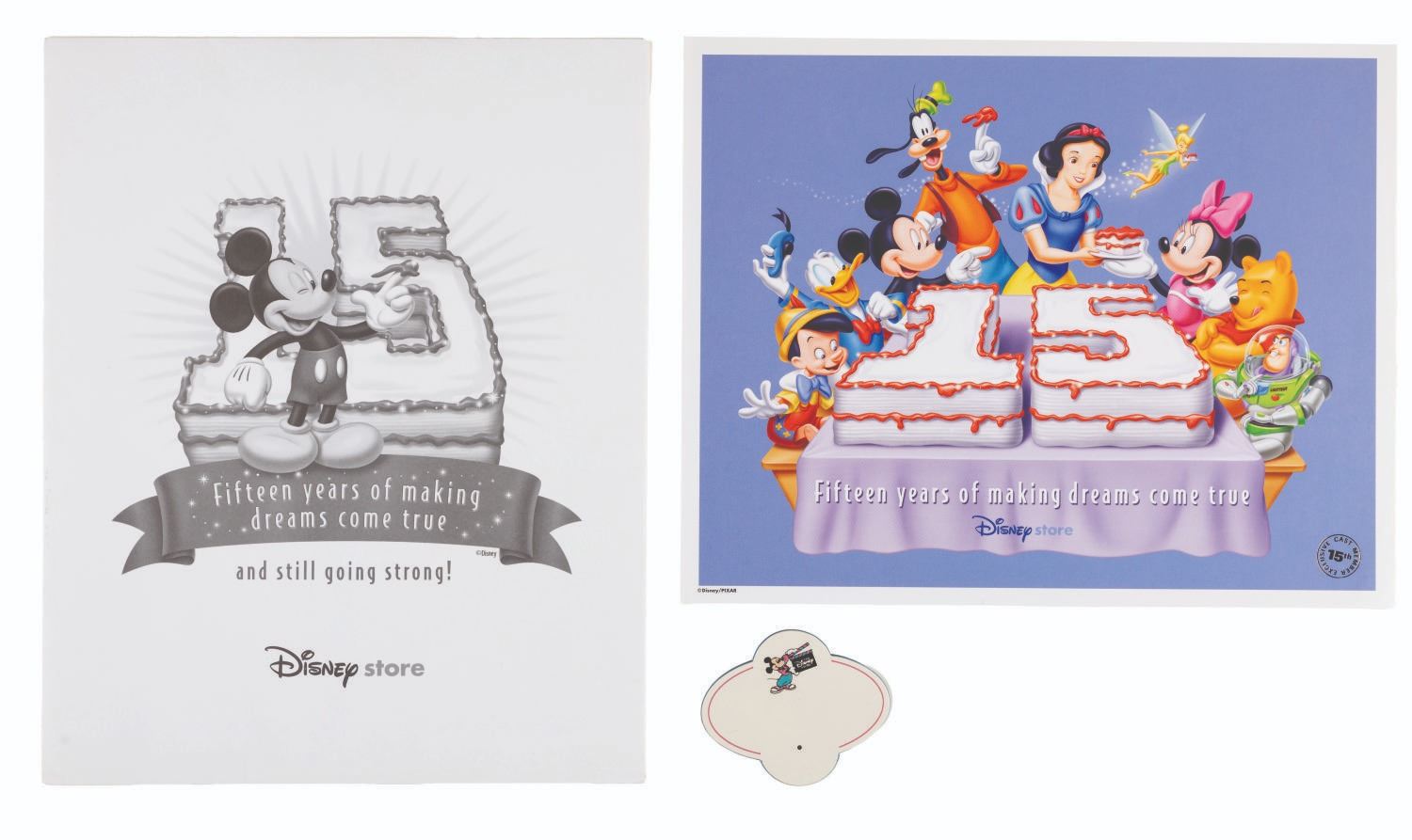 (Disney Store, 2002) An unused Cast Member name tag and lithograph commemorating the 15th anniversary of the Disney Store. Measuring between 2.5"x2.25" and 8.5"x10.5", the pieces are in very good condition with light handling wear, and scuffing.