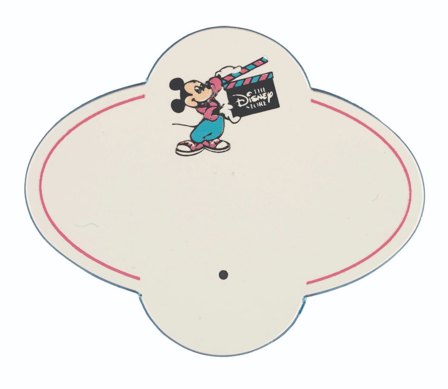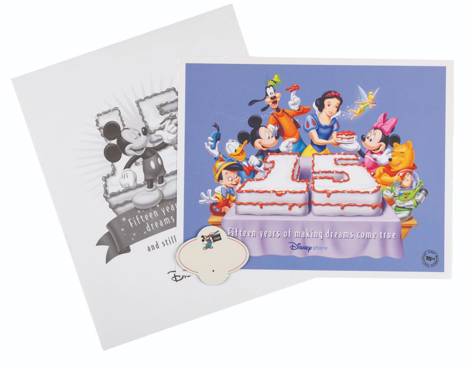 (Disney Store, 2002) An unused Cast Member namebadge and lithograph commemorating the 15th anniversary of the Disney Store. Measuring between 2.5" x 2.25" and 8.5" x 10.5", the pieces are in very good condition with light handling wear, and scuffing.