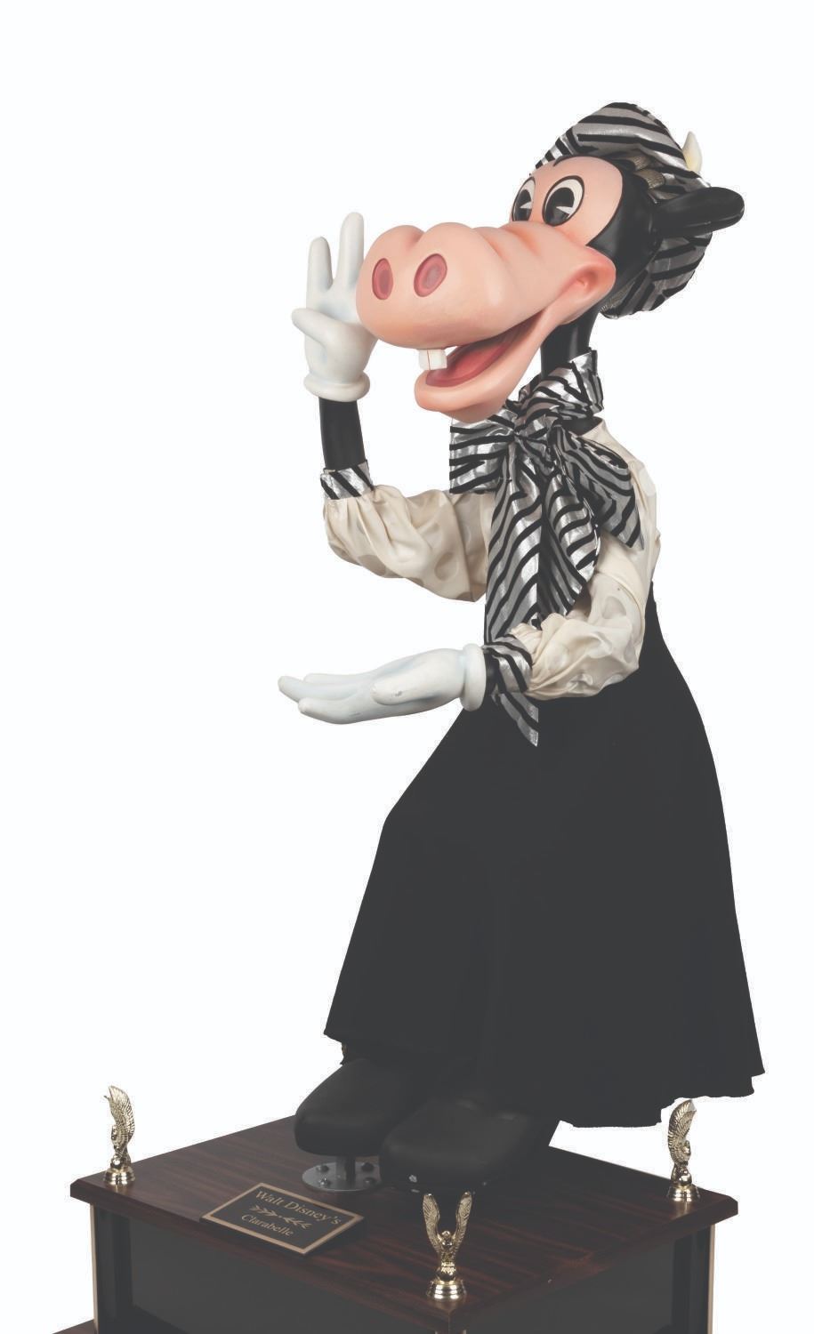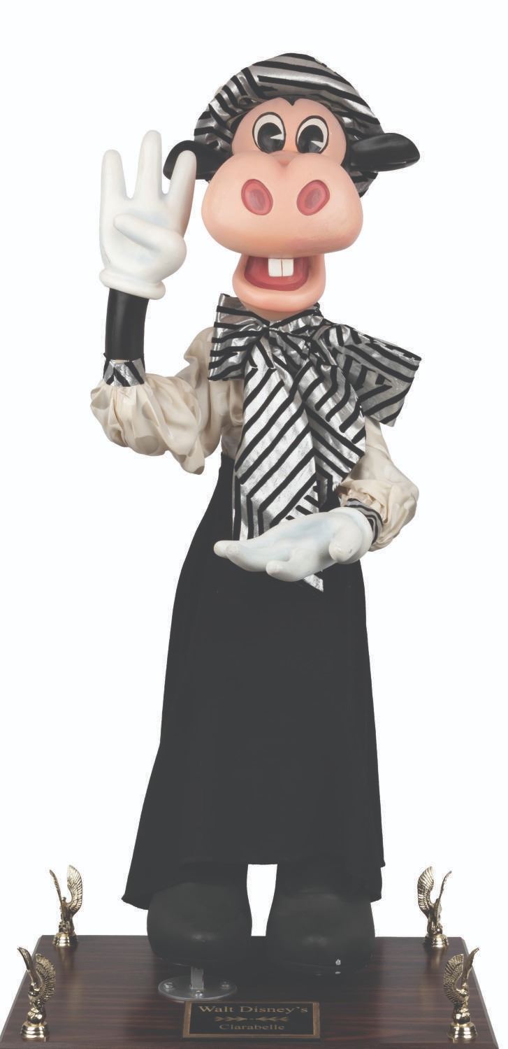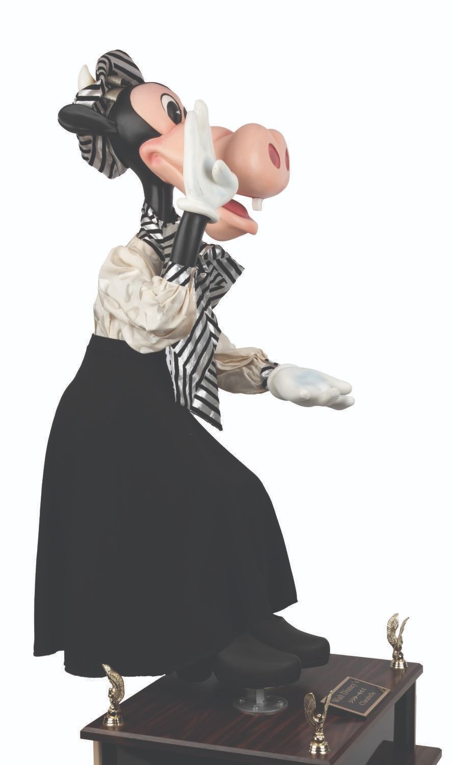 (Disney, 1987-2000s) An original Disney Store Clarabelle Cow display figure with a cloth outfit. Measuring 13” x 20” x 36” tall, the figure stands on a 16” x 20” x 6” tall custom display for a full height of 42”. Clarabelle displays in very good condition with small scuffs and scratches, cracks in the paint on her left hand, and small spots of paint loss to her left foot.