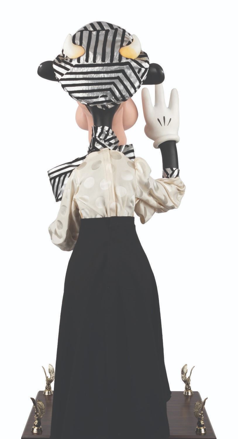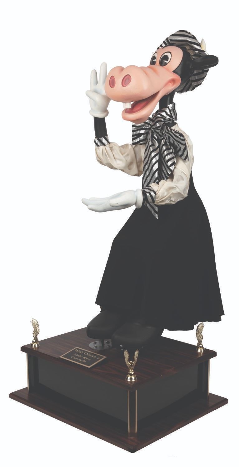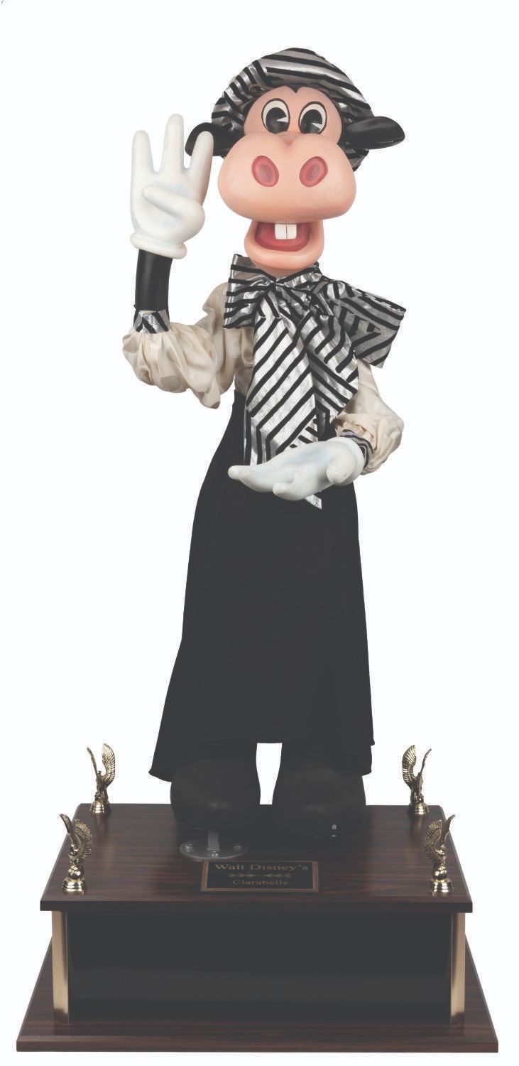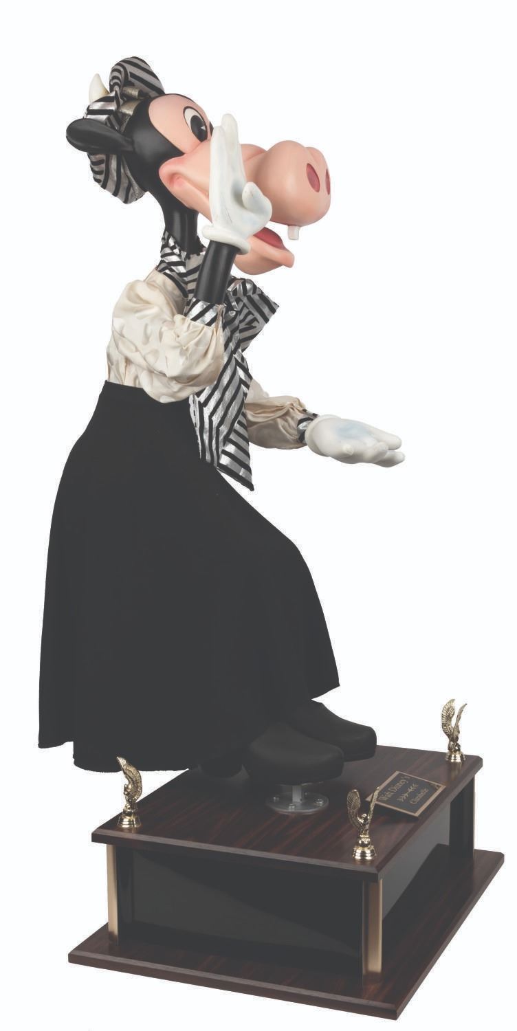 (Disney, 1987-2000s) An original Disney Store Clarabelle Cow display figure with a cloth outfit. Measuring 13” x 20” x 36” tall, the figure stands on a 16” x 20” x 6” tall custom display for a full height of 42”. Clarabelle displays in very good condition with small scuffs and scratches, cracks in the paint on her left hand, and small spots of paint loss to her left foot.