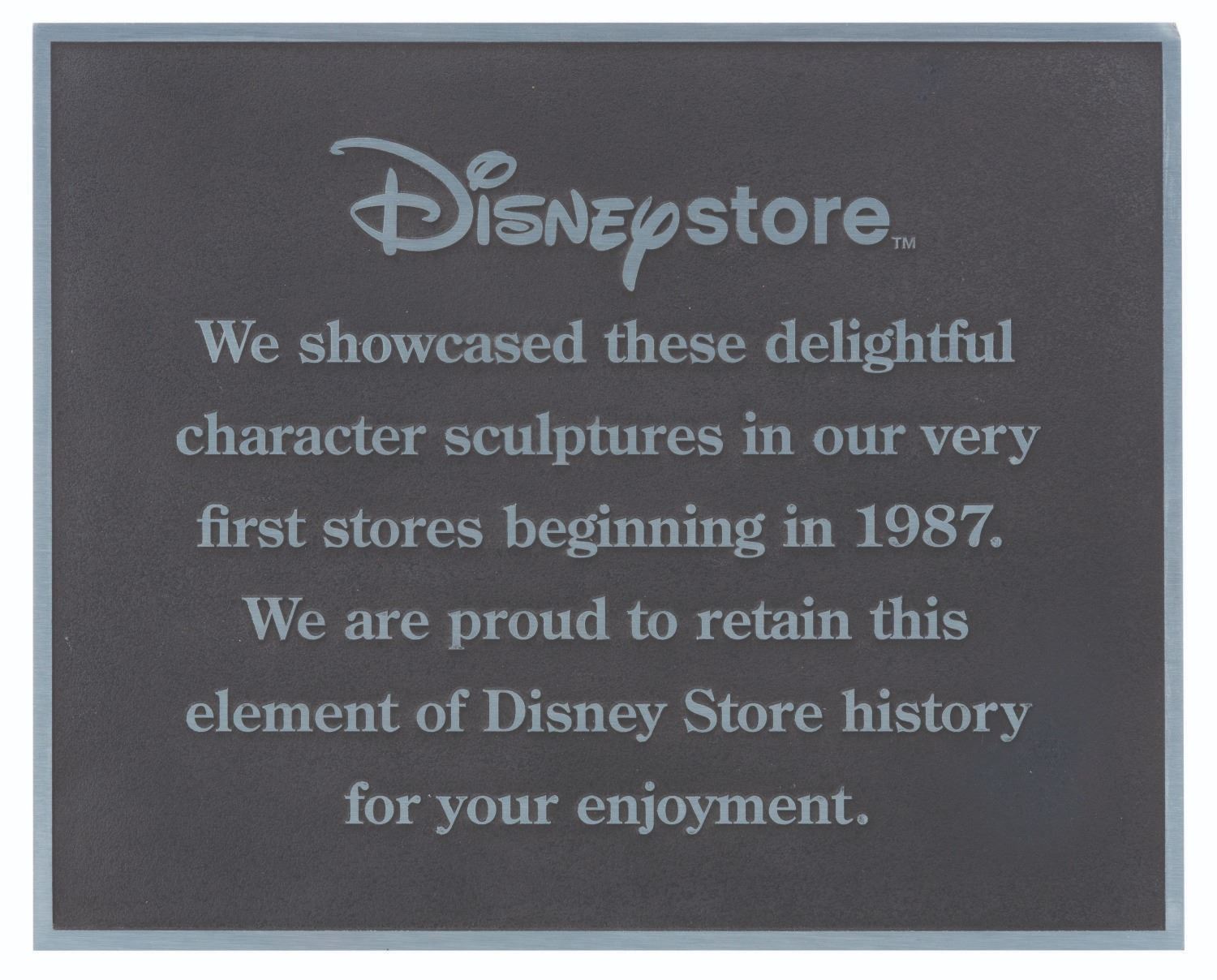 (Disney, 2000s) A metal sign commemorating the original Disney character display figures that remain an essential part of the Disney Store experience. A major presence in malls from the late 1980s through the early 2000s, only 21 Disney Stores remain in 2026. Measuring 9.5" x 11.75", the sign is in very good condition with light scuffs, wear, and warping at the top right corner from store display.