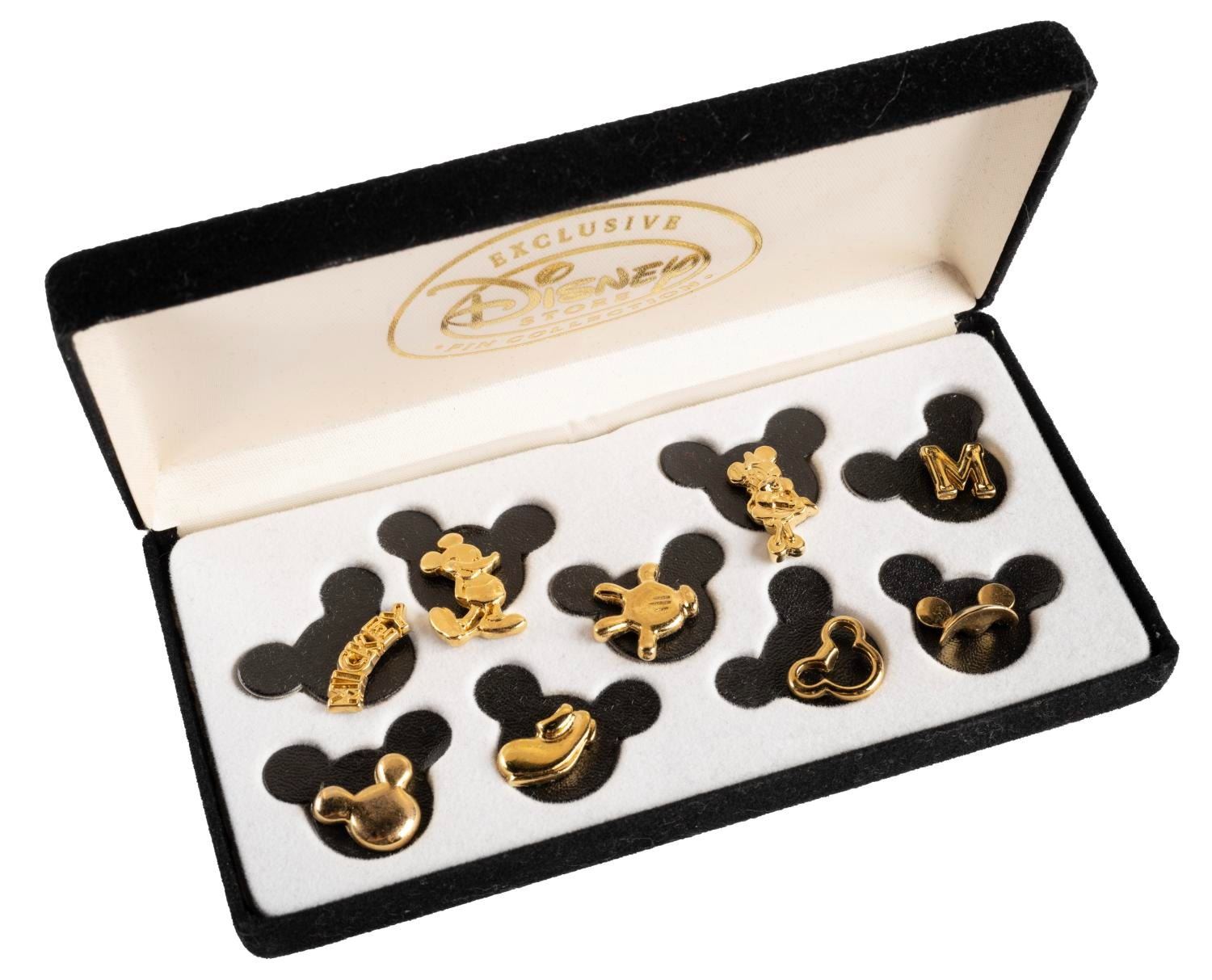 (The Disney Store) A Disney Store Exclusive Mickey Mouse Pin Collection. This nine pin set is themed after Mickey Mouse and features shapes like a glove, shoe, "M," and the characters of Mickey and Minnie. Measuring approximately .75" to 1" in diameter, each pin is in fine condition in its original jewelry case box.